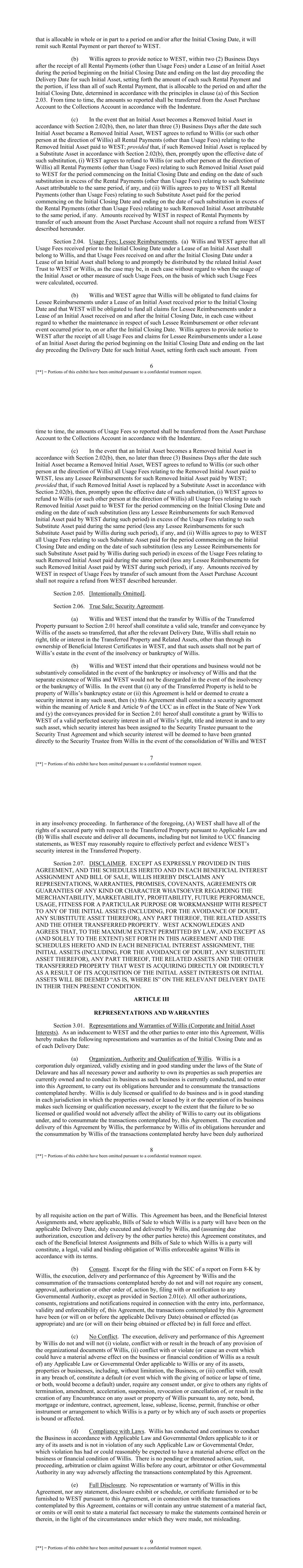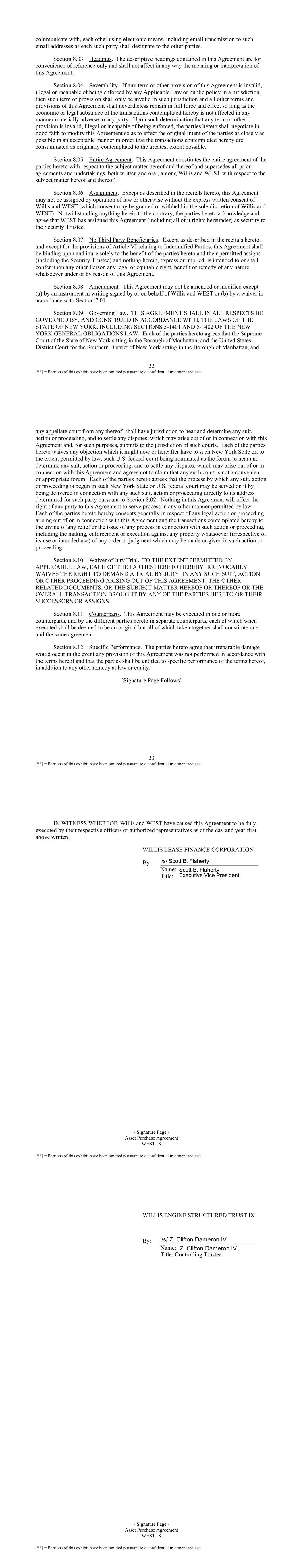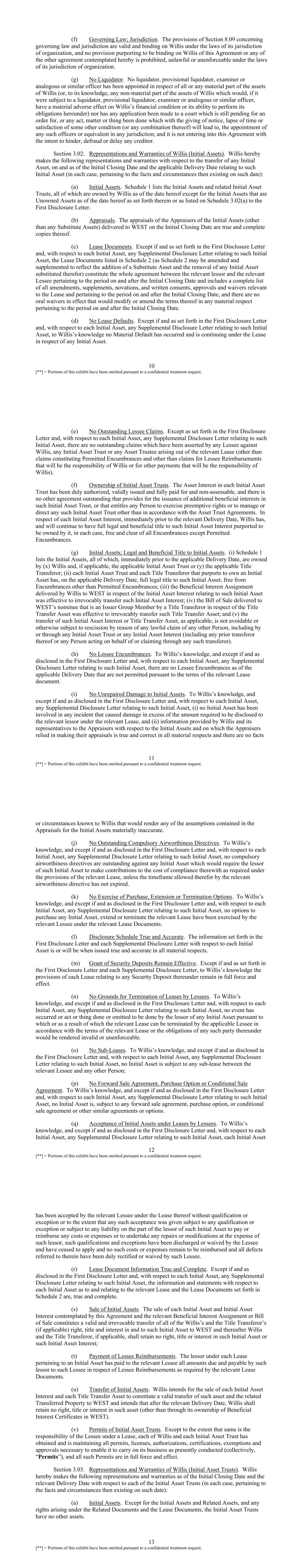 10 [**] = Portions of this exhibit have been omitted pursuant to a confidential treatment request. (f) Governing Law; Jurisdiction. The provisions of Section 8.09 concerning governing law and jurisdiction are valid and binding on Willis under the laws of its jurisdiction of organization, and no provision purporting to be binding on Willis of this Agreement or any of the other agreement contemplated hereby is prohibited, unlawful or unenforceable under the laws of its jurisdiction of organization. (g) No Liquidator. No liquidator, provisional liquidator, examiner or analogous or similar officer has been appointed in respect of all or any material part of the assets of Willis (or, to its knowledge, any non-material part of the assets of Willis which would, if it were subject to a liquidator, provisional liquidator, examiner or analogous or similar officer, have a material adverse effect on Willis’s financial condition or its ability to perform its obligations hereunder) nor has any application been made to a court which is still pending for an order for, or any act, matter or thing been done which with the giving of notice, lapse of time or satisfaction of some other condition (or any combination thereof) will lead to, the appointment of any such officers or equivalent in any jurisdiction; and it is not entering into this Agreement with the intent to hinder, defraud or delay any creditor. Section 3.02. Representations and Warranties of Willis (Initial Assets). Willis hereby makes the following representations and warranties with respect to the transfer of any Initial Asset, on and as of the Initial Closing Date and the applicable Delivery Date relating to such Initial Asset (in each case, pertaining to the facts and circumstances then existing on such date): (a) Initial Assets. Schedule 1 lists the Initial Assets and related Initial Asset Trusts, all of which are owned by Willis as of the date hereof except for the Initial Assets that are Unowned Assets as of the date hereof as set forth therein or as listed on Schedule 3.02(a) to the First Disclosure Letter. (b) Appraisals. The appraisals of the Appraisers of the Initial Assets (other than any Substitute Assets) delivered to WEST on the Initial Closing Date are true and complete copies thereof. (c) Lease Documents. Except if and as set forth in the First Disclosure Letter and, with respect to each Initial Asset, any Supplemental Disclosure Letter relating to such Initial Asset, the Lease Documents listed in Schedule 2 (as Schedule 2 may be amended and supplemented to reflect the addition of a Substitute Asset and the removal of any Initial Asset substituted therefor) constitute the whole agreement between the relevant lessor and the relevant Lessee pertaining to the period on and after the Initial Closing Date and includes a complete list of all amendments, supplements, novations, and written consents, approvals and waivers relevant to the Lease and pertaining to the period on and after the Initial Closing Date, and there are no oral waivers in effect that would modify or amend the terms thereof in any material respect pertaining to the period on and after the Initial Closing Date. (d) No Lease Defaults. Except if and as set forth in the First Disclosure Letter and, with respect to each Initial Asset, any Supplemental Disclosure Letter relating to such Initial Asset, to Willis’s knowledge no Material Default has occurred and is continuing under the Lease in respect of any Initial Asset. 11 [**] = Portions of this exhibit have been omitted pursuant to a confidential treatment request. (e) No Outstanding Lessee Claims. Except as set forth in the First Disclosure Letter and, with respect to each Initial Asset, any Supplemental Disclosure Letter relating to such Initial Asset, there are no outstanding claims which have been asserted by any Lessee against Willis, any Initial Asset Trust or any Asset Trustee arising out of the relevant Lease (other than claims constituting Permitted Encumbrances and other than claims for Lessee Reimbursements that will be the responsibility of Willis or for other payments that will be the responsibility of Willis). (f) Ownership of Initial Asset Trusts. The Asset Interest in each Initial Asset Trust has been duly authorized, validly issued and fully paid for and non-assessable, and there is no other agreement outstanding that provides for the issuance of additional beneficial interests in such Initial Asset Trust, or that entitles any Person to exercise preemptive rights or to manage or direct any such Initial Asset Trust other than in accordance with the Asset Trust Agreements. In respect of each Initial Asset Interest, immediately prior to the relevant Delivery Date, Willis has, and will continue to have full legal and beneficial title to such Initial Asset Interest purported to be owned by it, in each case, free and clear of all Encumbrances except Permitted Encumbrances. (g) Initial Assets; Legal and Beneficial Title to Initial Assets. (i) Schedule 1 lists the Initial Assets, all of which, immediately prior to the applicable Delivery Date, are owned by (x) Willis and, if applicable, the applicable Initial Asset Trust or (y) the applicable Title Transferor; (ii) each Initial Asset Trust and each Title Transferor that purports to own an Initial Asset has, on the applicable Delivery Date, full legal title to such Initial Asset, free from Encumbrances other than Permitted Encumbrances; (iii) the Beneficial Interest Assignment delivered by Willis to WEST in respect of the Initial Asset Interest relating to such Initial Asset was effective to irrevocably transfer such Initial Asset Interest; (iv) the Bill of Sale delivered to WEST’s nominee that is an Issuer Group Member by a Title Transferor in respect of the Title Transfer Asset was effective to irrevocably transfer such Title Transfer Asset; and (v) the transfer of such Initial Asset Interest or Title Transfer Asset, as applicable, is not avoidable or ot