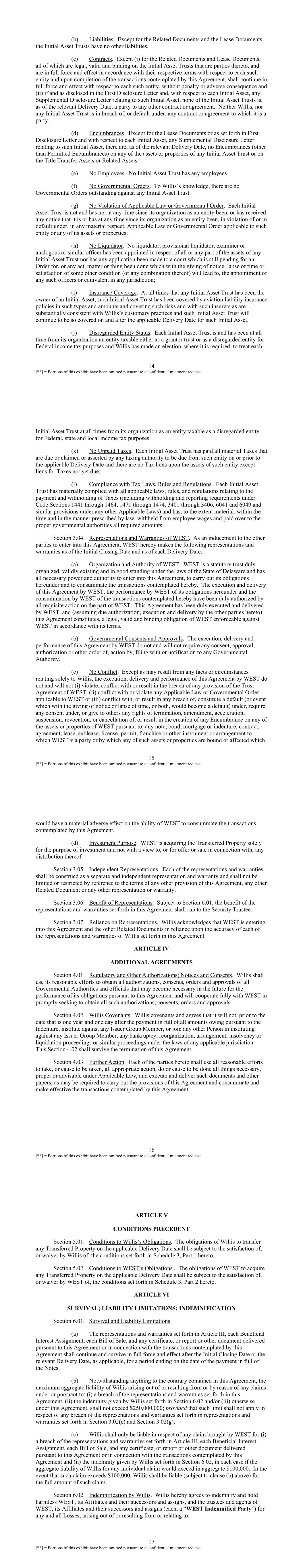 14 [**] = Portions of this exhibit have been omitted pursuant to a confidential treatment request. (b) Liabilities. Except for the Related Documents and the Lease Documents, the Initial Asset Trusts have no other liabilities. (c) Contracts. Except (i) for the Related Documents and Lease Documents, all of which are legal, valid and binding on the Initial Asset Trusts that are parties thereto, and are in full force and effect in accordance with their respective terms with respect to each such entity and upon completion of the transactions contemplated by this Agreement, shall continue in full force and effect with respect to each such entity, without penalty or adverse consequence and (ii) if and as disclosed in the First Disclosure Letter and, with respect to each Initial Asset, any Supplemental Disclosure Letter relating to such Initial Asset, none of the Initial Asset Trusts is, as of the relevant Delivery Date, a party to any other contract or agreement. Neither Willis, nor any Initial Asset Trust is in breach of, or default under, any contract or agreement to which it is a party. (d) Encumbrances. Except for the Lease Documents or as set forth in First Disclosure Letter and with respect to each Initial Asset, any Supplemental Disclosure Letter relating to such Initial Asset, there are, as of the relevant Delivery Date, no Encumbrances (other than Permitted Encumbrances) on any of the assets or properties of any Initial Asset Trust or on the Title Transfer Assets or Related Assets. (e) No Employees. No Initial Asset Trust has any employees. (f) No Governmental Orders. To Willis’s knowledge, there are no Governmental Orders outstanding against any Initial Asset Trust. (g) No Violation of Applicable Law or Governmental Order. Each Initial Asset Trust is not and has not at any time since its organization as an entity been, or has received any notice that it is or has at any time since its organization as an entity been, in violation of or in default under, in any material respect, Applicable Law or Governmental Order applicable to such entity or any of its assets or properties; (h) No Liquidator. No liquidator, provisional liquidator, examiner or analogous or similar officer has been appointed in respect of all or any part of the assets of any Initial Asset Trust nor has any application been made to a court which is still pending for an Order for, or any act, matter or thing been done which with the giving of notice, lapse of time or satisfaction of some other condition (or any combination thereof) will lead to, the appointment of any such officers or equivalent in any jurisdiction; (i) Insurance Coverage. At all times that any Initial Asset Trust has been the owner of an Initial Asset, such Initial Asset Trust has been covered by aviation liability insurance policies in such types and amounts and covering such risks and with such insurers as are substantially consistent with Willis’s customary practices and such Initial Asset Trust will continue to be so covered on and after the applicable Delivery Date for such Initial Asset. (j) Disregarded Entity Status. Each Initial Asset Trust is and has been at all time from its organization an entity taxable either as a grantor trust or as a disregarded entity for Federal income tax purposes and Willis has made an election, where it is required, to treat each 15 [**] = Portions of this exhibit have been omitted pursuant to a confidential treatment request. Initial Asset Trust at all times from its organization as an entity taxable as a disregarded entity for Federal, state and local income tax purposes. (k) No Unpaid Taxes. Each Initial Asset Trust has paid all material Taxes that are due or claimed or asserted by any taxing authority to be due from such entity on or prior to the applicable Delivery Date and there are no Tax liens upon the assets of such entity except liens for Taxes not yet due; (l) Compliance with Tax Laws, Rules and Regulations. Each Initial Asset Trust has materially complied with all applicable laws, rules, and regulations relating to the payment and withholding of Taxes (including withholding and reporting requirements under Code Sections 1441 through 1464, 1471 through 1474, 3401 through 3406, 6041 and 6049 and similar provisions under any other Applicable Laws) and has, to the extent material, within the time and in the manner prescribed by law, withheld from employee wages and paid over to the proper governmental authorities all required amounts. Section 3.04. Representations and Warranties of WEST. As an inducement to the other parties to enter into this Agreement, WEST hereby makes the following representations and warranties as of the Initial Closing Date and as of each Delivery Date: (a) Organization and Authority of WEST. WEST is a statutory trust duly organized, validly existing and in good standing under the laws of the State of Delaware and has all necessary power and authority to enter into this Agreement, to carry out its obligations hereunder and to consummate the transactions contemplated hereby. The execution and delivery of this Agreement by WEST, the performance by WEST of its obligations hereunder and the consummation by WEST of the transactions contemplated hereby have been duly authorized by all requisite action on the part of WEST. This Agreement has been duly executed and delivered by WEST, and (assuming due authorization, execution and delivery by the other parties hereto) this Agreement constitutes, a legal, valid and binding obligation of WEST enforceable against WEST in accordance with its terms. (b) Governmental Consents and Approvals. The execution, delivery and performance of this Agreement by WEST do not and will not require any consent, approval, authorization or other order of, action by, filing with or notification to any Governmental Authority. (c) No Conflict. Except as may result from any facts or circumstances relating solely to Willis, the execution, delivery and performance of this