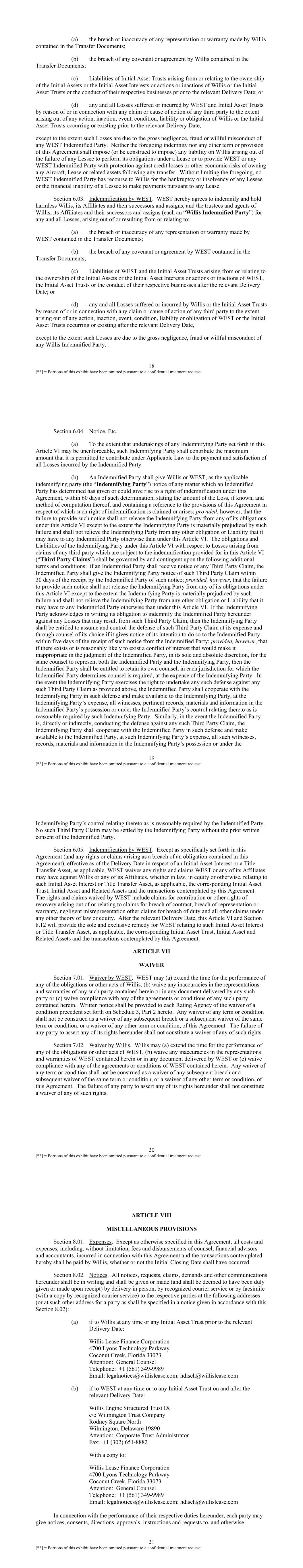 18 [**] = Portions of this exhibit have been omitted pursuant to a confidential treatment request. (a) the breach or inaccuracy of any representation or warranty made by Willis contained in the Transfer Documents; (b) the breach of any covenant or agreement by Willis contained in the Transfer Documents; (c) Liabilities of Initial Asset Trusts arising from or relating to the ownership of the Initial Assets or the Initial Asset Interests or actions or inactions of Willis or the Initial Asset Trusts or the conduct of their respective businesses prior to the relevant Delivery Date; or (d) any and all Losses suffered or incurred by WEST and Initial Asset Trusts by reason of or in connection with any claim or cause of action of any third party to the extent arising out of any action, inaction, event, condition, liability or obligation of Willis or the Initial Asset Trusts occurring or existing prior to the relevant Delivery Date, except to the extent such Losses are due to the gross negligence, fraud or willful misconduct of any WEST Indemnified Party. Neither the foregoing indemnity nor any other term or provision of this Agreement shall impose (or be construed to impose) any liability on Willis arising out of the failure of any Lessee to perform its obligations under a Lease or to provide WEST or any WEST Indemnified Party with protection against credit losses or other economic risks of owning any Aircraft, Lease or related assets following any transfer. Without limiting the foregoing, no WEST Indemnified Party has recourse to Willis for the bankruptcy or insolvency of any Lessee or the financial inability of a Lessee to make payments pursuant to any Lease. Section 6.03. Indemnification by WEST. WEST hereby agrees to indemnify and hold harmless Willis, its Affiliates and their successors and assigns, and the trustees and agents of Willis, its Affiliates and their successors and assigns (each an “Willis Indemnified Party”) for any and all Losses, arising out of or resulting from or relating to: (a) the breach or inaccuracy of any representation or warranty made by WEST contained in the Transfer Documents; (b) the breach of any covenant or agreement by WEST contained in the Transfer Documents; (c) Liabilities of WEST and the Initial Asset Trusts arising from or relating to the ownership of the Initial Assets or the Initial Asset Interests or actions or inactions of WEST, the Initial Asset Trusts or the conduct of their respective businesses after the relevant Delivery Date; or (d) any and all Losses suffered or incurred by Willis or the Initial Asset Trusts by reason of or in connection with any claim or cause of action of any third party to the extent arising out of any action, inaction, event, condition, liability or obligation of WEST or the Initial Asset Trusts occurring or existing after the relevant Delivery Date, except to the extent such Losses are due to the gross negligence, fraud or willful misconduct of any Willis Indemnified Party. 19 [**] = Portions of this exhibit have been omitted pursuant to a confidential treatment request. Section 6.04. Notice, Etc. (a) To the extent that undertakings of any Indemnifying Party set forth in this Article VI may be unenforceable, such Indemnifying Party shall contribute the maximum amount that it is permitted to contribute under Applicable Law to the payment and satisfaction of all Losses incurred by the Indemnified Party. (b) An Indemnified Party shall give Willis or WEST, as the applicable indemnifying party (the “Indemnifying Party”) notice of any matter which an Indemnified Party has determined has given or could give rise to a right of indemnification under this Agreement, within 60 days of such determination, stating the amount of the Loss, if known, and method of computation thereof, and containing a reference to the provisions of this Agreement in respect of which such right of indemnification is claimed or arises; provided, however, that the failure to provide such notice shall not release the Indemnifying Party from any of its obligations under this Article VI except to the extent the Indemnifying Party is materially prejudiced by such failure and shall not relieve the Indemnifying Party from any other obligation or Liability that it may have to any Indemnified Party otherwise than under this Article VI. The obligations and Liabilities of the Indemnifying Party under this Article VI with respect to Losses arising from claims of any third party which are subject to the indemnification provided for in this Article VI (“Third Party Claims”) shall be governed by and contingent upon the following additional terms and conditions: if an Indemnified Party shall receive notice of any Third Party Claim, the Indemnified Party shall give the Indemnifying Party notice of such Third Party Claim within 30 days of the receipt by the Indemnified Party of such notice; provided, however, that the failure to provide such notice shall not release the Indemnifying Party from any of its obligations under this Article VI except to the extent the Indemnifying Party is materially prejudiced by such failure and shall not relieve the Indemnifying Party from any other obligation or Liability that it may have to any Indemnified Party otherwise than under this Article VI. If the Indemnifying Party acknowledges in writing its obligation to indemnify the Indemnified Party hereunder against any Losses that may result from such Third Party Claim, then the Indemnifying Party shall be entitled to assume and control the defense of such Third Party Claim at its expense and through counsel of its choice if it gives notice of its intention to do so to the Indemnified Party within five days of the receipt of such notice from the Indemnified Party; provided, however, that if there exists or is reasonably likely to exist a conflict of interest that would make it inappropriate in the judgment of the Indemnified Party, in its sole and absolute discretion, for the same