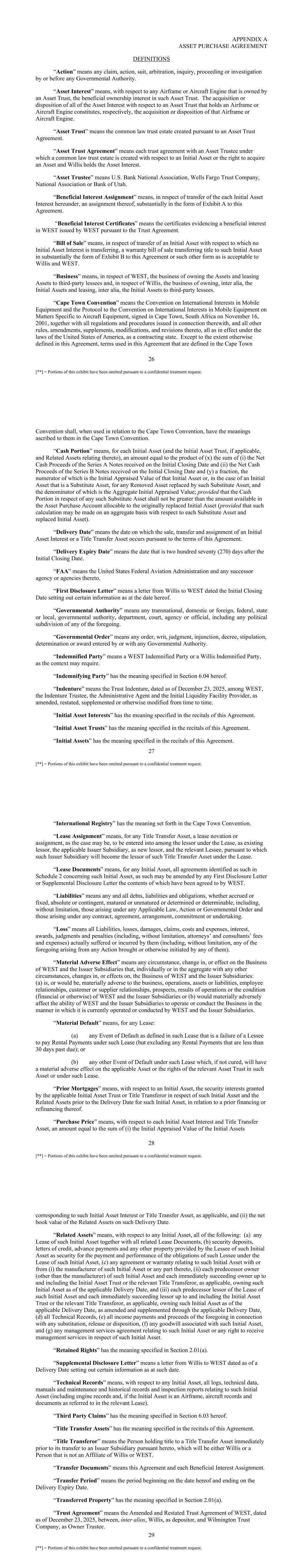 26 [**] = Portions of this exhibit have been omitted pursuant to a confidential treatment request. APPENDIX A ASSET PURCHASE AGREEMENT DEFINITIONS “Action” means any claim, action, suit, arbitration, inquiry, proceeding or investigation by or before any Governmental Authority. “Asset Interest” means, with respect to any Airframe or Aircraft Engine that is owned by an Asset Trust, the beneficial ownership interest in such Asset Trust. The acquisition or disposition of all of the Asset Interest with respect to an Asset Trust that holds an Airframe or Aircraft Engine constitutes, respectively, the acquisition or disposition of that Airframe or Aircraft Engine. “Asset Trust” means the common law trust estate created pursuant to an Asset Trust Agreement. “Asset Trust Agreement” means each trust agreement with an Asset Trustee under which a common law trust estate is created with respect to an Initial Asset or the right to acquire an Asset and Willis holds the Asset Interest. “Asset Trustee” means U.S. Bank National Association, Wells Fargo Trust Company, National Association or Bank of Utah. “Beneficial Interest Assignment” means, in respect of transfer of the each Initial Asset Interest hereunder, an assignment thereof, substantially in the form of Exhibit A to this Agreement. “Beneficial Interest Certificates” means the certificates evidencing a beneficial interest in WEST issued by WEST pursuant to the Trust Agreement. “Bill of Sale” means, in respect of transfer of an Initial Asset with respect to which no Initial Asset Interest is transferring, a warranty bill of sale transferring title to such Initial Asset in substantially the form of Exhibit B to this Agreement or such other form as is acceptable to Willis and WEST. “Business” means, in respect of WEST, the business of owning the Assets and leasing Assets to third-party lessees and, in respect of Willis, the business of owning, inter alia, the Initial Assets and leasing, inter alia, the Initial Assets to third-party lessees. “Cape Town Convention” means the Convention on International Interests in Mobile Equipment and the Protocol to the Convention on International Interests in Mobile Equipment on Matters Specific to Aircraft Equipment, signed in Cape Town, South Africa on November 16, 2001, together with all regulations and procedures issued in connection therewith, and all other rules, amendments, supplements, modifications, and revisions thereto, all as in effect under the laws of the United States of America, as a contracting state. Except to the extent otherwise defined in this Agreement, terms used in this Agreement that are defined in the Cape Town 27 [**] = Portions of this exhibit have been omitted pursuant to a confidential treatment request. Convention shall, when used in relation to the Cape Town Convention, have the meanings ascribed to them in the Cape Town Convention. “Cash Portion” means, for each Initial Asset (and the Initial Asset Trust, if applicable, and Related Assets relating thereto), an amount equal to the product of (x) the sum of (i) the Net Cash Proceeds of the Series A Notes received on the Initial Closing Date and (ii) the Net Cash Proceeds of the Series B Notes received on the Initial Closing Date and (y) a fraction, the numerator of which is the Initial Appraised Value of that Initial Asset or, in the case of an Initial Asset that is a Substitute Asset, for any Removed Asset replaced by such Substitute Asset, and the denominator of which is the Aggregate Initial Appraised Value; provided that the Cash Portion in respect of any such Substitute Asset shall not be greater than the amount available in the Asset Purchase Account allocable to the originally replaced Initial Asset (provided that such calculation may be made on an aggregate basis with respect to each Substitute Asset and replaced Initial Asset). “Delivery Date” means the date on which the sale, transfer and assignment of an Initial Asset Interest or a Title Transfer Asset occurs pursuant to the terms of this Agreement. “Delivery Expiry Date” means the date that is two hundred seventy (270) days after the Initial Closing Date. “FAA” means the United States Federal Aviation Administration and any successor agency or agencies thereto. “First Disclosure Letter” means a letter from Willis to WEST dated the Initial Closing Date setting out certain information as at the date hereof. “Governmental Authority” means any transnational, domestic or foreign, federal, state or local, governmental authority, department, court, agency or official, including any political subdivision of any of the foregoing. “Governmental Order” means any order, writ, judgment, injunction, decree, stipulation, determination or award entered by or with any Governmental Authority. “Indemnified Party” means a WEST Indemnified Party or a Willis Indemnified Party, as the context may require. “Indemnifying Party” has the meaning specified in Section 6.04 hereof. “Indenture” means the Trust Indenture, dated as of December 23, 2025, among WEST, the Indenture Trustee, the Administrative Agent and the Initial Liquidity Facility Provider, as amended, restated, supplemented or otherwise modified from time to time. “Initial Asset Interests” has the meaning specified in the recitals of this Agreement. “Initial Asset Trusts” has the meaning specified in the recitals of this Agreement. “Initial Assets” has the meaning specified in the recitals of this Agreement. 28 [**] = Portions of this exhibit have been omitted pursuant to a confidential treatment request. “International Registry” has the meaning set forth in the Cape Town Convention. “Lease Assignment” means, for any Title Transfer Asset, a lease novation or assignment, as the case may be, to be entered into among the lessor under the Lease, as existing lessor, the applicable Issuer Subsidiary, as new lessor, and the relevant Lessee, pursuan