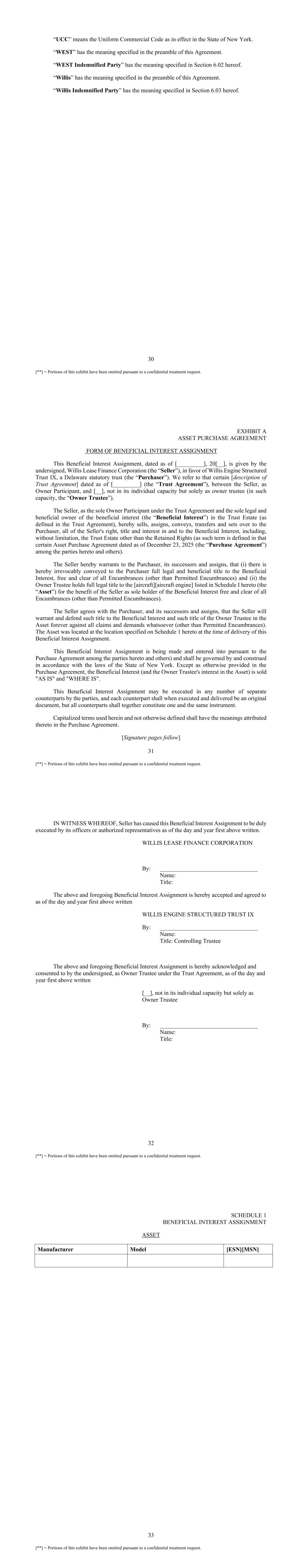 30 [**] = Portions of this exhibit have been omitted pursuant to a confidential treatment request. “UCC” means the Uniform Commercial Code as in effect in the State of New York. “WEST” has the meaning specified in the preamble of this Agreement. “WEST Indemnified Party” has the meaning specified in Section 6.02 hereof. “Willis” has the meaning specified in the preamble of this Agreement. “Willis Indemnified Party” has the meaning specified in Section 6.03 hereof. 31 [**] = Portions of this exhibit have been omitted pursuant to a confidential treatment request. EXHIBIT A ASSET PURCHASE AGREEMENT FORM OF BENEFICIAL INTEREST ASSIGNMENT This Beneficial Interest Assignment, dated as of [_________], 20[__], is given by the undersigned, Willis Lease Finance Corporation (the “Seller”), in favor of Willis Engine Structured Trust IX, a Delaware statutory trust (the “Purchaser”). We refer to that certain [description of Trust Agreement] dated as of [_________] (the “Trust Agreement”), between the Seller, as Owner Participant, and [__], not in its individual capacity but solely as owner trustee (in such capacity, the “Owner Trustee”). The Seller, as the sole Owner Participant under the Trust Agreement and the sole legal and beneficial owner of the beneficial interest (the “Beneficial Interest”) in the Trust Estate (as defined in the Trust Agreement), hereby sells, assigns, conveys, transfers and sets over to the Purchaser, all of the Seller's right, title and interest in and to the Beneficial Interest, including, without limitation, the Trust Estate other than the Retained Rights (as such term is defined in that certain Asset Purchase Agreement dated as of December 23, 2025 (the “Purchase Agreement”) among the parties hereto and others). The Seller hereby warrants to the Purchaser, its successors and assigns, that (i) there is hereby irrevocably conveyed to the Purchaser full legal and beneficial title to the Beneficial Interest, free and clear of all Encumbrances (other than Permitted Encumbrances) and (ii) the Owner Trustee holds full legal title to the [aircraft][aircraft engine] listed in Schedule I hereto (the “Asset”) for the benefit of the Seller as sole holder of the Beneficial Interest free and clear of all Encumbrances (other than Permitted Encumbrances). The Seller agrees with the Purchaser, and its successors and assigns, that the Seller will warrant and defend such title to the Beneficial Interest and such title of the Owner Trustee in the Asset forever against all claims and demands whatsoever (other than Permitted Encumbrances). The Asset was located at the location specified on Schedule 1 hereto at the time of delivery of this Beneficial Interest Assignment. This Beneficial Interest Assignment is being made and entered into pursuant to the Purchase Agreement among the parties hereto and others) and shall be governed by and construed in accordance with the laws of the State of New York. Except as otherwise provided in the Purchase Agreement, the Beneficial Interest (and the Owner Trustee's interest in the Asset) is sold "AS IS" and "WHERE IS". This Beneficial Interest Assignment may be executed in any number of separate counterparts by the parties, and each counterpart shall when executed and delivered be an original document, but all counterparts shall together constitute one and the same instrument. Capitalized terms used herein and not otherwise defined shall have the meanings attributed thereto in the Purchase Agreement. [Signature pages follow] 32 [**] = Portions of this exhibit have been omitted pursuant to a confidential treatment request. IN WITNESS WHEREOF, Seller has caused this Beneficial Interest Assignment to be duly executed by its officers or authorized representatives as of the day and year first above written. WILLIS LEASE FINANCE CORPORATION By: _________________________________ Name: Title: The above and foregoing Beneficial Interest Assignment is hereby accepted and agreed to as of the day and year first above written WILLIS ENGINE STRUCTURED TRUST IX By: _________________________________ Name: Title: Controlling Trustee The above and foregoing Beneficial Interest Assignment is hereby acknowledged and consented to by the undersigned, as Owner Trustee under the Trust Agreement, as of the day and year first above written [__], not in its individual capacity but solely as Owner Trustee By: _________________________________ Name: Title: 33 [**] = Portions of this exhibit have been omitted pursuant to a confidential treatment request. SCHEDULE 1 BENEFICIAL INTEREST ASSIGNMENT ASSET Manufacturer Model [ESN][MSN]