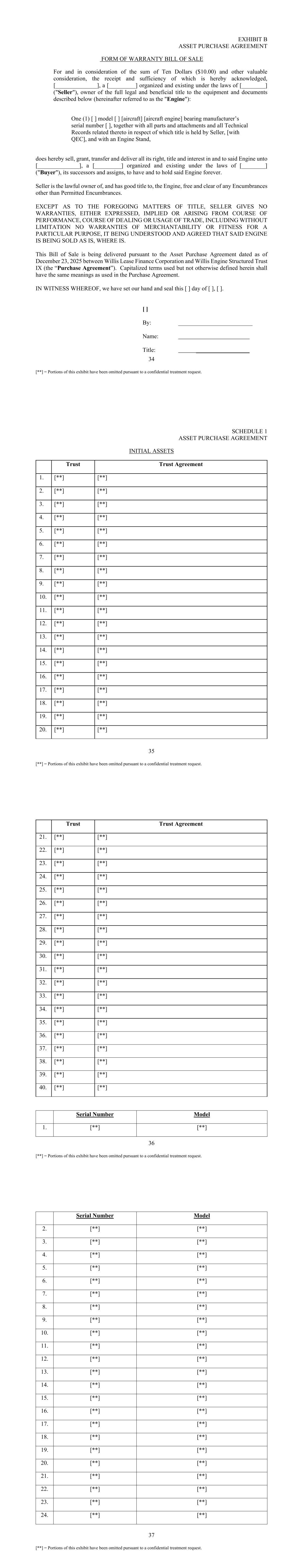 34 [**] = Portions of this exhibit have been omitted pursuant to a confidential treatment request. EXHIBIT B ASSET PURCHASE AGREEMENT FORM OF WARRANTY BILL OF SALE For and in consideration of the sum of Ten Dollars ($10.00) and other valuable consideration, the receipt and sufficiency of which is hereby acknowledged, [______________], a [_________] organized and existing under the laws of [________] ("Seller"), owner of the full legal and beneficial title to the equipment and documents described below (hereinafter referred to as the "Engine"): One (1) [ ] model [ ] [aircraft] [aircraft engine] bearing manufacturer’s serial number [ ], together with all parts and attachments and all Technical Records related thereto in respect of which title is held by Seller, [with QEC], and with an Engine Stand, does hereby sell, grant, transfer and deliver all its right, title and interest in and to said Engine unto [______________], a [_________] organized and existing under the laws of [________] ("Buyer"), its successors and assigns, to have and to hold said Engine forever. Seller is the lawful owner of, and has good title to, the Engine, free and clear of any Encumbrances other than Permitted Encumbrances. EXCEPT AS TO THE FOREGOING MATTERS OF TITLE, SELLER GIVES NO WARRANTIES, EITHER EXPRESSED, IMPLIED OR ARISING FROM COURSE OF PERFORMANCE, COURSE OF DEALING OR USAGE OF TRADE, INCLUDING WITHOUT LIMITATION NO WARRANTIES OF MERCHANTABILITY OR FITNESS FOR A PARTICULAR PURPOSE, IT BEING UNDERSTOOD AND AGREED THAT SAID ENGINE IS BEING SOLD AS IS, WHERE IS. This Bill of Sale is being delivered pursuant to the Asset Purchase Agreement dated as of December 23, 2025 between Willis Lease Finance Corporation and Willis Engine Structured Trust IX (the “Purchase Agreement”). Capitalized terms used but not otherwise defined herein shall have the same meanings as used in the Purchase Agreement. IN WITNESS WHEREOF, we have set our hand and seal this [ ] day of [ ], [ ]. [ ] By: _________________________ Name: Title: __________________ 35 [**] = Portions of this exhibit have been omitted pursuant to a confidential treatment request. SCHEDULE 1 ASSET PURCHASE AGREEMENT INITIAL ASSETS Trust Trust Agreement 1. [**] [**] 2. [**] [**] 3. [**] [**] 4. [**] [**] 5. [**] [**] 6. [**] [**] 7. [**] [**] 8. [**] [**] 9. [**] [**] 10. [**] [**] 11. [**] [**] 12. [**] [**] 13. [**] [**] 14. [**] [**] 15. [**] [**] 16. [**] [**] 17. [**] [**] 18. [**] [**] 19. [**] [**] 20. [**] [**] 36 [**] = Portions of this exhibit have been omitted pursuant to a confidential treatment request. Trust Trust Agreement 21. [**] [**] 22. [**] [**] 23. [**] [**] 24. [**] [**] 25. [**] [**] 26. [**] [**] 27. [**] [**] 28. [**] [**] 29. [**] [**] 30. [**] [**] 31. [**] [**] 32. [**] [**] 33. [**] [**] 34. [**] [**] 35. [**] [**] 36. [**] [**] 37. [**] [**] 38. [**] [**] 39. [**] [**] 40. [**] [**] Serial Number Model 1. [**] [**] 37 [**] = Portions of this exhibit have been omitted pursuant to a confidential treatment request. Serial Number Model 2. [**] [**] 3. [**] [**] 4. [**] [**] 5. [**] [**] 6. [**] [**] 7. [**] [**] 8. [**] [**] 9. [**] [**] 10. [**] [**] 11. [**] [**] 12. [**] [**] 13. [**] [**] 14. [**] [**] 15. [**] [**] 16. [**] [**] 17. [**] [**] 18. [**] [**] 19. [**] [**] 20. [**] [**] 21. [**] [**] 22. [**] [**] 23. [**] [**] 24. [**] [**]