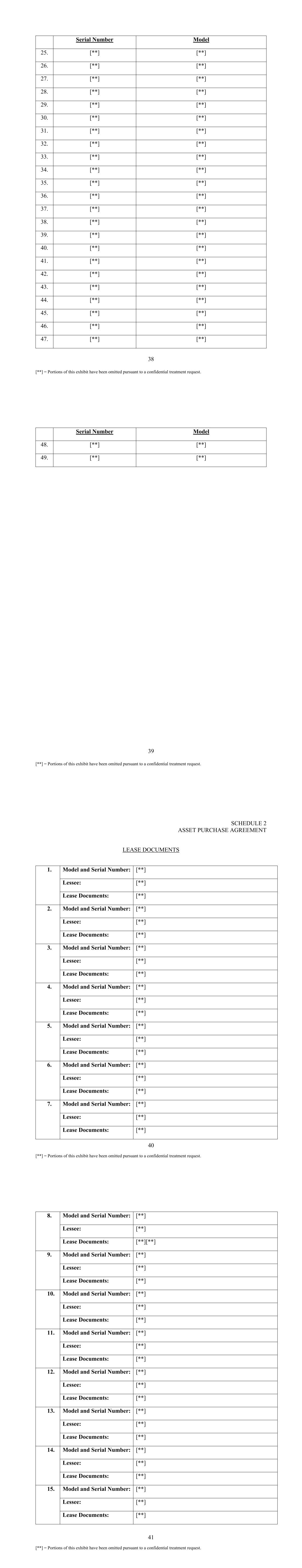38 [**] = Portions of this exhibit have been omitted pursuant to a confidential treatment request. Serial Number Model 25. [**] [**] 26. [**] [**] 27. [**] [**] 28. [**] [**] 29. [**] [**] 30. [**] [**] 31. [**] [**] 32. [**] [**] 33. [**] [**] 34. [**] [**] 35. [**] [**] 36. [**] [**] 37. [**] [**] 38. [**] [**] 39. [**] [**] 40. [**] [**] 41. [**] [**] 42. [**] [**] 43. [**] [**] 44. [**] [**] 45. [**] [**] 46. [**] [**] 47. [**] [**] 39 [**] = Portions of this exhibit have been omitted pursuant to a confidential treatment request. Serial Number Model 48. [**] [**] 49. [**] [**] 40 [**] = Portions of this exhibit have been omitted pursuant to a confidential treatment request. SCHEDULE 2 ASSET PURCHASE AGREEMENT LEASE DOCUMENTS 1. Model and Serial Number: [**] Lessee: [**] Lease Documents: [**] 2. Model and Serial Number: [**] Lessee: [**] Lease Documents: [**] 3. Model and Serial Number: [**] Lessee: [**] Lease Documents: [**] 4. Model and Serial Number: [**] Lessee: [**] Lease Documents: [**] 5. Model and Serial Number: [**] Lessee: [**] Lease Documents: [**] 6. Model and Serial Number: [**] Lessee: [**] Lease Documents: [**] 7. Model and Serial Number: [**] Lessee: [**] Lease Documents: [**] 41 [**] = Portions of this exhibit have been omitted pursuant to a confidential treatment request. 8. Model and Serial Number: [**] Lessee: [**] Lease Documents: [**][**] 9. Model and Serial Number: [**] Lessee: [**] Lease Documents: [**] 10. Model and Serial Number: [**] Lessee: [**] Lease Documents: [**] 11. Model and Serial Number: [**] Lessee: [**] Lease Documents: [**] 12. Model and Serial Number: [**] Lessee: [**] Lease Documents: [**] 13. Model and Serial Number: [**] Lessee: [**] Lease Documents: [**] 14. Model and Serial Number: [**] Lessee: [**] Lease Documents: [**] 15. Model and Serial Number: [**] Lessee: [**] Lease Documents: [**]