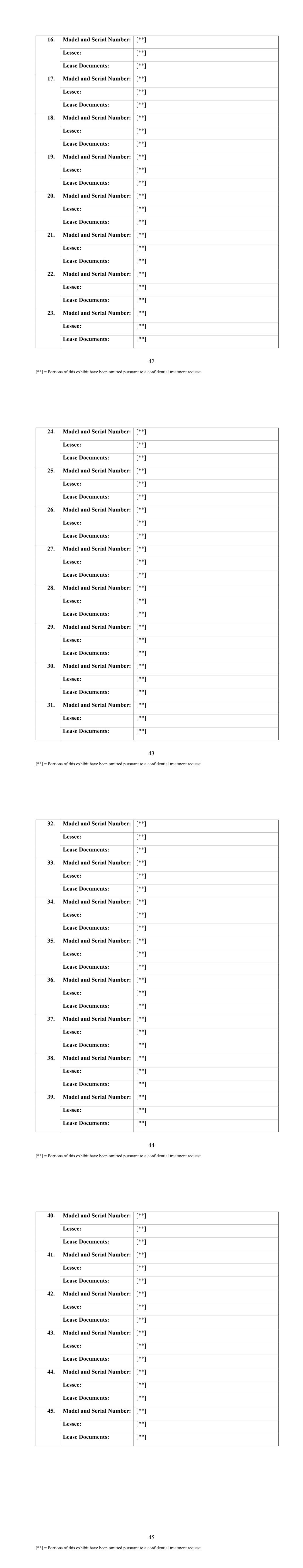 42 [**] = Portions of this exhibit have been omitted pursuant to a confidential treatment request. 16. Model and Serial Number: [**] Lessee: [**] Lease Documents: [**] 17. Model and Serial Number: [**] Lessee: [**] Lease Documents: [**] 18. Model and Serial Number: [**] Lessee: [**] Lease Documents: [**] 19. Model and Serial Number: [**] Lessee: [**] Lease Documents: [**] 20. Model and Serial Number: [**] Lessee: [**] Lease Documents: [**] 21. Model and Serial Number: [**] Lessee: [**] Lease Documents: [**] 22. Model and Serial Number: [**] Lessee: [**] Lease Documents: [**] 23. Model and Serial Number: [**] Lessee: [**] Lease Documents: [**] 43 [**] = Portions of this exhibit have been omitted pursuant to a confidential treatment request. 24. Model and Serial Number: [**] Lessee: [**] Lease Documents: [**] 25. Model and Serial Number: [**] Lessee: [**] Lease Documents: [**] 26. Model and Serial Number: [**] Lessee: [**] Lease Documents: [**] 27. Model and Serial Number: [**] Lessee: [**] Lease Documents: [**] 28. Model and Serial Number: [**] Lessee: [**] Lease Documents: [**] 29. Model and Serial Number: [**] Lessee: [**] Lease Documents: [**] 30. Model and Serial Number: [**] Lessee: [**] Lease Documents: [**] 31. Model and Serial Number: [**] Lessee: [**] Lease Documents: [**] 44 [**] = Portions of this exhibit have been omitted pursuant to a confidential treatment request. 32. Model and Serial Number: [**] Lessee: [**] Lease Documents: [**] 33. Model and Serial Number: [**] Lessee: [**] Lease Documents: [**] 34. Model and Serial Number: [**] Lessee: [**] Lease Documents: [**] 35. Model and Serial Number: [**] Lessee: [**] Lease Documents: [**] 36. Model and Serial Number: [**] Lessee: [**] Lease Documents: [**] 37. Model and Serial Number: [**] Lessee: [**] Lease Documents: [**] 38. Model and Serial Number: [**] Lessee: [**] Lease Documents: [**] 39. Model and Serial Number: [**] Lessee: [**] Lease Documents: [**] 45 [**] = Portions of this exhibit have been omitted pursuant to a confidential treatment request. 40. Model and Serial Number: [**] Lessee: [**] Lease Documents: [**] 41. Model and Serial Number: [**] Lessee: [**] Lease Documents: [**] 42. Model and Serial Number: [**] Lessee: [**] Lease Documents: [**] 43. Model and Serial Number: [**] Lessee: [**] Lease Documents: [**] 44. Model and Serial Number: [**] Lessee: [**] Lease Documents: [**] 45. Model and Serial Number: [**] Lessee: [**] Lease Documents: [**]