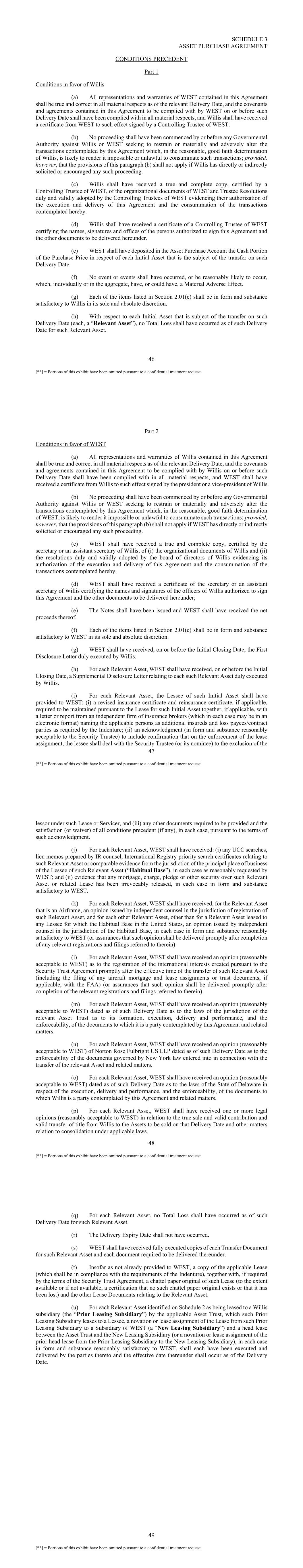 46 [**] = Portions of this exhibit have been omitted pursuant to a confidential treatment request. SCHEDULE 3 ASSET PURCHASE AGREEMENT CONDITIONS PRECEDENT Part 1 Conditions in favor of Willis (a) All representations and warranties of WEST contained in this Agreement shall be true and correct in all material respects as of the relevant Delivery Date, and the covenants and agreements contained in this Agreement to be complied with by WEST on or before such Delivery Date shall have been complied with in all material respects, and Willis shall have received a certificate from WEST to such effect signed by a Controlling Trustee of WEST. (b) No proceeding shall have been commenced by or before any Governmental Authority against Willis or WEST seeking to restrain or materially and adversely alter the transactions contemplated by this Agreement which, in the reasonable, good faith determination of Willis, is likely to render it impossible or unlawful to consummate such transactions; provided, however, that the provisions of this paragraph (b) shall not apply if Willis has directly or indirectly solicited or encouraged any such proceeding. (c) Willis shall have received a true and complete copy, certified by a Controlling Trustee of WEST, of the organizational documents of WEST and Trustee Resolutions duly and validly adopted by the Controlling Trustees of WEST evidencing their authorization of the execution and delivery of this Agreement and the consummation of the transactions contemplated hereby. (d) Willis shall have received a certificate of a Controlling Trustee of WEST certifying the names, signatures and offices of the persons authorized to sign this Agreement and the other documents to be delivered hereunder. (e) WEST shall have deposited in the Asset Purchase Account the Cash Portion of the Purchase Price in respect of each Initial Asset that is the subject of the transfer on such Delivery Date. (f) No event or events shall have occurred, or be reasonably likely to occur, which, individually or in the aggregate, have, or could have, a Material Adverse Effect. (g) Each of the items listed in Section 2.01(c) shall be in form and substance satisfactory to Willis in its sole and absolute discretion. (h) With respect to each Initial Asset that is subject of the transfer on such Delivery Date (each, a “Relevant Asset”), no Total Loss shall have occurred as of such Delivery Date for such Relevant Asset. 47 [**] = Portions of this exhibit have been omitted pursuant to a confidential treatment request. Part 2 Conditions in favor of WEST (a) All representations and warranties of Willis contained in this Agreement shall be true and correct in all material respects as of the relevant Delivery Date, and the covenants and agreements contained in this Agreement to be complied with by Willis on or before such Delivery Date shall have been complied with in all material respects, and WEST shall have received a certificate from Willis to such effect signed by the president or a vice-president of Willis. (b) No proceeding shall have been commenced by or before any Governmental Authority against Willis or WEST seeking to restrain or materially and adversely alter the transactions contemplated by this Agreement which, in the reasonable, good faith determination of WEST, is likely to render it impossible or unlawful to consummate such transactions; provided, however, that the provisions of this paragraph (b) shall not apply if WEST has directly or indirectly solicited or encouraged any such proceeding. (c) WEST shall have received a true and complete copy, certified by the secretary or an assistant secretary of Willis, of (i) the organizational documents of Willis and (ii) the resolutions duly and validly adopted by the board of directors of Willis evidencing its authorization of the execution and delivery of this Agreement and the consummation of the transactions contemplated hereby. (d) WEST shall have received a certificate of the secretary or an assistant secretary of Willis certifying the names and signatures of the officers of Willis authorized to sign this Agreement and the other documents to be delivered hereunder; (e) The Notes shall have been issued and WEST shall have received the net proceeds thereof. (f) Each of the items listed in Section 2.01(c) shall be in form and substance satisfactory to WEST in its sole and absolute discretion. (g) WEST shall have received, on or before the Initial Closing Date, the First Disclosure Letter duly executed by Willis. (h) For each Relevant Asset, WEST shall have received, on or before the Initial Closing Date, a Supplemental Disclosure Letter relating to each such Relevant Asset duly executed by Willis. (i) For each Relevant Asset, the Lessee of such Initial Asset shall have provided to WEST: (i) a revised insurance certificate and reinsurance certificate, if applicable, required to be maintained pursuant to the Lease for such Initial Asset together, if applicable, with a letter or report from an independent firm of insurance brokers (which in each case may be in an electronic format) naming the applicable persons as additional insureds and loss payees/contract parties as required by the Indenture; (ii) an acknowledgment (in form and substance reasonably acceptable to the Security Trustee) to include confirmation that on the enforcement of the lease assignment, the lessee shall deal with the Security Trustee (or its nominee) to the exclusion of the 48 [**] = Portions of this exhibit have been omitted pursuant to a confidential treatment request. lessor under such Lease or Servicer, and (iii) any other documents required to be provided and the satisfaction (or waiver) of all conditions precedent (if any), in each case, pursuant to the terms of such acknowledgment. (j) For each Relevant Asset, WEST shall have received: (i) any UCC searches, lien memos prepared by IR counsel, International Registry priority search certificates relating to such Relevant Asset