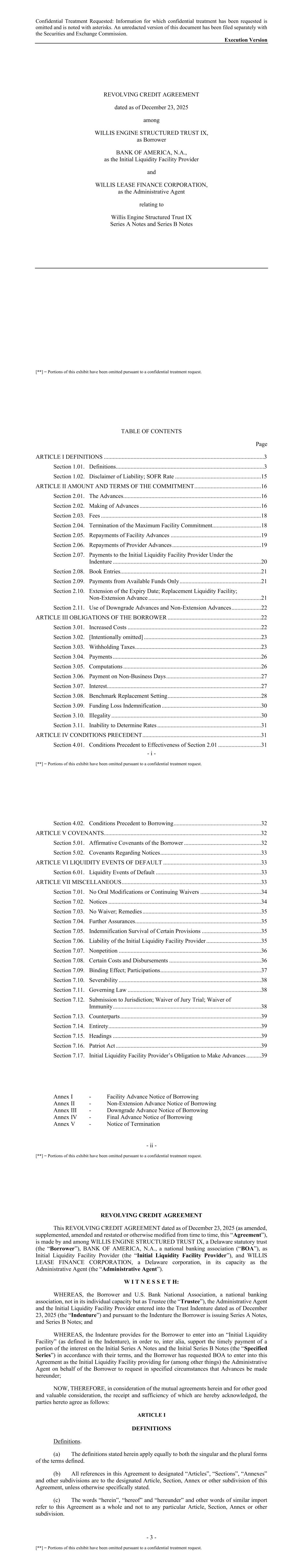 Confidential Treatment Requested: Information for which confidential treatment has been requested is omitted and is noted with asterisks. An unredacted version of this document has been filed separately with the Securities and Exchange Commission. Execution Version [**] = Portions of this exhibit have been omitted pursuant to a confidential treatment request. REVOLVING CREDIT AGREEMENT dated as of December 23, 2025 among WILLIS ENGINE STRUCTURED TRUST IX, as Borrower BANK OF AMERICA, N.A., as the Initial Liquidity Facility Provider and WILLIS LEASE FINANCE CORPORATION, as the Administrative Agent relating to Willis Engine Structured Trust IX Series A Notes and Series B Notes - i - [**] = Portions of this exhibit have been omitted pursuant to a confidential treatment request. TABLE OF CONTENTS Page ARTICLE I DEFINITIONS ............................................................................................................3 Section 1.01. Definitions....................................................................................................3 Section 1.02. Disclaimer of Liability; SOFR Rate ..........................................................15 ARTICLE II AMOUNT AND TERMS OF THE COMMITMENT .............................................16 Section 2.01. The Advances.............................................................................................16 Section 2.02. Making of Advances ..................................................................................16 Section 2.03. Fees ............................................................................................................18 Section 2.04. Termination of the Maximum Facility Commitment.................................18 Section 2.05. Repayments of Facility Advances .............................................................19 Section 2.06. Repayments of Provider Advances ............................................................19 Section 2.07. Payments to the Initial Liquidity Facility Provider Under the Indenture ....................................................................................................20 Section 2.08. Book Entries...............................................................................................21 Section 2.09. Payments from Available Funds Only .......................................................21 Section 2.10. Extension of the Expiry Date; Replacement Liquidity Facility; Non-Extension Advance ............................................................................21 Section 2.11. Use of Downgrade Advances and Non-Extension Advances ....................22 ARTICLE III OBLIGATIONS OF THE BORROWER ...............................................................22 Section 3.01. Increased Costs ..........................................................................................22 Section 3.02. [Intentionally omitted] ...............................................................................23 Section 3.03. Withholding Taxes .....................................................................................23 Section 3.04. Payments ....................................................................................................26 Section 3.05. Computations .............................................................................................26 Section 3.06. Payment on Non-Business Days ................................................................27 Section 3.07. Interest........................................................................................................27 Section 3.08. Benchmark Replacement Setting ...............................................................28 Section 3.09. Funding Loss Indemnification ...................................................................30 Section 3.10. Illegality .....................................................................................................30 Section 3.11. Inability to Determine Rates ......................................................................31 ARTICLE IV CONDITIONS PRECEDENT ................................................................................31 Section 4.01. Conditions Precedent to Effectiveness of Section 2.01 .............................31 - ii - [**] = Portions of this exhibit have been omitted pursuant to a confidential treatment request. Section 4.02. Conditions Precedent to Borrowing ...........................................................32 ARTICLE V COVENANTS..........................................................................................................32 Section 5.01. Affirmative Covenants of the Borrower ....................................................32 Section 5.02. Covenants Regarding Notices ....................................................................33 ARTICLE VI LIQUIDITY EVENTS OF DEFAULT ..................................................................33 Section 6.01. Liquidity Events of Default .......................................................................33 ARTICLE VII MISCELLANEOUS ..............................................................................................33 Section 7.01. No Oral Modifications or Continuing Waivers .........................................34 Section 7.02. Notices .......................................................................................................34 Section 7.03. No Waiver; Remedies ................................................................................35 Section 7.04. Further Assurances.....................................................................................35 Section 7.05. Indemnification Survival of Certain Provisions ........................................35 Section 7.06. Liability of the Initial Liquidity Facility Provider .....................................35 Section 7.07. Nonpetition ................................................................................................36 Secti