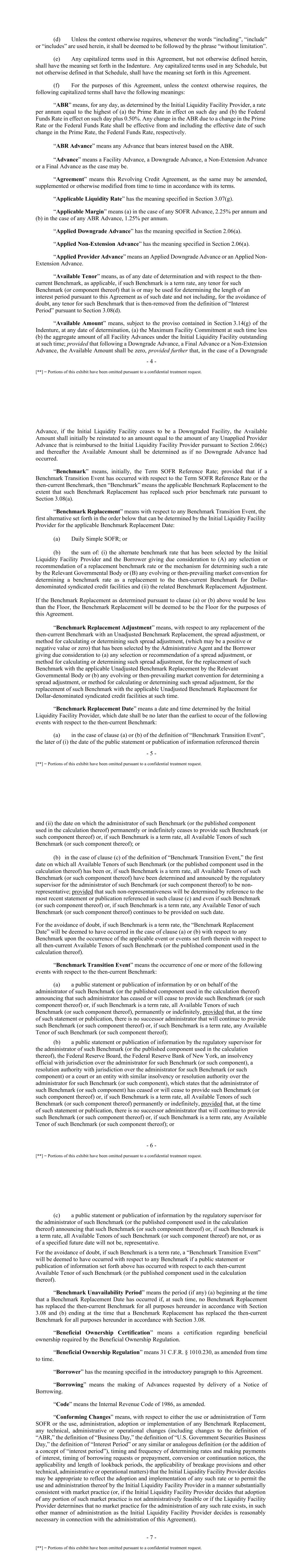 - 4 - [**] = Portions of this exhibit have been omitted pursuant to a confidential treatment request. (d) Unless the context otherwise requires, whenever the words “including”, “include” or “includes” are used herein, it shall be deemed to be followed by the phrase “without limitation”. (e) Any capitalized terms used in this Agreement, but not otherwise defined herein, shall have the meaning set forth in the Indenture. Any capitalized terms used in any Schedule, but not otherwise defined in that Schedule, shall have the meaning set forth in this Agreement. (f) For the purposes of this Agreement, unless the context otherwise requires, the following capitalized terms shall have the following meanings: “ABR” means, for any day, as determined by the Initial Liquidity Facility Provider, a rate per annum equal to the highest of (a) the Prime Rate in effect on such day and (b) the Federal Funds Rate in effect on such day plus 0.50%. Any change in the ABR due to a change in the Prime Rate or the Federal Funds Rate shall be effective from and including the effective date of such change in the Prime Rate, the Federal Funds Rate, respectively. “ABR Advance” means any Advance that bears interest based on the ABR. “Advance” means a Facility Advance, a Downgrade Advance, a Non-Extension Advance or a Final Advance as the case may be. “Agreement” means this Revolving Credit Agreement, as the same may be amended, supplemented or otherwise modified from time to time in accordance with its terms. “Applicable Liquidity Rate” has the meaning specified in Section 3.07(g). “Applicable Margin” means (a) in the case of any SOFR Advance, 2.25% per annum and (b) in the case of any ABR Advance, 1.25% per annum. “Applied Downgrade Advance” has the meaning specified in Section 2.06(a). “Applied Non-Extension Advance” has the meaning specified in Section 2.06(a). “Applied Provider Advance” means an Applied Downgrade Advance or an Applied Non- Extension Advance. “Available Tenor” means, as of any date of determination and with respect to the then- current Benchmark, as applicable, if such Benchmark is a term rate, any tenor for such Benchmark (or component thereof) that is or may be used for determining the length of an interest period pursuant to this Agreement as of such date and not including, for the avoidance of doubt, any tenor for such Benchmark that is then-removed from the definition of “Interest Period” pursuant to Section 3.08(d). “Available Amount” means, subject to the proviso contained in Section 3.14(g) of the Indenture, at any date of determination, (a) the Maximum Facility Commitment at such time less (b) the aggregate amount of all Facility Advances under the Initial Liquidity Facility outstanding at such time; provided that following a Downgrade Advance, a Final Advance or a Non-Extension Advance, the Available Amount shall be zero, provided further that, in the case of a Downgrade - 5 - [**] = Portions of this exhibit have been omitted pursuant to a confidential treatment request. Advance, if the Initial Liquidity Facility ceases to be a Downgraded Facility, the Available Amount shall initially be reinstated to an amount equal to the amount of any Unapplied Provider Advance that is reimbursed to the Initial Liquidity Facility Provider pursuant to Section 2.06(c) and thereafter the Available Amount shall be determined as if no Downgrade Advance had occurred. “Benchmark” means, initially, the Term SOFR Reference Rate; provided that if a Benchmark Transition Event has occurred with respect to the Term SOFR Reference Rate or the then-current Benchmark, then “Benchmark” means the applicable Benchmark Replacement to the extent that such Benchmark Replacement has replaced such prior benchmark rate pursuant to Section 3.08(a). “Benchmark Replacement” means with respect to any Benchmark Transition Event, the first alternative set forth in the order below that can be determined by the Initial Liquidity Facility Provider for the applicable Benchmark Replacement Date: (a) Daily Simple SOFR; or (b) the sum of: (i) the alternate benchmark rate that has been selected by the Initial Liquidity Facility Provider and the Borrower giving due consideration to (A) any selection or recommendation of a replacement benchmark rate or the mechanism for determining such a rate by the Relevant Governmental Body or (B) any evolving or then-prevailing market convention for determining a benchmark rate as a replacement to the then-current Benchmark for Dollar- denominated syndicated credit facilities and (ii) the related Benchmark Replacement Adjustment. If the Benchmark Replacement as determined pursuant to clause (a) or (b) above would be less than the Floor, the Benchmark Replacement will be deemed to be the Floor for the purposes of this Agreement. “Benchmark Replacement Adjustment” means, with respect to any replacement of the then-current Benchmark with an Unadjusted Benchmark Replacement, the spread adjustment, or method for calculating or determining such spread adjustment, (which may be a positive or negative value or zero) that has been selected by the Administrative Agent and the Borrower giving due consideration to (a) any selection or recommendation of a spread adjustment, or method for calculating or determining such spread adjustment, for the replacement of such Benchmark with the applicable Unadjusted Benchmark Replacement by the Relevant Governmental Body or (b) any evolving or then-prevailing market convention for determining a spread adjustment, or method for calculating or determining such spread adjustment, for the replacement of such Benchmark with the applicable Unadjusted Benchmark Replacement for Dollar-denominated syndicated credit facilities at such time. “Benchmark Replacement Date” means a date and time determined by the Initial Liquidity Facility Provider, which date shall be no later than the earliest to occur of the 