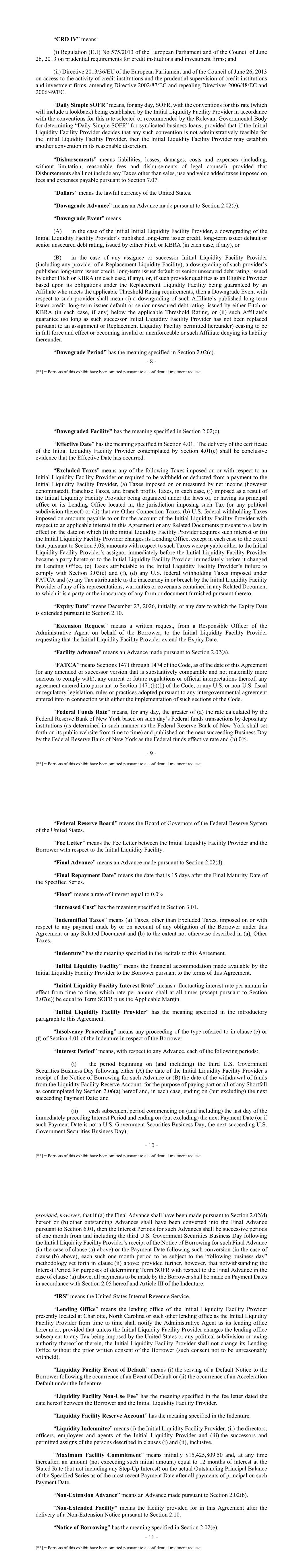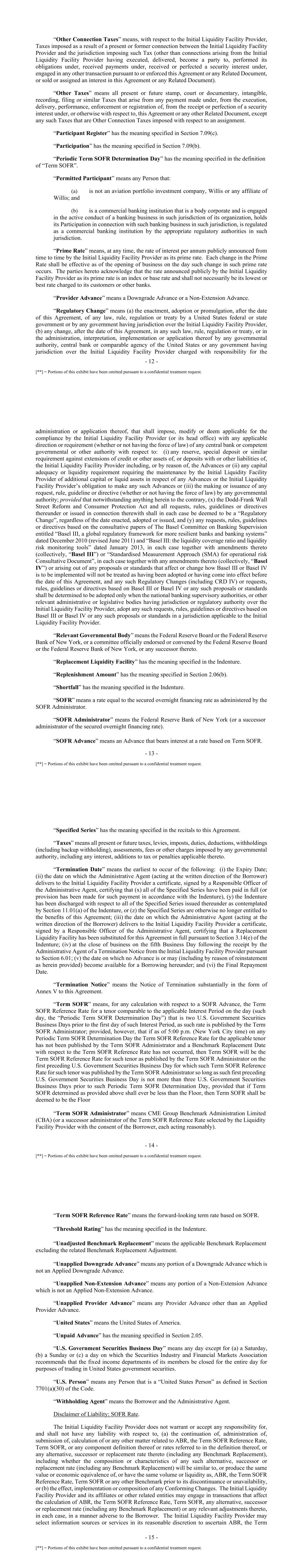 - 8 - [**] = Portions of this exhibit have been omitted pursuant to a confidential treatment request. “CRD IV” means: (i) Regulation (EU) No 575/2013 of the European Parliament and of the Council of June 26, 2013 on prudential requirements for credit institutions and investment firms; and (ii) Directive 2013/36/EU of the European Parliament and of the Council of June 26, 2013 on access to the activity of credit institutions and the prudential supervision of credit institutions and investment firms, amending Directive 2002/87/EC and repealing Directives 2006/48/EC and 2006/49/EC. “Daily Simple SOFR” means, for any day, SOFR, with the conventions for this rate (which will include a lookback) being established by the Initial Liquidity Facility Provider in accordance with the conventions for this rate selected or recommended by the Relevant Governmental Body for determining “Daily Simple SOFR” for syndicated business loans; provided that if the Initial Liquidity Facility Provider decides that any such convention is not administratively feasible for the Initial Liquidity Facility Provider, then the Initial Liquidity Facility Provider may establish another convention in its reasonable discretion. “Disbursements” means liabilities, losses, damages, costs and expenses (including, without limitation, reasonable fees and disbursements of legal counsel), provided that Disbursements shall not include any Taxes other than sales, use and value added taxes imposed on fees and expenses payable pursuant to Section 7.07. “Dollars” means the lawful currency of the United States. “Downgrade Advance” means an Advance made pursuant to Section 2.02(c). “Downgrade Event” means (A) in the case of the initial Initial Liquidity Facility Provider, a downgrading of the Initial Liquidity Facility Provider’s published long-term issuer credit, long-term issuer default or senior unsecured debt rating, issued by either Fitch or KBRA (in each case, if any), or (B) in the case of any assignee or successor Initial Liquidity Facility Provider (including any provider of a Replacement Liquidity Facility), a downgrading of such provider’s published long-term issuer credit, long-term issuer default or senior unsecured debt rating, issued by either Fitch or KBRA (in each case, if any), or, if such provider qualifies as an Eligible Provider based upon its obligations under the Replacement Liquidity Facility being guaranteed by an Affiliate who meets the applicable Threshold Rating requirements, then a Downgrade Event with respect to such provider shall mean (i) a downgrading of such Affiliate’s published long-term issuer credit, long-term issuer default or senior unsecured debt rating, issued by either Fitch or KBRA (in each case, if any) below the applicable Threshold Rating, or (ii) such Affiliate’s guarantee (so long as such successor Initial Liquidity Facility Provider has not been replaced pursuant to an assignment or Replacement Liquidity Facility permitted hereunder) ceasing to be in full force and effect or becoming invalid or unenforceable or such Affiliate denying its liability thereunder. “Downgrade Period” has the meaning specified in Section 2.02(c). - 9 - [**] = Portions of this exhibit have been omitted pursuant to a confidential treatment request. “Downgraded Facility” has the meaning specified in Section 2.02(c). “Effective Date” has the meaning specified in Section 4.01. The delivery of the certificate of the Initial Liquidity Facility Provider contemplated by Section 4.01(e) shall be conclusive evidence that the Effective Date has occurred. “Excluded Taxes” means any of the following Taxes imposed on or with respect to an Initial Liquidity Facility Provider or required to be withheld or deducted from a payment to the Initial Liquidity Facility Provider, (a) Taxes imposed on or measured by net income (however denominated), franchise Taxes, and branch profits Taxes, in each case, (i) imposed as a result of the Initial Liquidity Facility Provider being organized under the laws of, or having its principal office or its Lending Office located in, the jurisdiction imposing such Tax (or any political subdivision thereof) or (ii) that are Other Connection Taxes, (b) U.S. federal withholding Taxes imposed on amounts payable to or for the account of the Initial Liquidity Facility Provider with respect to an applicable interest in this Agreement or any Related Documents pursuant to a law in effect on the date on which (i) the initial Liquidity Facility Provider acquires such interest or (ii) the Initial Liquidity Facility Provider changes its Lending Office, except in each case to the extent that, pursuant to Section 3.03, amounts with respect to such Taxes were payable either to the Initial Liquidity Facility Provider’s assignor immediately before the Initial Liquidity Facility Provider became a party hereto or to the Initial Liquidity Facility Provider immediately before it changed its Lending Office, (c) Taxes attributable to the Initial Liquidity Facility Provider’s failure to comply with Section 3.03(e) and (f), (d) any U.S. federal withholding Taxes imposed under FATCA and (e) any Tax attributable to the inaccuracy in or breach by the Initial Liquidity Facility Provider of any of its representations, warranties or covenants contained in any Related Document to which it is a party or the inaccuracy of any form or document furnished pursuant thereto. “Expiry Date” means December 23, 2026, initially, or any date to which the Expiry Date is extended pursuant to Section 2.10. “Extension Request” means a written request, from a Responsible Officer of the Administrative Agent on behalf of the Borrower, to the Initial Liquidity Facility Provider requesting that the Initial Liquidity Facility Provider extend the Expiry Date. “Facility Advance” means an Advance made pursuant to Section 2.02(a). “FATCA” means Sections 1471 through 1474 of the Code, as of th