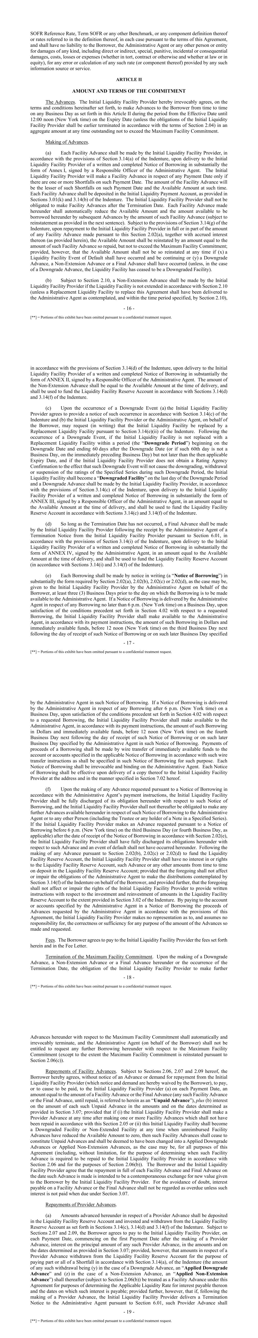 - 16 - [**] = Portions of this exhibit have been omitted pursuant to a confidential treatment request. SOFR Reference Rate, Term SOFR or any other Benchmark, or any component definition thereof or rates referred to in the definition thereof, in each case pursuant to the terms of this Agreement, and shall have no liability to the Borrower, the Administrative Agent or any other person or entity for damages of any kind, including direct or indirect, special, punitive, incidental or consequential damages, costs, losses or expenses (whether in tort, contract or otherwise and whether at law or in equity), for any error or calculation of any such rate (or component thereof) provided by any such information source or service. ARTICLE II AMOUNT AND TERMS OF THE COMMITMENT The Advances. The Initial Liquidity Facility Provider hereby irrevocably agrees, on the terms and conditions hereinafter set forth, to make Advances to the Borrower from time to time on any Business Day as set forth in this Article II during the period from the Effective Date until 12:00 noon (New York time) on the Expiry Date (unless the obligations of the Initial Liquidity Facility Provider shall be earlier terminated in accordance with the terms of Section 2.04) in an aggregate amount at any time outstanding not to exceed the Maximum Facility Commitment. Making of Advances. (a) Each Facility Advance shall be made by the Initial Liquidity Facility Provider, in accordance with the provisions of Section 3.14(a) of the Indenture, upon delivery to the Initial Liquidity Facility Provider of a written and completed Notice of Borrowing in substantially the form of Annex I, signed by a Responsible Officer of the Administrative Agent. The Initial Liquidity Facility Provider will make a Facility Advance in respect of any Payment Date only if there are one or more Shortfalls on such Payment Date. The amount of the Facility Advance will be the lesser of such Shortfalls on such Payment Date and the Available Amount at such time. Each Facility Advance shall be deposited in the Initial Liquidity Payment Account, as provided in Sections 3.01(k) and 3.14(b) of the Indenture. The Initial Liquidity Facility Provider shall not be obligated to make Facility Advances after the Termination Date. Each Facility Advance made hereunder shall automatically reduce the Available Amount and the amount available to be borrowed hereunder by subsequent Advances by the amount of such Facility Advance (subject to reinstatement as provided in the next sentence). Subject to the provisions of Section 3.14(g) of the Indenture, upon repayment to the Initial Liquidity Facility Provider in full or in part of the amount of any Facility Advance made pursuant to this Section 2.02(a), together with accrued interest thereon (as provided herein), the Available Amount shall be reinstated by an amount equal to the amount of such Facility Advance so repaid, but not to exceed the Maximum Facility Commitment; provided, however, that the Available Amount shall not be so reinstated at any time if (x) a Liquidity Facility Event of Default shall have occurred and be continuing or (y) a Downgrade Advance, a Non-Extension Advance or a Final Advance shall have occurred (unless, in the case of a Downgrade Advance, the Liquidity Facility has ceased to be a Downgraded Facility). (b) Subject to Section 2.10, a Non-Extension Advance shall be made by the Initial Liquidity Facility Provider if the Liquidity Facility is not extended in accordance with Section 2.10 (unless a Replacement Liquidity Facility to replace this Agreement shall have been delivered to the Administrative Agent as contemplated, and within the time period specified, by Section 2.10), - 17 - [**] = Portions of this exhibit have been omitted pursuant to a confidential treatment request. in accordance with the provisions of Section 3.14(d) of the Indenture, upon delivery to the Initial Liquidity Facility Provider of a written and completed Notice of Borrowing in substantially the form of ANNEX II, signed by a Responsible Officer of the Administrative Agent. The amount of the Non-Extension Advance shall be equal to the Available Amount at the time of delivery, and shall be used to fund the Liquidity Facility Reserve Account in accordance with Sections 3.14(d) and 3.14(f) of the Indenture. (c) Upon the occurrence of a Downgrade Event (a) the Initial Liquidity Facility Provider agrees to provide a notice of such occurrence in accordance with Section 3.14(c) of the Indenture and (b) the Initial Liquidity Facility Provider or the Administrative Agent, on behalf of the Borrower, may request (in writing) that the Initial Liquidity Facility be replaced by a Replacement Liquidity Facility pursuant to Section 3.14(e)(ii) of the Indenture. Following the occurrence of a Downgrade Event, if the Initial Liquidity Facility is not replaced with a Replacement Liquidity Facility within a period (the “Downgrade Period”) beginning on the Downgrade Date and ending 60 days after the Downgrade Date (or if such 60th day is not a Business Day, on the immediately preceding Business Day) but not later than the then applicable Expiry Date, and if the Initial Liquidity Facility Provider does not obtain a Rating Agency Confirmation to the effect that such Downgrade Event will not cause the downgrading, withdrawal or suspension of the ratings of the Specified Series during such Downgrade Period, the Initial Liquidity Facility shall become a “Downgraded Facility” on the last day of the Downgrade Period and a Downgrade Advance shall be made by the Initial Liquidity Facility Provider, in accordance with the provisions of Section 3.14(c) of the Indenture, upon delivery to the Initial Liquidity Facility Provider of a written and completed Notice of Borrowing in substantially the form of ANNEX III, signed by a Responsible Officer of the Administrative Agent, in an amount equal to the Available Amount at the time of delivery, and shall be used to fund the 