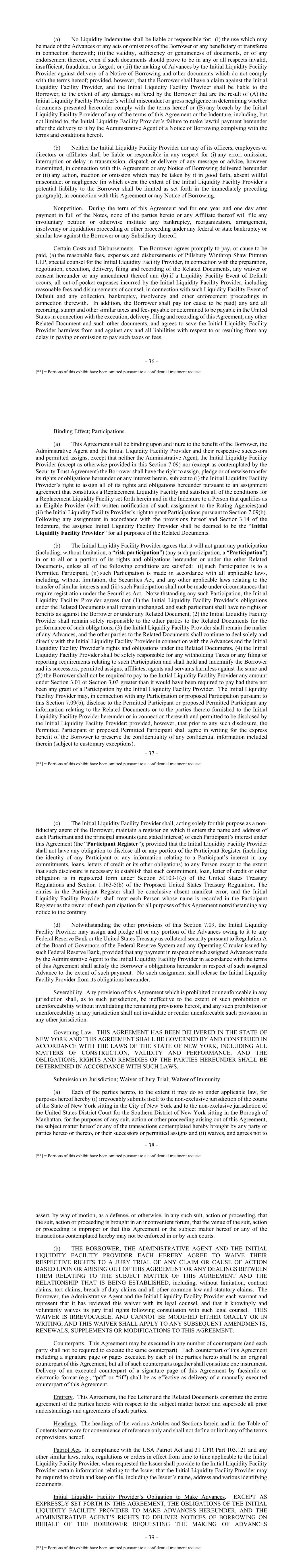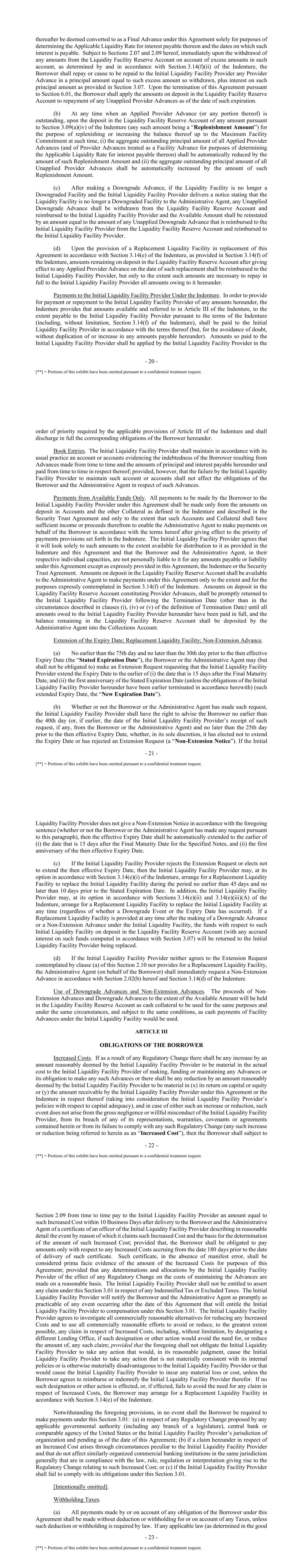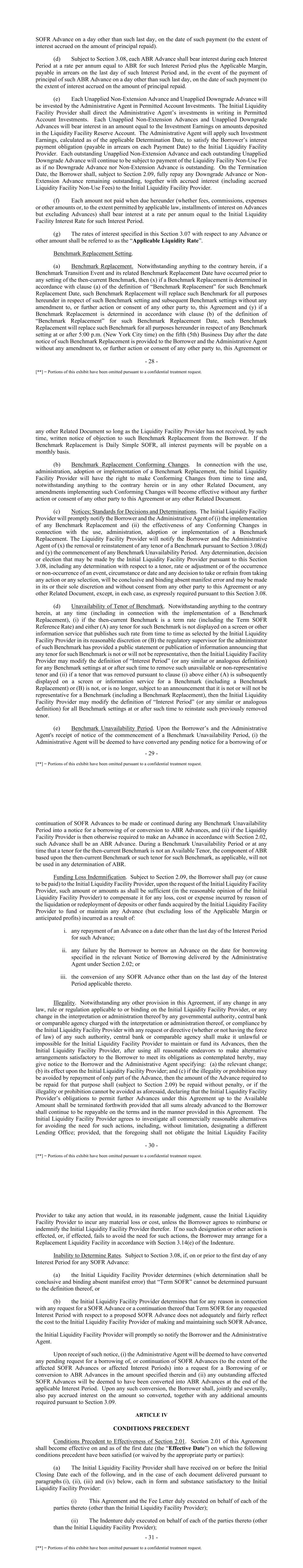 - 28 - [**] = Portions of this exhibit have been omitted pursuant to a confidential treatment request. SOFR Advance on a day other than such last day, on the date of such payment (to the extent of interest accrued on the amount of principal repaid). (d) Subject to Section 3.08, each ABR Advance shall bear interest during each Interest Period at a rate per annum equal to ABR for such Interest Period plus the Applicable Margin, payable in arrears on the last day of such Interest Period and, in the event of the payment of principal of such ABR Advance on a day other than such last day, on the date of such payment (to the extent of interest accrued on the amount of principal repaid. (e) Each Unapplied Non-Extension Advance and Unapplied Downgrade Advance will be invested by the Administrative Agent in Permitted Account Investments. The Initial Liquidity Facility Provider shall direct the Administrative Agent’s investments in writing in Permitted Account Investments. Each Unapplied Non-Extension Advances and Unapplied Downgrade Advances will bear interest in an amount equal to the Investment Earnings on amounts deposited in the Liquidity Facility Reserve Account. The Administrative Agent will apply such Investment Earnings, calculated as of the applicable Determination Date, to satisfy the Borrower’s interest payment obligation (payable in arrears on each Payment Date) to the Initial Liquidity Facility Provider. Each outstanding Unapplied Non-Extension Advance and each outstanding Unapplied Downgrade Advance will continue to be subject to payment of the Liquidity Facility Non-Use Fee as if no Downgrade Advance nor Non-Extension Advance is outstanding. On the Termination Date, the Borrower shall, subject to Section 2.09, fully repay any Downgrade Advance or Non- Extension Advance remaining outstanding, together with accrued interest (including accrued Liquidity Facility Non-Use Fees) to the Initial Liquidity Facility Provider. (f) Each amount not paid when due hereunder (whether fees, commissions, expenses or other amounts or, to the extent permitted by applicable law, installments of interest on Advances but excluding Advances) shall bear interest at a rate per annum equal to the Initial Liquidity Facility Interest Rate for such Interest Period. (g) The rates of interest specified in this Section 3.07 with respect to any Advance or other amount shall be referred to as the “Applicable Liquidity Rate”. Benchmark Replacement Setting. (a) Benchmark Replacement. Notwithstanding anything to the contrary herein, if a Benchmark Transition Event and its related Benchmark Replacement Date have occurred prior to any setting of the then-current Benchmark, then (x) if a Benchmark Replacement is determined in accordance with clause (a) of the definition of “Benchmark Replacement” for such Benchmark Replacement Date, such Benchmark Replacement will replace such Benchmark for all purposes hereunder in respect of such Benchmark setting and subsequent Benchmark settings without any amendment to, or further action or consent of any other party to, this Agreement and (y) if a Benchmark Replacement is determined in accordance with clause (b) of the definition of “Benchmark Replacement” for such Benchmark Replacement Date, such Benchmark Replacement will replace such Benchmark for all purposes hereunder in respect of any Benchmark setting at or after 5:00 p.m. (New York City time) on the fifth (5th) Business Day after the date notice of such Benchmark Replacement is provided to the Borrower and the Administrative Agent without any amendment to, or further action or consent of any other party to, this Agreement or - 29 - [**] = Portions of this exhibit have been omitted pursuant to a confidential treatment request. any other Related Document so long as the Liquidity Facility Provider has not received, by such time, written notice of objection to such Benchmark Replacement from the Borrower. If the Benchmark Replacement is Daily Simple SOFR, all interest payments will be payable on a monthly basis. (b) Benchmark Replacement Conforming Changes. In connection with the use, administration, adoption or implementation of a Benchmark Replacement, the Initial Liquidity Facility Provider will have the right to make Conforming Changes from time to time and, notwithstanding anything to the contrary herein or in any other Related Document, any amendments implementing such Conforming Changes will become effective without any further action or consent of any other party to this Agreement or any other Related Document. (c) Notices; Standards for Decisions and Determinations. The Initial Liquidity Facility Provider will promptly notify the Borrower and the Administrative Agent of (i) the implementation of any Benchmark Replacement and (ii) the effectiveness of any Conforming Changes in connection with the use, administration, adoption or implementation of a Benchmark Replacement. The Liquidity Facility Provider will notify the Borrower and the Administrative Agent of (x) the removal or reinstatement of any tenor of a Benchmark pursuant to Section 3.08(d) and (y) the commencement of any Benchmark Unavailability Period. Any determination, decision or election that may be made by the Initial Liquidity Facility Provider pursuant to this Section 3.08, including any determination with respect to a tenor, rate or adjustment or of the occurrence or non-occurrence of an event, circumstance or date and any decision to take or refrain from taking any action or any selection, will be conclusive and binding absent manifest error and may be made in its or their sole discretion and without consent from any other party to this Agreement or any other Related Document, except, in each case, as expressly required pursuant to this Section 3.08. (d) Unavailability of Tenor of Benchmark. Notwithstanding anything to the contrary herein, at any time (including in connection with the implementation of a Benchmark Replacement), (i) if the t