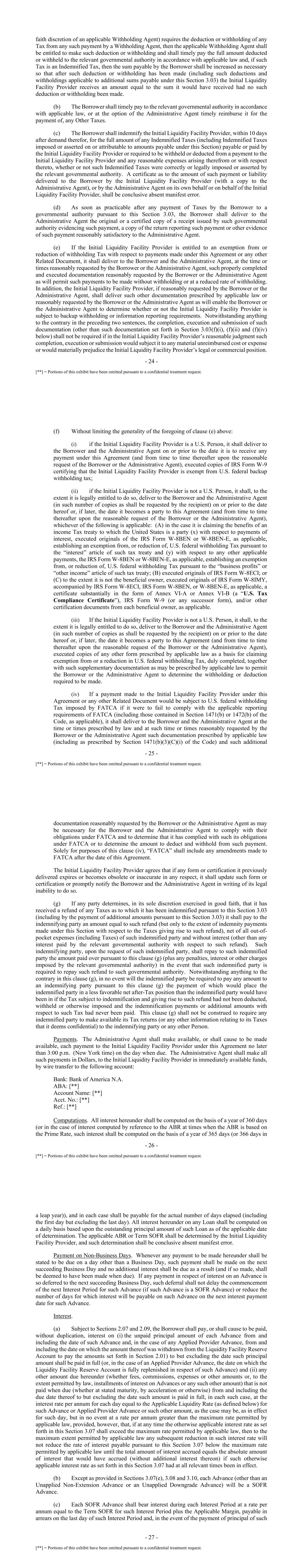 - 24 - [**] = Portions of this exhibit have been omitted pursuant to a confidential treatment request. faith discretion of an applicable Withholding Agent) requires the deduction or withholding of any Tax from any such payment by a Withholding Agent, then the applicable Withholding Agent shall be entitled to make such deduction or withholding and shall timely pay the full amount deducted or withheld to the relevant governmental authority in accordance with applicable law and, if such Tax is an Indemnified Tax, then the sum payable by the Borrower shall be increased as necessary so that after such deduction or withholding has been made (including such deductions and withholdings applicable to additional sums payable under this Section 3.03) the Initial Liquidity Facility Provider receives an amount equal to the sum it would have received had no such deduction or withholding been made. (b) The Borrower shall timely pay to the relevant governmental authority in accordance with applicable law, or at the option of the Administrative Agent timely reimburse it for the payment of, any Other Taxes. (c) The Borrower shall indemnify the Initial Liquidity Facility Provider, within 10 days after demand therefor, for the full amount of any Indemnified Taxes (including Indemnified Taxes imposed or asserted on or attributable to amounts payable under this Section) payable or paid by the Initial Liquidity Facility Provider or required to be withheld or deducted from a payment to the Initial Liquidity Facility Provider and any reasonable expenses arising therefrom or with respect thereto, whether or not such Indemnified Taxes were correctly or legally imposed or asserted by the relevant governmental authority. A certificate as to the amount of such payment or liability delivered to the Borrower by the Initial Liquidity Facility Provider (with a copy to the Administrative Agent), or by the Administrative Agent on its own behalf or on behalf of the Initial Liquidity Facility Provider, shall be conclusive absent manifest error. (d) As soon as practicable after any payment of Taxes by the Borrower to a governmental authority pursuant to this Section 3.03, the Borrower shall deliver to the Administrative Agent the original or a certified copy of a receipt issued by such governmental authority evidencing such payment, a copy of the return reporting such payment or other evidence of such payment reasonably satisfactory to the Administrative Agent. (e) If the Initial Liquidity Facility Provider is entitled to an exemption from or reduction of withholding Tax with respect to payments made under this Agreement or any other Related Document, it shall deliver to the Borrower and the Administrative Agent, at the time or times reasonably requested by the Borrower or the Administrative Agent, such properly completed and executed documentation reasonably requested by the Borrower or the Administrative Agent as will permit such payments to be made without withholding or at a reduced rate of withholding. In addition, the Initial Liquidity Facility Provider, if reasonably requested by the Borrower or the Administrative Agent, shall deliver such other documentation prescribed by applicable law or reasonably requested by the Borrower or the Administrative Agent as will enable the Borrower or the Administrative Agent to determine whether or not the Initial Liquidity Facility Provider is subject to backup withholding or information reporting requirements. Notwithstanding anything to the contrary in the preceding two sentences, the completion, execution and submission of such documentation (other than such documentation set forth in Section 3.03(f)(i), (f)(ii) and (f)(iv) below) shall not be required if in the Initial Liquidity Facility Provider’s reasonable judgment such completion, execution or submission would subject it to any material unreimbursed cost or expense or would materially prejudice the Initial Liquidity Facility Provider’s legal or commercial position. - 25 - [**] = Portions of this exhibit have been omitted pursuant to a confidential treatment request. (f) Without limiting the generality of the foregoing of clause (e) above: (i) if the Initial Liquidity Facility Provider is a U.S. Person, it shall deliver to the Borrower and the Administrative Agent on or prior to the date it is to receive any payment under this Agreement (and from time to time thereafter upon the reasonable request of the Borrower or the Administrative Agent), executed copies of IRS Form W-9 certifying that the Initial Liquidity Facility Provider is exempt from U.S. federal backup withholding tax; (ii) if the Initial Liquidity Facility Provider is not a U.S. Person, it shall, to the extent it is legally entitled to do so, deliver to the Borrower and the Administrative Agent (in such number of copies as shall be requested by the recipient) on or prior to the date hereof or, if later, the date it becomes a party to this Agreement (and from time to time thereafter upon the reasonable request of the Borrower or the Administrative Agent), whichever of the following is applicable: (A) in the case it is claiming the benefits of an income Tax treaty to which the United States is a party (x) with respect to payments of interest, executed originals of the IRS Form W-8BEN or W-8BEN-E, as applicable, establishing an exemption from, or reduction of, U.S. federal withholding Tax pursuant to the “interest” article of such tax treaty and (y) with respect to any other applicable payments, the IRS Form W-8BEN or W-8BEN-E, as applicable, establishing an exemption from, or reduction of, U.S. federal withholding Tax pursuant to the “business profits” or “other income” article of such tax treaty; (B) executed originals of IRS Form W-8ECI; or (C) to the extent it is not the beneficial owner, executed originals of IRS Form W-8IMY, accompanied by IRS Form W-8ECI, IRS Form W-8BEN, or W-8BEN-E, as applicable, a certificate substantially in the form of Ann