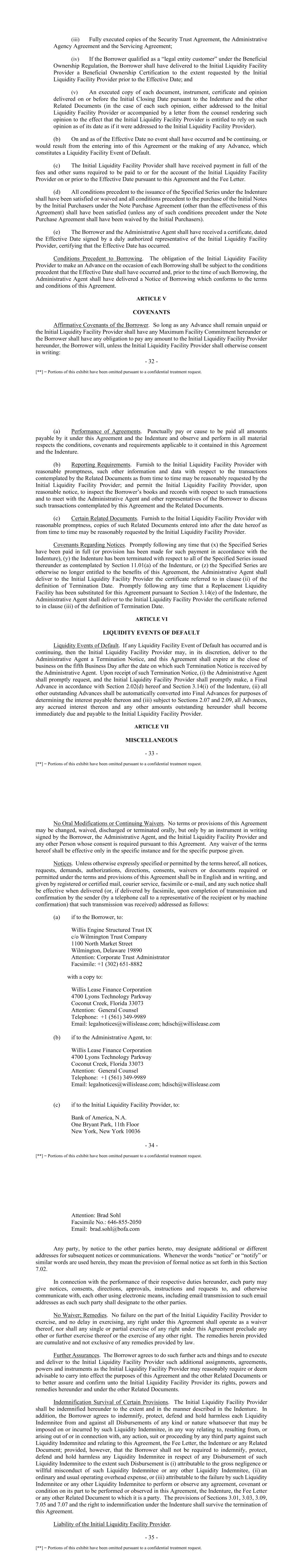 - 32 - [**] = Portions of this exhibit have been omitted pursuant to a confidential treatment request. (iii) Fully executed copies of the Security Trust Agreement, the Administrative Agency Agreement and the Servicing Agreement; (iv) If the Borrower qualified as a “legal entity customer” under the Beneficial Ownership Regulation, the Borrower shall have delivered to the Initial Liquidity Facility Provider a Beneficial Ownership Certification to the extent requested by the Initial Liquidity Facility Provider prior to the Effective Date; and (v) An executed copy of each document, instrument, certificate and opinion delivered on or before the Initial Closing Date pursuant to the Indenture and the other Related Documents (in the case of each such opinion, either addressed to the Initial Liquidity Facility Provider or accompanied by a letter from the counsel rendering such opinion to the effect that the Initial Liquidity Facility Provider is entitled to rely on such opinion as of its date as if it were addressed to the Initial Liquidity Facility Provider). (b) On and as of the Effective Date no event shall have occurred and be continuing, or would result from the entering into of this Agreement or the making of any Advance, which constitutes a Liquidity Facility Event of Default. (c) The Initial Liquidity Facility Provider shall have received payment in full of the fees and other sums required to be paid to or for the account of the Initial Liquidity Facility Provider on or prior to the Effective Date pursuant to this Agreement and the Fee Letter. (d) All conditions precedent to the issuance of the Specified Series under the Indenture shall have been satisfied or waived and all conditions precedent to the purchase of the Initial Notes by the Initial Purchasers under the Note Purchase Agreement (other than the effectiveness of this Agreement) shall have been satisfied (unless any of such conditions precedent under the Note Purchase Agreement shall have been waived by the Initial Purchasers). (e) The Borrower and the Administrative Agent shall have received a certificate, dated the Effective Date signed by a duly authorized representative of the Initial Liquidity Facility Provider, certifying that the Effective Date has occurred. Conditions Precedent to Borrowing. The obligation of the Initial Liquidity Facility Provider to make an Advance on the occasion of each Borrowing shall be subject to the conditions precedent that the Effective Date shall have occurred and, prior to the time of such Borrowing, the Administrative Agent shall have delivered a Notice of Borrowing which conforms to the terms and conditions of this Agreement. ARTICLE V COVENANTS Affirmative Covenants of the Borrower. So long as any Advance shall remain unpaid or the Initial Liquidity Facility Provider shall have any Maximum Facility Commitment hereunder or the Borrower shall have any obligation to pay any amount to the Initial Liquidity Facility Provider hereunder, the Borrower will, unless the Initial Liquidity Facility Provider shall otherwise consent in writing: - 33 - [**] = Portions of this exhibit have been omitted pursuant to a confidential treatment request. (a) Performance of Agreements. Punctually pay or cause to be paid all amounts payable by it under this Agreement and the Indenture and observe and perform in all material respects the conditions, covenants and requirements applicable to it contained in this Agreement and the Indenture. (b) Reporting Requirements. Furnish to the Initial Liquidity Facility Provider with reasonable promptness, such other information and data with respect to the transactions contemplated by the Related Documents as from time to time may be reasonably requested by the Initial Liquidity Facility Provider; and permit the Initial Liquidity Facility Provider, upon reasonable notice, to inspect the Borrower’s books and records with respect to such transactions and to meet with the Administrative Agent and other representatives of the Borrower to discuss such transactions contemplated by this Agreement and the Related Documents. (c) Certain Related Documents. Furnish to the Initial Liquidity Facility Provider with reasonable promptness, copies of such Related Documents entered into after the date hereof as from time to time may be reasonably requested by the Initial Liquidity Facility Provider. Covenants Regarding Notices. Promptly following any time that (x) the Specified Series have been paid in full (or provision has been made for such payment in accordance with the Indenture), (y) the Indenture has been terminated with respect to all of the Specified Series issued thereunder as contemplated by Section 11.01(a) of the Indenture, or (z) the Specified Series are otherwise no longer entitled to the benefits of this Agreement, the Administrative Agent shall deliver to the Initial Liquidity Facility Provider the certificate referred to in clause (ii) of the definition of Termination Date. Promptly following any time that a Replacement Liquidity Facility has been substituted for this Agreement pursuant to Section 3.14(e) of the Indenture, the Administrative Agent shall deliver to the Initial Liquidity Facility Provider the certificate referred to in clause (iii) of the definition of Termination Date. ARTICLE VI LIQUIDITY EVENTS OF DEFAULT Liquidity Events of Default. If any Liquidity Facility Event of Default has occurred and is continuing, then the Initial Liquidity Facility Provider may, in its discretion, deliver to the Administrative Agent a Termination Notice, and this Agreement shall expire at the close of business on the fifth Business Day after the date on which such Termination Notice is received by the Administrative Agent. Upon receipt of such Termination Notice, (i) the Administrative Agent shall promptly request, and the Initial Liquidity Facility Provider shall promptly make, a Final Advance in accordance with Section 2.02(d) hereof and Section 3.14(i) of the Indenture, (ii