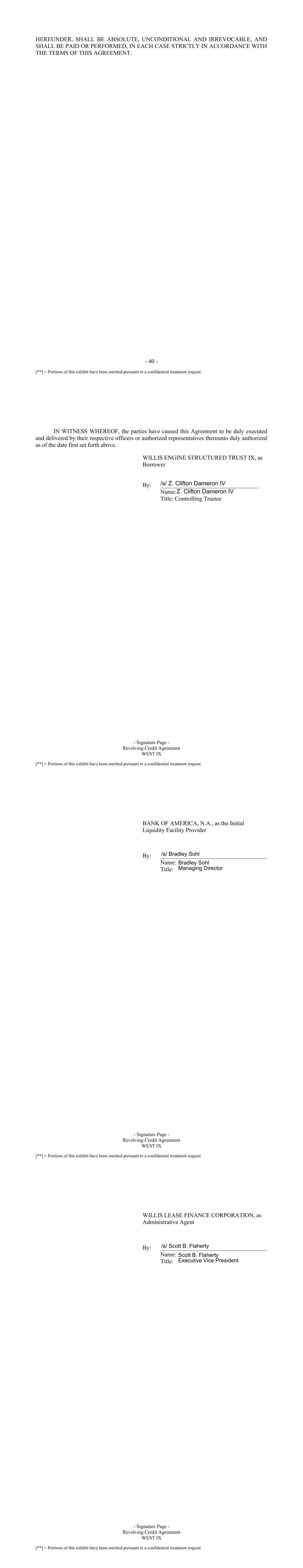 - 40 - [**] = Portions of this exhibit have been omitted pursuant to a confidential treatment request. HEREUNDER, SHALL BE ABSOLUTE, UNCONDITIONAL AND IRREVOCABLE, AND SHALL BE PAID OR PERFORMED, IN EACH CASE STRICTLY IN ACCORDANCE WITH THE TERMS OF THIS AGREEMENT. - Signature Page - Revolving Credit Agreement WEST IX [**] = Portions of this exhibit have been omitted pursuant to a confidential treatment request. IN WITNESS WHEREOF, the parties have caused this Agreement to be duly executed and delivered by their respective officers or authorized representatives thereunto duly authorized as of the date first set forth above. WILLIS ENGINE STRUCTURED TRUST IX, as Borrower By: _________________________________ Name: Title: Controlling Trustee /s/ Z. Clifton Dameron IV Z. Clifton Dameron IV - Signature Page - Revolving Credit Agreement WEST IX [**] = Portions of this exhibit have been omitted pursuant to a confidential treatment request. BANK OF AMERICA, N.A., as the Initial Liquidity Facility Provider By: ____________________________________ Name: Title: /s/ Bradley Sohl Bradley Sohl Managing Director - Signature Page - Revolving Credit Agreement WEST IX [**] = Portions of this exhibit have been omitted pursuant to a confidential treatment request. WILLIS LEASE FINANCE CORPORATION, as Administrative Agent By: ____________________________________ Name: Title: /s/ Scott B. Flaherty Scott B. Flaherty Executive Vice President