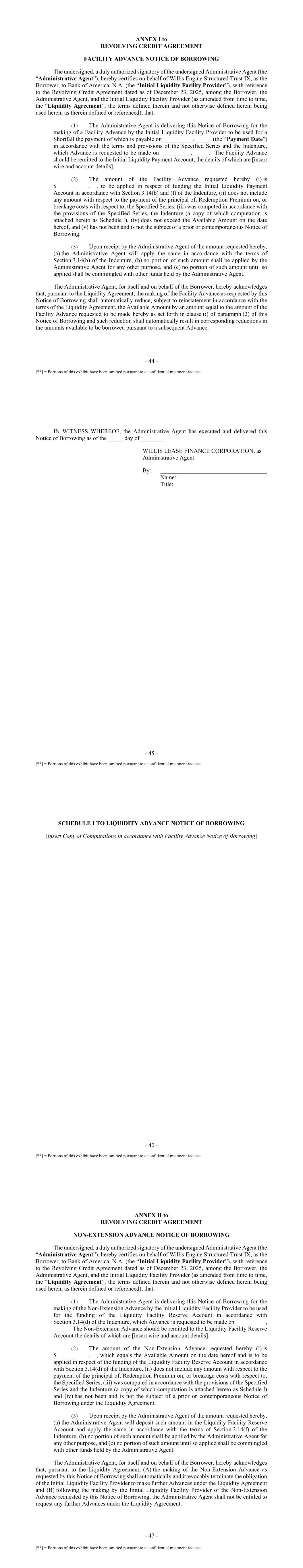 - 44 - [**] = Portions of this exhibit have been omitted pursuant to a confidential treatment request. ANNEX I to REVOLVING CREDIT AGREEMENT FACILITY ADVANCE NOTICE OF BORROWING The undersigned, a duly authorized signatory of the undersigned Administrative Agent (the “Administrative Agent”), hereby certifies on behalf of Willis Engine Structured Trust IX, as the Borrower, to Bank of America, N.A. (the “Initial Liquidity Facility Provider”), with reference to the Revolving Credit Agreement dated as of December 23, 2025, among the Borrower, the Administrative Agent, and the Initial Liquidity Facility Provider (as amended from time to time, the “Liquidity Agreement”; the terms defined therein and not otherwise defined herein being used herein as therein defined or referenced), that: (1) The Administrative Agent is delivering this Notice of Borrowing for the making of a Facility Advance by the Initial Liquidity Facility Provider to be used for a Shortfall the payment of which is payable on __________, _____ (the “Payment Date”) in accordance with the terms and provisions of the Specified Series and the Indenture, which Advance is requested to be made on __________, _____. The Facility Advance should be remitted to the Initial Liquidity Payment Account, the details of which are [insert wire and account details]. (2) The amount of the Facility Advance requested hereby (i) is $___________.__, to be applied in respect of funding the Initial Liquidity Payment Account in accordance with Section 3.14(b) and (f) of the Indenture, (ii) does not include any amount with respect to the payment of the principal of, Redemption Premium on, or breakage costs with respect to, the Specified Series, (iii) was computed in accordance with the provisions of the Specified Series, the Indenture (a copy of which computation is attached hereto as Schedule I), (iv) does not exceed the Available Amount on the date hereof, and (v) has not been and is not the subject of a prior or contemporaneous Notice of Borrowing. (3) Upon receipt by the Administrative Agent of the amount requested hereby, (a) the Administrative Agent will apply the same in accordance with the terms of Section 3.14(b) of the Indenture, (b) no portion of such amount shall be applied by the Administrative Agent for any other purpose, and (c) no portion of such amount until so applied shall be commingled with other funds held by the Administrative Agent. The Administrative Agent, for itself and on behalf of the Borrower, hereby acknowledges that, pursuant to the Liquidity Agreement, the making of the Facility Advance as requested by this Notice of Borrowing shall automatically reduce, subject to reinstatement in accordance with the terms of the Liquidity Agreement, the Available Amount by an amount equal to the amount of the Facility Advance requested to be made hereby as set forth in clause (i) of paragraph (2) of this Notice of Borrowing and such reduction shall automatically result in corresponding reductions in the amounts available to be borrowed pursuant to a subsequent Advance. - 45 - [**] = Portions of this exhibit have been omitted pursuant to a confidential treatment request. IN WITNESS WHEREOF, the Administrative Agent has executed and delivered this Notice of Borrowing as of the _____ day of________ WILLIS LEASE FINANCE CORPORATION, as Administrative Agent By: ____________________________________ Name: Title: - 40 - [**] = Portions of this exhibit have been omitted pursuant to a confidential treatment request. SCHEDULE I TO LIQUIDITY ADVANCE NOTICE OF BORROWING [Insert Copy of Computations in accordance with Facility Advance Notice of Borrowing] - 47 - [**] = Portions of this exhibit have been omitted pursuant to a confidential treatment request. ANNEX II to REVOLVING CREDIT AGREEMENT NON-EXTENSION ADVANCE NOTICE OF BORROWING The undersigned, a duly authorized signatory of the undersigned Administrative Agent (the “Administrative Agent”), hereby certifies on behalf of Willis Engine Structured Trust IX, as the Borrower, to Bank of America, N.A. (the “Initial Liquidity Facility Provider”), with reference to the Revolving Credit Agreement dated as of December 23, 2025, among the Borrower, the Administrative Agent, and the Initial Liquidity Facility Provider (as amended from time to time, the “Liquidity Agreement”; the terms defined therein and not otherwise defined herein being used herein as therein defined or referenced), that: (1) The Administrative Agent is delivering this Notice of Borrowing for the making of the Non-Extension Advance by the Initial Liquidity Facility Provider to be used for the funding of the Liquidity Facility Reserve Account in accordance with Section 3.14(d) of the Indenture, which Advance is requested to be made on __________, _____. The Non-Extension Advance should be remitted to the Liquidity Facility Reserve Account the details of which are [insert wire and account details]. (2) The amount of the Non-Extension Advance requested hereby (i) is $___________.__, which equals the Available Amount on the date hereof and is to be applied in respect of the funding of the Liquidity Facility Reserve Account in accordance with Section 3.14(d) of the Indenture, (ii) does not include any amount with respect to the payment of the principal of, Redemption Premium on, or breakage costs with respect to, the Specified Series, (iii) was computed in accordance with the provisions of the Specified Series and the Indenture (a copy of which computation is attached hereto as Schedule I) and (iv) has not been and is not the subject of a prior or contemporaneous Notice of Borrowing under the Liquidity Agreement. (3) Upon receipt by the Administrative Agent of the amount requested hereby, (a) the Administrative Agent will deposit such amount in the Liquidity Facility Reserve Account and apply the same in accordance with the terms of Section 3.14(f) of the Indenture, (b) no portion of such amount shall be applied by