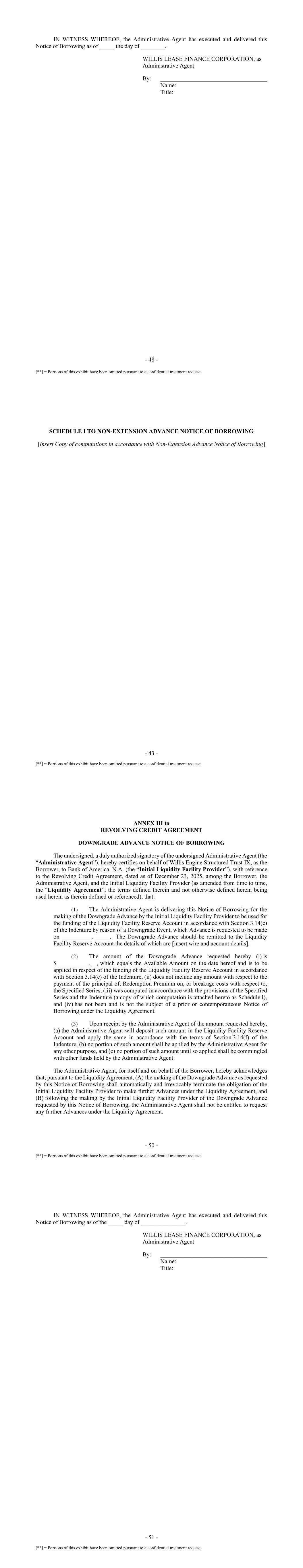 - 48 - [**] = Portions of this exhibit have been omitted pursuant to a confidential treatment request. IN WITNESS WHEREOF, the Administrative Agent has executed and delivered this Notice of Borrowing as of _____ the day of ________. WILLIS LEASE FINANCE CORPORATION, as Administrative Agent By: ____________________________________ Name: Title: - 43 - [**] = Portions of this exhibit have been omitted pursuant to a confidential treatment request. SCHEDULE I TO NON-EXTENSION ADVANCE NOTICE OF BORROWING [Insert Copy of computations in accordance with Non-Extension Advance Notice of Borrowing] - 50 - [**] = Portions of this exhibit have been omitted pursuant to a confidential treatment request. ANNEX III to REVOLVING CREDIT AGREEMENT DOWNGRADE ADVANCE NOTICE OF BORROWING The undersigned, a duly authorized signatory of the undersigned Administrative Agent (the “Administrative Agent”), hereby certifies on behalf of Willis Engine Structured Trust IX, as the Borrower, to Bank of America, N.A. (the “Initial Liquidity Facility Provider”), with reference to the Revolving Credit Agreement, dated as of December 23, 2025, among the Borrower, the Administrative Agent, and the Initial Liquidity Facility Provider (as amended from time to time, the “Liquidity Agreement”; the terms defined therein and not otherwise defined herein being used herein as therein defined or referenced), that: (1) The Administrative Agent is delivering this Notice of Borrowing for the making of the Downgrade Advance by the Initial Liquidity Facility Provider to be used for the funding of the Liquidity Facility Reserve Account in accordance with Section 3.14(c) of the Indenture by reason of a Downgrade Event, which Advance is requested to be made on __________, _____. The Downgrade Advance should be remitted to the Liquidity Facility Reserve Account the details of which are [insert wire and account details]. (2) The amount of the Downgrade Advance requested hereby (i) is $___________.__, which equals the Available Amount on the date hereof and is to be applied in respect of the funding of the Liquidity Facility Reserve Account in accordance with Section 3.14(c) of the Indenture, (ii) does not include any amount with respect to the payment of the principal of, Redemption Premium on, or breakage costs with respect to, the Specified Series, (iii) was computed in accordance with the provisions of the Specified Series and the Indenture (a copy of which computation is attached hereto as Schedule I), and (iv) has not been and is not the subject of a prior or contemporaneous Notice of Borrowing under the Liquidity Agreement. (3) Upon receipt by the Administrative Agent of the amount requested hereby, (a) the Administrative Agent will deposit such amount in the Liquidity Facility Reserve Account and apply the same in accordance with the terms of Section 3.14(f) of the Indenture, (b) no portion of such amount shall be applied by the Administrative Agent for any other purpose, and (c) no portion of such amount until so applied shall be commingled with other funds held by the Administrative Agent. The Administrative Agent, for itself and on behalf of the Borrower, hereby acknowledges that, pursuant to the Liquidity Agreement, (A) the making of the Downgrade Advance as requested by this Notice of Borrowing shall automatically and irrevocably terminate the obligation of the Initial Liquidity Facility Provider to make further Advances under the Liquidity Agreement, and (B) following the making by the Initial Liquidity Facility Provider of the Downgrade Advance requested by this Notice of Borrowing, the Administrative Agent shall not be entitled to request any further Advances under the Liquidity Agreement. - 51 - [**] = Portions of this exhibit have been omitted pursuant to a confidential treatment request. IN WITNESS WHEREOF, the Administrative Agent has executed and delivered this Notice of Borrowing as of the _____ day of _______________. WILLIS LEASE FINANCE CORPORATION, as Administrative Agent By: ____________________________________ Name: Title: