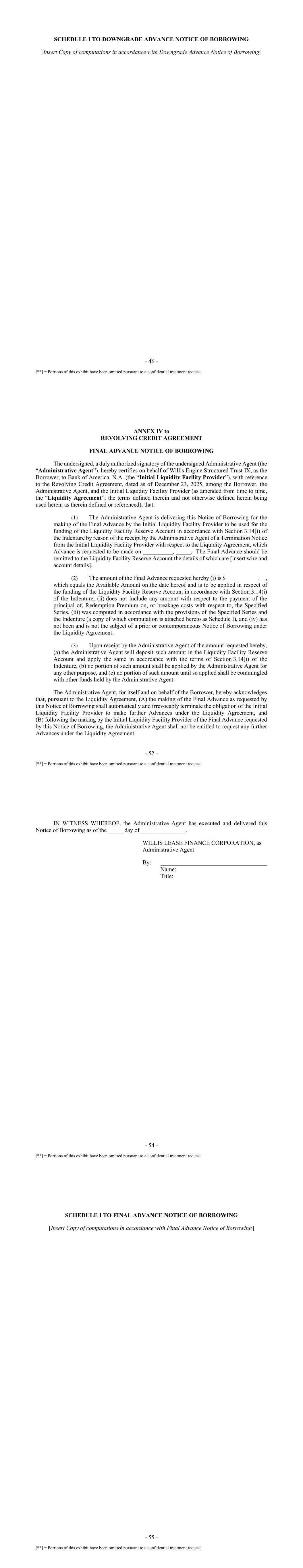 - 46 - [**] = Portions of this exhibit have been omitted pursuant to a confidential treatment request. SCHEDULE I TO DOWNGRADE ADVANCE NOTICE OF BORROWING [Insert Copy of computations in accordance with Downgrade Advance Notice of Borrowing] - 52 - [**] = Portions of this exhibit have been omitted pursuant to a confidential treatment request. ANNEX IV to REVOLVING CREDIT AGREEMENT FINAL ADVANCE NOTICE OF BORROWING The undersigned, a duly authorized signatory of the undersigned Administrative Agent (the “Administrative Agent”), hereby certifies on behalf of Willis Engine Structured Trust IX, as the Borrower, to Bank of America, N.A. (the “Initial Liquidity Facility Provider”), with reference to the Revolving Credit Agreement, dated as of December 23, 2025, among the Borrower, the Administrative Agent, and the Initial Liquidity Facility Provider (as amended from time to time, the “Liquidity Agreement”; the terms defined therein and not otherwise defined herein being used herein as therein defined or referenced), that: (1) The Administrative Agent is delivering this Notice of Borrowing for the making of the Final Advance by the Initial Liquidity Facility Provider to be used for the funding of the Liquidity Facility Reserve Account in accordance with Section 3.14(i) of the Indenture by reason of the receipt by the Administrative Agent of a Termination Notice from the Initial Liquidity Facility Provider with respect to the Liquidity Agreement, which Advance is requested to be made on __________, _____. The Final Advance should be remitted to the Liquidity Facility Reserve Account the details of which are [insert wire and account details]. (2) The amount of the Final Advance requested hereby (i) is $___________.__, which equals the Available Amount on the date hereof and is to be applied in respect of the funding of the Liquidity Facility Reserve Account in accordance with Section 3.14(i) of the Indenture, (ii) does not include any amount with respect to the payment of the principal of, Redemption Premium on, or breakage costs with respect to, the Specified Series, (iii) was computed in accordance with the provisions of the Specified Series and the Indenture (a copy of which computation is attached hereto as Schedule I), and (iv) has not been and is not the subject of a prior or contemporaneous Notice of Borrowing under the Liquidity Agreement. (3) Upon receipt by the Administrative Agent of the amount requested hereby, (a) the Administrative Agent will deposit such amount in the Liquidity Facility Reserve Account and apply the same in accordance with the terms of Section 3.14(i) of the Indenture, (b) no portion of such amount shall be applied by the Administrative Agent for any other purpose, and (c) no portion of such amount until so applied shall be commingled with other funds held by the Administrative Agent. The Administrative Agent, for itself and on behalf of the Borrower, hereby acknowledges that, pursuant to the Liquidity Agreement, (A) the making of the Final Advance as requested by this Notice of Borrowing shall automatically and irrevocably terminate the obligation of the Initial Liquidity Facility Provider to make further Advances under the Liquidity Agreement, and (B) following the making by the Initial Liquidity Facility Provider of the Final Advance requested by this Notice of Borrowing, the Administrative Agent shall not be entitled to request any further Advances under the Liquidity Agreement. - 54 - [**] = Portions of this exhibit have been omitted pursuant to a confidential treatment request. IN WITNESS WHEREOF, the Administrative Agent has executed and delivered this Notice of Borrowing as of the _____ day of _______________. WILLIS LEASE FINANCE CORPORATION, as Administrative Agent By: ____________________________________ Name: Title: - 55 - [**] = Portions of this exhibit have been omitted pursuant to a confidential treatment request. SCHEDULE I TO FINAL ADVANCE NOTICE OF BORROWING [Insert Copy of computations in accordance with Final Advance Notice of Borrowing]