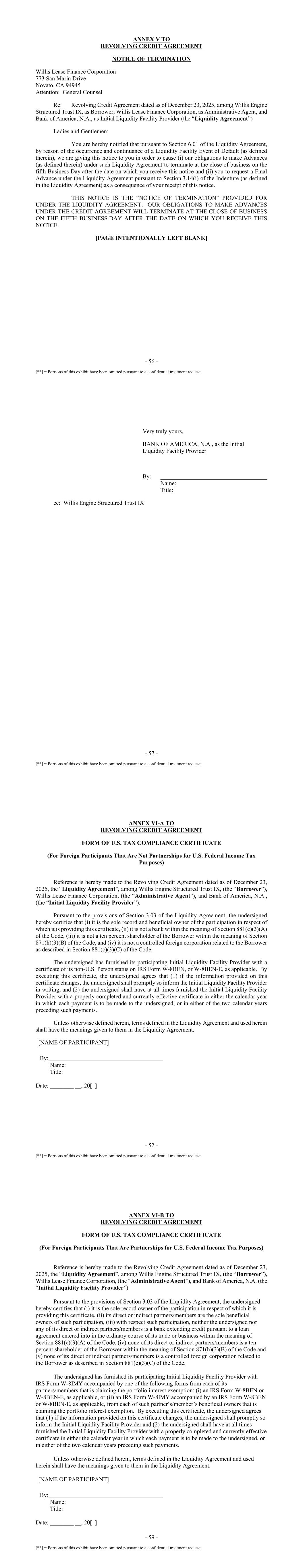 - 56 - [**] = Portions of this exhibit have been omitted pursuant to a confidential treatment request. ANNEX V TO REVOLVING CREDIT AGREEMENT NOTICE OF TERMINATION Willis Lease Finance Corporation 773 San Marin Drive Novato, CA 94945 Attention: General Counsel Re: Revolving Credit Agreement dated as of December 23, 2025, among Willis Engine Structured Trust IX, as Borrower, Willis Lease Finance Corporation, as Administrative Agent, and Bank of America, N.A., as Initial Liquidity Facility Provider (the “Liquidity Agreement”) Ladies and Gentlemen: You are hereby notified that pursuant to Section 6.01 of the Liquidity Agreement, by reason of the occurrence and continuance of a Liquidity Facility Event of Default (as defined therein), we are giving this notice to you in order to cause (i) our obligations to make Advances (as defined therein) under such Liquidity Agreement to terminate at the close of business on the fifth Business Day after the date on which you receive this notice and (ii) you to request a Final Advance under the Liquidity Agreement pursuant to Section 3.14(i) of the Indenture (as defined in the Liquidity Agreement) as a consequence of your receipt of this notice. THIS NOTICE IS THE “NOTICE OF TERMINATION” PROVIDED FOR UNDER THE LIQUIDITY AGREEMENT. OUR OBLIGATIONS TO MAKE ADVANCES UNDER THE CREDIT AGREEMENT WILL TERMINATE AT THE CLOSE OF BUSINESS ON THE FIFTH BUSINESS DAY AFTER THE DATE ON WHICH YOU RECEIVE THIS NOTICE. [PAGE INTENTIONALLY LEFT BLANK] - 57 - [**] = Portions of this exhibit have been omitted pursuant to a confidential treatment request. Very truly yours, BANK OF AMERICA, N.A., as the Initial Liquidity Facility Provider By: ____________________________________ Name: Title: cc: Willis Engine Structured Trust IX - 52 - [**] = Portions of this exhibit have been omitted pursuant to a confidential treatment request. ANNEX VI-A TO REVOLVING CREDIT AGREEMENT FORM OF U.S. TAX COMPLIANCE CERTIFICATE (For Foreign Participants That Are Not Partnerships for U.S. Federal Income Tax Purposes) Reference is hereby made to the Revolving Credit Agreement dated as of December 23, 2025, the “Liquidity Agreement”, among Willis Engine Structured Trust IX, (the “Borrower”), Willis Lease Finance Corporation, (the “Administrative Agent”), and Bank of America, N.A., (the “Initial Liquidity Facility Provider”). Pursuant to the provisions of Section 3.03 of the Liquidity Agreement, the undersigned hereby certifies that (i) it is the sole record and beneficial owner of the participation in respect of which it is providing this certificate, (ii) it is not a bank within the meaning of Section 881(c)(3)(A) of the Code, (iii) it is not a ten percent shareholder of the Borrower within the meaning of Section 871(h)(3)(B) of the Code, and (iv) it is not a controlled foreign corporation related to the Borrower as described in Section 881(c)(3)(C) of the Code. The undersigned has furnished its participating Initial Liquidity Facility Provider with a certificate of its non-U.S. Person status on IRS Form W-8BEN, or W-8BEN-E, as applicable. By executing this certificate, the undersigned agrees that (1) if the information provided on this certificate changes, the undersigned shall promptly so inform the Initial Liquidity Facility Provider in writing, and (2) the undersigned shall have at all times furnished the Initial Liquidity Facility Provider with a properly completed and currently effective certificate in either the calendar year in which each payment is to be made to the undersigned, or in either of the two calendar years preceding such payments. Unless otherwise defined herein, terms defined in the Liquidity Agreement and used herein shall have the meanings given to them in the Liquidity Agreement. [NAME OF PARTICIPANT] By: Name: Title: Date: ________ __, 20[ ] - 59 - [**] = Portions of this exhibit have been omitted pursuant to a confidential treatment request. ANNEX VI-B TO REVOLVING CREDIT AGREEMENT FORM OF U.S. TAX COMPLIANCE CERTIFICATE (For Foreign Participants That Are Partnerships for U.S. Federal Income Tax Purposes) Reference is hereby made to the Revolving Credit Agreement dated as of December 23, 2025, the “Liquidity Agreement”, among Willis Engine Structured Trust IX, (the “Borrower”), Willis Lease Finance Corporation, (the “Administrative Agent”), and Bank of America, N.A. (the “Initial Liquidity Facility Provider”). Pursuant to the provisions of Section 3.03 of the Liquidity Agreement, the undersigned hereby certifies that (i) it is the sole record owner of the participation in respect of which it is providing this certificate, (ii) its direct or indirect partners/members are the sole beneficial owners of such participation, (iii) with respect such participation, neither the undersigned nor any of its direct or indirect partners/members is a bank extending credit pursuant to a loan agreement entered into in the ordinary course of its trade or business within the meaning of Section 881(c)(3)(A) of the Code, (iv) none of its direct or indirect partners/members is a ten percent shareholder of the Borrower within the meaning of Section 871(h)(3)(B) of the Code and (v) none of its direct or indirect partners/members is a controlled foreign corporation related to the Borrower as described in Section 881(c)(3)(C) of the Code. The undersigned has furnished its participating Initial Liquidity Facility Provider with IRS Form W-8IMY accompanied by one of the following forms from each of its partners/members that is claiming the portfolio interest exemption: (i) an IRS Form W-8BEN or W-8BEN-E, as applicable, or (ii) an IRS Form W-8IMY accompanied by an IRS Form W-8BEN or W-8BEN-E, as applicable, from each of such partner’s/member’s beneficial owners that is claiming the portfolio interest exemption. By executing this certificate, the undersigned agrees that (1) if the information provided on this certificate changes, the undersigned shall promptly