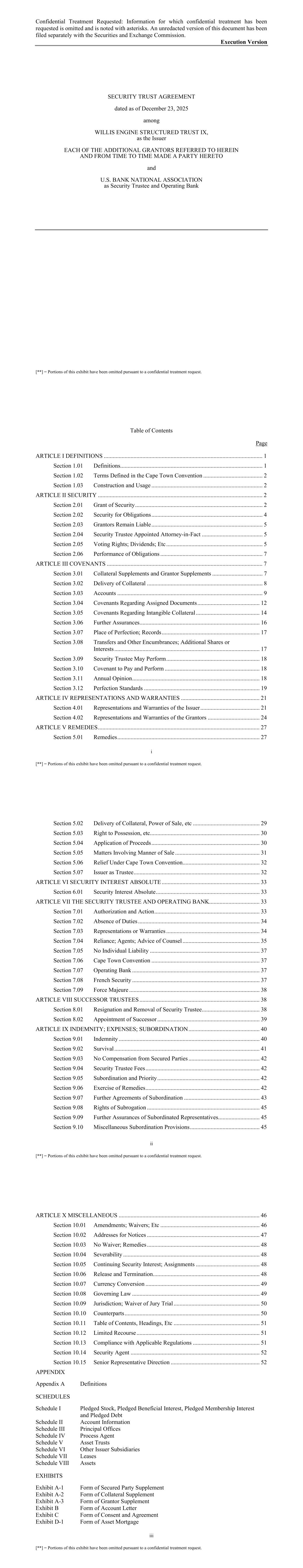 iv [**] = Portions of this exhibit have been omitted pursuant to a confidential treatment request. Exhibit D-2 Form of Asset Mortgage and Lease Security Assignment Exhibit D-3 Form of Lease Security Assignment Exhibit E Form of FAA Opinion 1 [**] = Portions of this exhibit have been omitted pursuant to a confidential treatment request. SECURITY TRUST AGREEMENT This SECURITY TRUST AGREEMENT (as amended, supplemented and otherwise modified from time to time, this “Agreement”), dated as of December 23, 2025, is made by and among WILLIS ENGINE STRUCTURED TRUST IX, a Delaware statutory trust (the “Issuer”), each of the ISSUER SUBSIDIARIES (including each Asset Trust) party hereto from time to time as a grantor (such Issuer Subsidiaries, together with the Issuer, the “Grantors”), and U.S. BANK NATIONAL ASSOCIATION, a national banking association (“USB”), as Security Trustee (in such capacity, the “Security Trustee”) and Operating Bank (in such capacity, the “Operating Bank”). WITNESSETH THAT: WHEREAS, the Issuer and USB, as Trustee, among others, entered into a Trust Indenture, dated as of December 23, 2025 (as amended, supplemented and otherwise modified from time to time, the “Indenture”); WHEREAS, pursuant to the Indenture, the Issuer is issuing the Initial Notes; WHEREAS, the Issuer is the owner, directly or indirectly, of all of the beneficial, membership and equity interests, as applicable, in the Asset Trusts and the other Issuer Subsidiaries, including any Subsidiary of the Issuer that becomes a party to this Agreement by the execution and delivery of a Grantor Supplement; WHEREAS, in order to secure the payment of the Notes by the Issuer and the payment and performance of all obligations of the Issuer and the other Grantors under the Related Documents, the Issuer and the other Grantors are entering into this Agreement to grant a security interest in the Collateral in favor of the Security Trustee for the benefit of the Secured Parties; WHEREAS, each Grantor will derive substantial direct and indirect benefit from the issuance of the Notes by the Issuer and from the execution, delivery and performance of the Related Documents, whether or not such Grantor is a party thereto; and WHEREAS, it is a condition precedent to the issuance of the Notes by the Issuer and the making of any Loans to the Issuer that each Grantor grant the security interests contemplated by this Agreement; NOW, THEREFORE, in consideration of the foregoing, and for other good and valuable consideration, the receipt and sufficiency of which is hereby acknowledged each Grantor hereby agrees with the Security Trustee, for its benefit and for the benefit of the other Secured Parties, as follows: ARTICLE I DEFINITIONS Definitions. For all purposes of this Agreement, the capitalized terms set forth in Appendix A shall have the meanings specified therein, and all other capitalized terms used, but 2 [**] = Portions of this exhibit have been omitted pursuant to a confidential treatment request. not defined, in this Agreement shall have the respective meanings assigned to such terms in the Indenture. Terms Defined in the Cape Town Convention. The following terms shall have the respective meanings ascribed thereto in the Cape Town Convention: “Administrator”, “Aircraft Object”; “associated rights”, “Contracting State”, “Contract of Sale”, “International Interest”, “International Registry”; “power to dispose”, “Professional User Entity”, “Prospective Sale”, “Prospective International Interest”, “situated in” and “Transacting User Entity”. Construction and Usage. The conventions of construction and usage set forth in Section 1.02 of the Indenture are hereby incorporated by reference in this Agreement. ARTICLE II SECURITY Grant of Security. To secure the payment and performance of the Secured Obligations, each Grantor hereby grants, assigns, conveys, mortgages, pledges, hypothecates and transfers to the Security Trustee, for the benefit of the Secured Parties (except as limited by the proviso at the end of this section in respect of certain Secured Parties in their capacity as Collateral Obligors), a security interest in and to all of such Grantor’s right, title and interest in, to and under the following, whether now existing or hereafter created or acquired: (a) with respect to such Grantor, all of such Grantor's right, title and interest in and to the following (the “Asset Collateral”): (i) each Asset and Part as the same is now and will hereafter be constituted, and in the case of any such Asset that is an Engine or Part, whether or not any such Engine or Part shall be installed in or attached to any Airframe, aircraft or Engine, and including in each case all Aircraft Objects and all Related Asset Documents in respect of each such Asset and Part; (ii) all proceeds from the sale or other disposition of, all proceeds of insurance due to such Grantor on, and all proceeds of the total or partial loss or physical destruction, confiscation, condemnation or requisition due to such Grantor with respect to, each such Asset and all Parts, equipment, attachments, accessories, replacement and added Parts and components described in the preceding clause (i); (iii) each Lease of an Asset, whether or not owned by such Grantor, under which such Grantor is or may from time to time be the lessor, together with any and all such Related Asset Documents relating to such Lease (any such Leases, together with all Related Asset Documents, an “Assigned Lease”), including without limitation (A) all rights of such Grantor to all Lease Payments, however denominated, under such Assigned Leases, (B) all rights of such Grantor to receive proceeds of any insurance, indemnity, warranty or guaranty pursuant to or with respect to such Assigned Leases, (C) claims of such Grantor for damages arising out of or for breach or default under such Assigned Leases, (D) all rights o