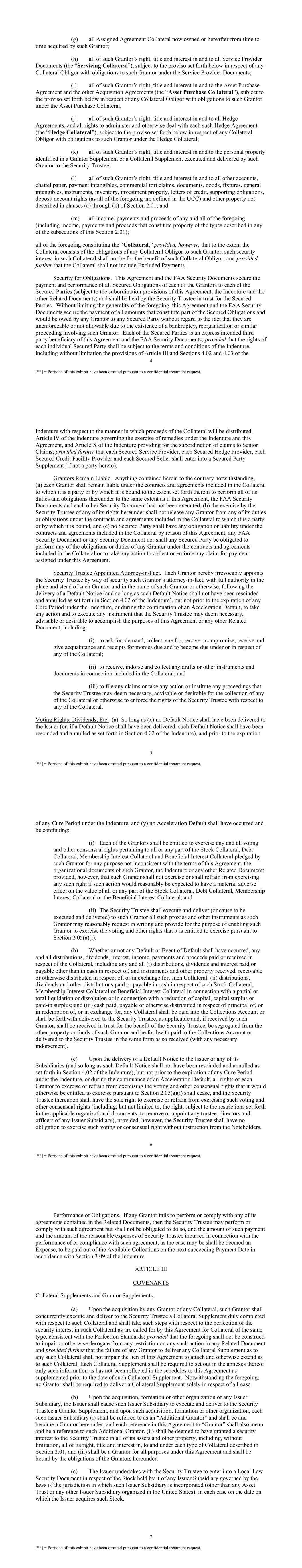 12 [**] = Portions of this exhibit have been omitted pursuant to a confidential treatment request. (B) Each Grantor shall immediately instruct each Obligor to make any Lease Payment not required, as provided in Section 3.03(b)(i), to be made to a Security Trustee Account to a Lessor Account meeting the requirements of Section 3.03(b)(ii)(A). (C) Upon any termination of any Account Letter, Local Law Security Document or other agreement with respect to the maintenance of a Lessor Account by any Grantor or any Lessor Account Bank or other bank or financial institution pursuant to clause (ii)(A) above, such Grantor shall immediately notify all Obligors that were making payments to such Lessor Account to make all future payments to another Account meeting the requirements of this Section 3.03(b)(ii). Subject to the terms of any Lease, upon request by the Security Trustee, each Grantor shall, and if prohibited from doing so by the terms of any Lease, shall use commercially reasonable efforts to seek the consent of the relevant Lessee to, terminate any or all of its Lessor Accounts, in which case Section 3.03(b)(i) shall apply (c) Covenant Regarding Control. No Grantor shall cause or permit any Person other than the Security Trustee to have “control” (as defined in Section 9-104, 9-105, 9 106, or 9-107 of the UCC) of any Collateral consisting of a “deposit account,” “electronic chattel paper,” “investment property,” “supporting obligations” or “letter of credit right” (as such terms are defined in Article 9 of the UCC); provided that the Servicer on behalf of, and under the directions and control of, the Security Trustee shall be permitted to hold any letter of credit provided by a Lessee or otherwise pursuant to a Lease Covenants Regarding Assigned Documents. (a) Upon the inclusion of any Assigned Document in the Collateral, the relevant Grantor will deliver to the Security Trustee a Consent and Agreement, in substantially the form of Exhibit C and executed by each party to such Assigned Document or (where the terms of such Assigned Document expressly provide for a consent to its assignment for security purposes to substantially the same effect as Exhibit C) will give due notice to each such other party to such Assigned Document of its assignment pursuant to this Agreement. Each Grantor shall file any UCC financing statement or amendments thereto in any jurisdiction required to perfect the security interest in such Assigned Document and also ratifies its authorization for the Security Trustee to have filed in any jurisdiction any UCC financing statement or amendments thereto if filed prior to the date hereof. (b) Upon the inclusion of any Assigned Lease in the Collateral, the relevant Grantor will deliver to the Security Trustee (or the applicable Lease shall contain) a notice and acknowledgement of the applicable Lessee of (and to the extent required under the Assigned Lease, consent of the applicable Lessee to) the security interest of the Security Trustee in such Assigned Lease which reflects that all Lease Payments under such Assigned Lease will be paid to the appropriate Account in accordance with the terms of the Indenture; provided that, to the extent not required for perfection, such Grantor shall not be required to provide an acknowledgment of the applicable Lessee if the same is not obtainable after using commercially 13 [**] = Portions of this exhibit have been omitted pursuant to a confidential treatment request. reasonable efforts, so long as the insurance requirements set out in the relevant notice to such Lessee are satisfied and notice thereof has been provided to the Rating Agencies. (c) Upon written request of any Grantor, the Security Trustee (solely in its capacity as such) will execute such undertakings of quiet enjoyment in favor of the Lessee under any Assigned Lease as are (in the case of any Assigned Lease that is an Initial Lease) provided for in the Lease Assignment Documents or as are (in the case of any other Assigned Lease) substantially to the same effect as such undertakings or otherwise agreed with the Lessee, in each case, to the extent otherwise reasonably acceptable to the Security Trustee, and will cooperate with such Grantor and such Lessee in the filing or registration of interests in, including any International Interests in respect of, such Assigned Lease or the related Aircraft Objects that are the subject of such Assigned Lease so as to preserve such Lessee’s rights of quiet enjoyment under such Assigned Lease as may be reasonably requested from time to time hereunder, in each case at the sole expense of the Issuer, provided that the Security Trustee shall have no liability to any Issuer Group Member or any Secured Party in respect of any such undertakings or to any Person lawfully claiming by, through or under any of the foregoing Persons in respect of any such undertakings. The Security Trustee shall be deemed to have the authority, on its own behalf and on behalf of the other Secured Parties, to execute and agree to the terms and conditions (including, without limitation, representations, warranties, covenants and undertakings that must be made or performed by the Secured Parties) set forth in any such undertakings provided to it by a Grantor for execution in accordance with this Section 3.04 and the Indenture. (d) Upon (i) the inclusion of any Assigned Document in the Collateral, (ii) the amendment or replacement of any Assigned Document or (iii) the entering into of any new Assigned Document, the relevant Grantor will deliver a copy thereof to the Security Trustee and will take such other action as may be necessary, advisable or, if reasonably requested by the Security Trustee, desirable to perfect the lien of this Agreement as to such Assigned Document. (e) Each Grantor shall, at its expense but subject to the Indenture and the other Related Documents: (i) perform and observe (or cause to be performed or observed) all t