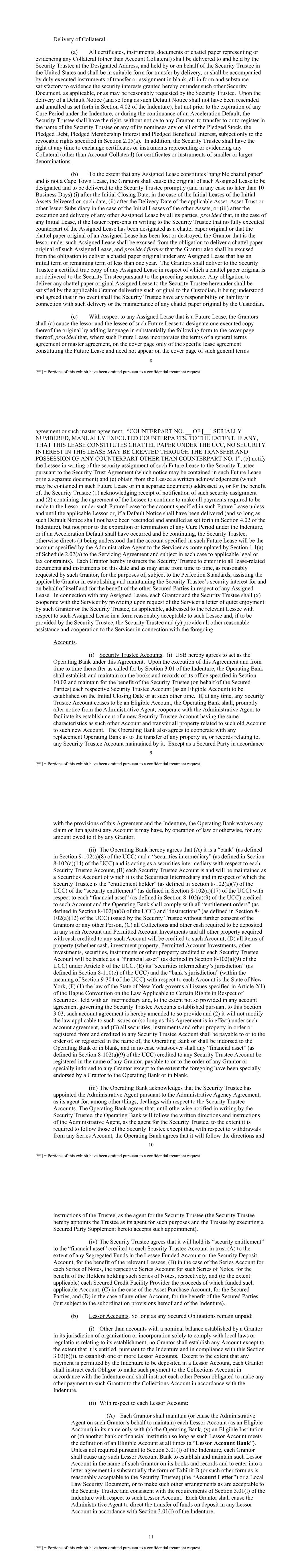 8 [**] = Portions of this exhibit have been omitted pursuant to a confidential treatment request. Delivery of Collateral. (a) All certificates, instruments, documents or chattel paper representing or evidencing any Collateral (other than Account Collateral) shall be delivered to and held by the Security Trustee at the Designated Address, and held by or on behalf of the Security Trustee in the United States and shall be in suitable form for transfer by delivery, or shall be accompanied by duly executed instruments of transfer or assignment in blank, all in form and substance satisfactory to evidence the security interests granted hereby or under such other Security Document, as applicable, or as may be reasonably requested by the Security Trustee. Upon the delivery of a Default Notice (and so long as such Default Notice shall not have been rescinded and annulled as set forth in Section 4.02 of the Indenture), but not prior to the expiration of any Cure Period under the Indenture, or during the continuance of an Acceleration Default, the Security Trustee shall have the right, without notice to any Grantor, to transfer to or to register in the name of the Security Trustee or any of its nominees any or all of the Pledged Stock, the Pledged Debt, Pledged Membership Interest and Pledged Beneficial Interest, subject only to the revocable rights specified in Section 2.05(a). In addition, the Security Trustee shall have the right at any time to exchange certificates or instruments representing or evidencing any Collateral (other than Account Collateral) for certificates or instruments of smaller or larger denominations. (b) To the extent that any Assigned Lease constitutes “tangible chattel paper” and is not a Cape Town Lease, the Grantors shall cause the original of such Assigned Lease to be designated and to be delivered to the Security Trustee promptly (and in any case no later than 10 Business Days) (i) after the Initial Closing Date, in the case of the Initial Leases of the Initial Assets delivered on such date, (ii) after the Delivery Date of the applicable Asset, Asset Trust or other Issuer Subsidiary in the case of the Initial Leases of the other Assets, or (iii) after the execution and delivery of any other Assigned Lease by all its parties, provided that, in the case of any Initial Lease, if the Issuer represents in writing to the Security Trustee that no fully executed counterpart of the Assigned Lease has been designated as a chattel paper original or that the chattel paper original of an Assigned Lease has been lost or destroyed, the Grantor that is the lessor under such Assigned Lease shall be excused from the obligation to deliver a chattel paper original of such Assigned Lease, and provided further that the Grantor also shall be excused from the obligation to deliver a chattel paper original under any Assigned Lease that has an initial term or remaining term of less than one year. The Grantors shall deliver to the Security Trustee a certified true copy of any Assigned Lease in respect of which a chattel paper original is not delivered to the Security Trustee pursuant to the preceding sentence. Any obligation to deliver any chattel paper original Assigned Lease to the Security Trustee hereunder shall be satisfied by the applicable Grantor delivering such original to the Custodian, it being understood and agreed that in no event shall the Security Trustee have any responsibility or liability in connection with such delivery or the maintenance of any chattel paper original by the Custodian. (c) With respect to any Assigned Lease that is a Future Lease, the Grantors shall (a) cause the lessor and the lessee of such Future Lease to designate one executed copy thereof the original by adding language in substantially the following form to the cover page thereof; provided that, where such Future Lease incorporates the terms of a general terms agreement or master agreement, on the cover page only of the specific lease agreement constituting the Future Lease and need not appear on the cover page of such general terms 9 [**] = Portions of this exhibit have been omitted pursuant to a confidential treatment request. agreement or such master agreement: “COUNTERPART NO. __ OF [__] SERIALLY NUMBERED, MANUALLY EXECUTED COUNTERPARTS. TO THE EXTENT, IF ANY, THAT THIS LEASE CONSTITUTES CHATTEL PAPER UNDER THE UCC, NO SECURITY INTEREST IN THIS LEASE MAY BE CREATED THROUGH THE TRANSFER AND POSSESSION OF ANY COUNTERPART OTHER THAN COUNTERPART NO. 1”, (b) notify the Lessee in writing of the security assignment of such Future Lease to the Security Trustee pursuant to the Security Trust Agreement (which notice may be contained in such Future Lease or in a separate document) and (c) obtain from the Lessee a written acknowledgement (which may be contained in such Future Lease or in a separate document) addressed to, or for the benefit of, the Security Trustee (1) acknowledging receipt of notification of such security assignment and (2) containing the agreement of the Lessee to continue to make all payments required to be made to the Lessor under such Future Lease to the account specified in such Future Lease unless and until the applicable Lessor or, if a Default Notice shall have been delivered (and so long as such Default Notice shall not have been rescinded and annulled as set forth in Section 4.02 of the Indenture), but not prior to the expiration or termination of any Cure Period under the Indenture, or if an Acceleration Default shall have occurred and be continuing, the Security Trustee, otherwise directs (it being understood that the account specified in such Future Lease will be the account specified by the Administrative Agent to the Servicer as contemplated by Section 1.1(a) of Schedule 2.02(a) to the Servicing Agreement and subject in each case to applicable legal or tax constraints). Each Grantor hereby instructs the Security Trustee to enter into all lease-related documents and instrume