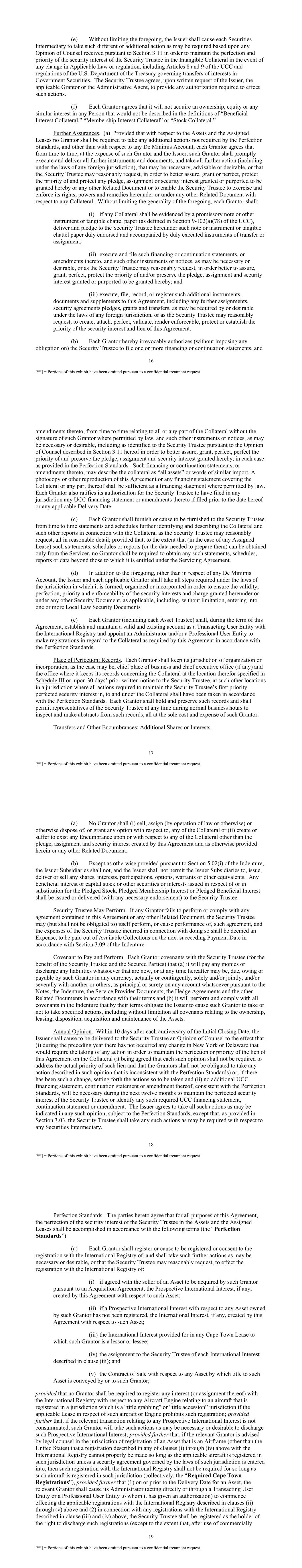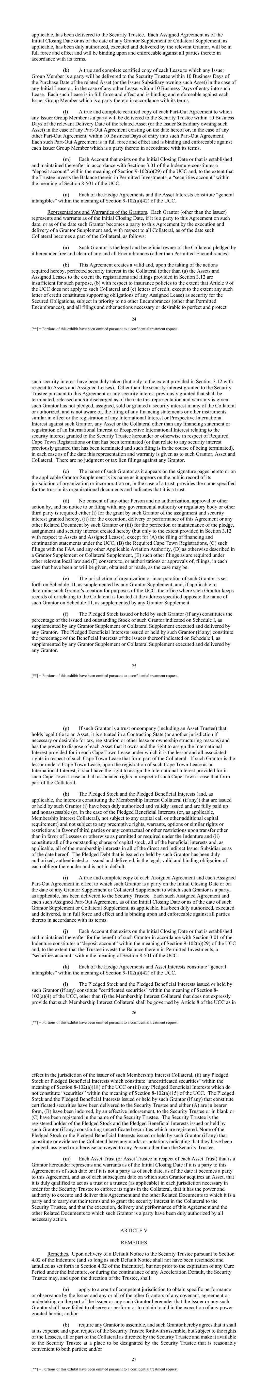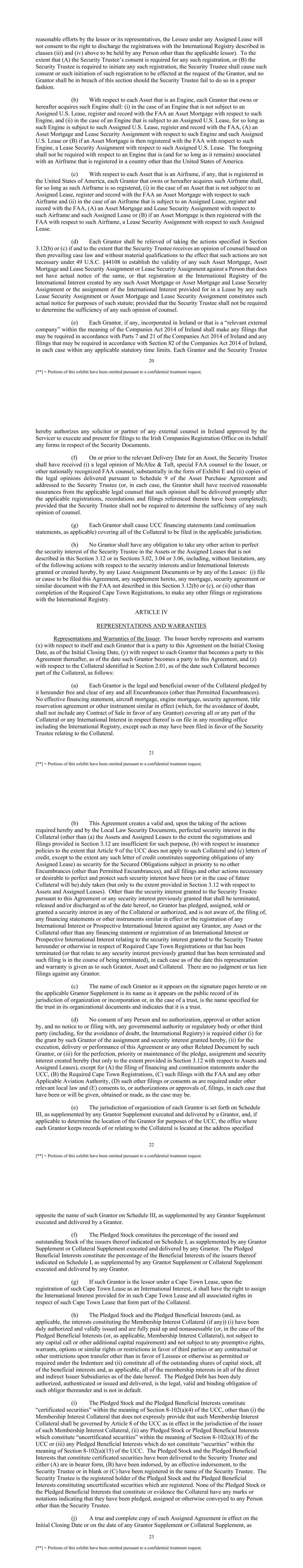 24 [**] = Portions of this exhibit have been omitted pursuant to a confidential treatment request. applicable, has been delivered to the Security Trustee. Each Assigned Agreement as of the Initial Closing Date or as of the date of any Grantor Supplement or Collateral Supplement, as applicable, has been duly authorized, executed and delivered by the relevant Grantor, will be in full force and effect and will be binding upon and enforceable against all parties thereto in accordance with its terms. (k) A true and complete certified copy of each Lease to which any Issuer Group Member is a party will be delivered to the Security Trustee within 10 Business Days of the Purchase Date of the related Asset (or the Issuer Subsidiary owning such Asset) in the case of any Initial Lease or, in the case of any other Lease, within 10 Business Days of entry into such Lease. Each such Lease is in full force and effect and is binding and enforceable against each Issuer Group Member which is a party thereto in accordance with its terms. (l) A true and complete certified copy of each Part-Out Agreement to which any Issuer Group Member is a party will be delivered to the Security Trustee within 10 Business Days of the relevant Delivery Date of the related Asset (or the Issuer Subsidiary owning such Asset) in the case of any Part-Out Agreement existing on the date hereof or, in the case of any other Part-Out Agreement, within 10 Business Days of entry into such Part-Out Agreement. Each such Part-Out Agreement is in full force and effect and is binding and enforceable against each Issuer Group Member which is a party thereto in accordance with its terms. (m) Each Account that exists on the Initial Closing Date or that is established and maintained thereafter in accordance with Sections 3.01 of the Indenture constitutes a “deposit account” within the meaning of Section 9-102(a)(29) of the UCC and, to the extent that the Trustee invests the Balance therein in Permitted Investments, a “securities account” within the meaning of Section 8-501 of the UCC. (n) Each of the Hedge Agreements and the Asset Interests constitute “general intangibles” within the meaning of Section 9-102(a)(42) of the UCC. Representations and Warranties of the Grantors. Each Grantor (other than the Issuer) represents and warrants as of the Initial Closing Date, if it is a party to this Agreement on such date, or as of the date such Grantor becomes a party to this Agreement by the execution and delivery of a Grantor Supplement and, with respect to all Collateral, as of the date such Collateral becomes a part of the Collateral, as follows: (a) Such Grantor is the legal and beneficial owner of the Collateral pledged by it hereunder free and clear of any and all Encumbrances (other than Permitted Encumbrances). (b) This Agreement creates a valid and, upon the taking of the actions required hereby, perfected security interest in the Collateral (other than (a) the Assets and Assigned Leases to the extent the registrations and filings provided in Section 3.12 are insufficient for such purpose, (b) with respect to insurance policies to the extent that Article 9 of the UCC does not apply to such Collateral and (c) letters of credit, except to the extent any such letter of credit constitutes supporting obligations of any Assigned Lease) as security for the Secured Obligations, subject in priority to no other Encumbrances (other than Permitted Encumbrances), and all filings and other actions necessary or desirable to perfect and protect 25 [**] = Portions of this exhibit have been omitted pursuant to a confidential treatment request. such security interest have been duly taken (but only to the extent provided in Section 3.12 with respect to Assets and Assigned Leases). Other than the security interest granted to the Security Trustee pursuant to this Agreement or any security interest previously granted that shall be terminated, released and/or discharged as of the date this representation and warranty is given, such Grantor has not pledged, assigned, sold or granted a security interest in any of the Collateral or authorized, and is not aware of, the filing of any financing statements or other instruments similar in effect or the registration of any International Interest or Prospective International Interest against such Grantor, any Asset or the Collateral other than any financing statement or registration of an International Interest or Prospective International Interest relating to the security interest granted to the Security Trustee hereunder or otherwise in respect of Required Cape Town Registrations or that has been terminated (or that relate to any security interest previously granted that has been terminated and such filing is in the course of being terminated), in each case as of the date this representation and warranty is given as to such Grantor, Asset and Collateral. There are no judgment or tax lien filings against any Grantor. (c) The name of such Grantor as it appears on the signature pages hereto or on the applicable Grantor Supplement is its name as it appears on the public record of its jurisdiction of organization or incorporation or, in the case of a trust, provides the name specified for the trust in its organizational documents and indicates that it is a trust. (d) No consent of any other Person and no authorization, approval or other action by, and no notice to or filing with, any governmental authority or regulatory body or other third party is required either (i) for the grant by such Grantor of the assignment and security interest granted hereby, (ii) for the execution, delivery or performance of this Agreement or any other Related Document by such Grantor or (iii) for the perfection or maintenance of the pledge, assignment and security interest created hereby (but only to the extent provided in Section 3.12 with respect to Assets and Assigned Leases), except for (A) the filing of financing and continuation statem