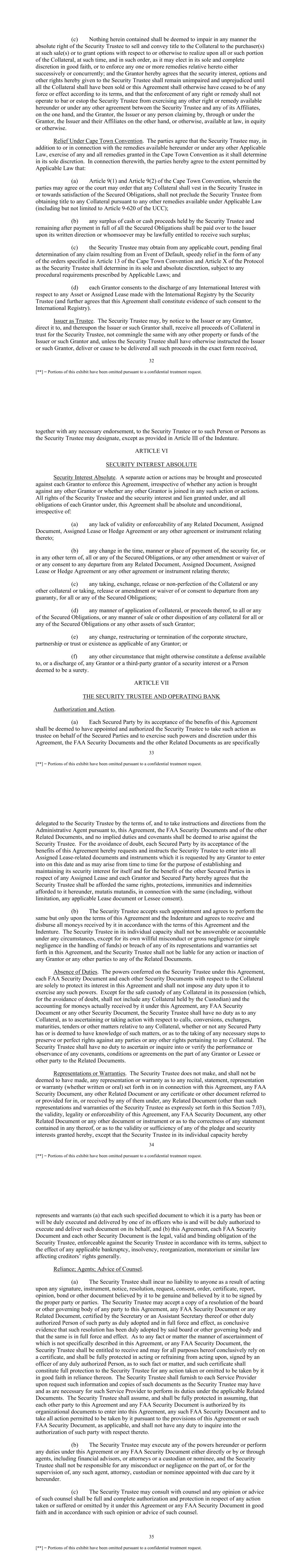 32 [**] = Portions of this exhibit have been omitted pursuant to a confidential treatment request. (c) Nothing herein contained shall be deemed to impair in any manner the absolute right of the Security Trustee to sell and convey title to the Collateral to the purchaser(s) at such sale(s) or to grant options with respect to or otherwise to realize upon all or such portion of the Collateral, at such time, and in such order, as it may elect in its sole and complete discretion in good faith, or to enforce any one or more remedies relative hereto either successively or concurrently; and the Grantor hereby agrees that the security interest, options and other rights hereby given to the Security Trustee shall remain unimpaired and unprejudiced until all the Collateral shall have been sold or this Agreement shall otherwise have ceased to be of any force or effect according to its terms, and that the enforcement of any right or remedy shall not operate to bar or estop the Security Trustee from exercising any other right or remedy available hereunder or under any other agreement between the Security Trustee and any of its Affiliates, on the one hand, and the Grantor, the Issuer or any person claiming by, through or under the Grantor, the Issuer and their Affiliates on the other hand, or otherwise, available at law, in equity or otherwise. Relief Under Cape Town Convention. The parties agree that the Security Trustee may, in addition to or in connection with the remedies available hereunder or under any other Applicable Law, exercise of any and all remedies granted in the Cape Town Convention as it shall determine in its sole discretion. In connection therewith, the parties hereby agree to the extent permitted by Applicable Law that: (a) Article 9(1) and Article 9(2) of the Cape Town Convention, wherein the parties may agree or the court may order that any Collateral shall vest in the Security Trustee in or towards satisfaction of the Secured Obligations, shall not preclude the Security Trustee from obtaining title to any Collateral pursuant to any other remedies available under Applicable Law (including but not limited to Article 9-620 of the UCC); (b) any surplus of cash or cash proceeds held by the Security Trustee and remaining after payment in full of all the Secured Obligations shall be paid over to the Issuer upon its written direction or whomsoever may be lawfully entitled to receive such surplus; (c) the Security Trustee may obtain from any applicable court, pending final determination of any claim resulting from an Event of Default, speedy relief in the form of any of the orders specified in Article 13 of the Cape Town Convention and Article X of the Protocol as the Security Trustee shall determine in its sole and absolute discretion, subject to any procedural requirements prescribed by Applicable Laws; and (d) each Grantor consents to the discharge of any International Interest with respect to any Asset or Assigned Lease made with the International Registry by the Security Trustee (and further agrees that this Agreement shall constitute evidence of such consent to the International Registry). Issuer as Trustee. The Security Trustee may, by notice to the Issuer or any Grantor, direct it to, and thereupon the Issuer or such Grantor shall, receive all proceeds of Collateral in trust for the Security Trustee, not commingle the same with any other property or funds of the Issuer or such Grantor and, unless the Security Trustee shall have otherwise instructed the Issuer or such Grantor, deliver or cause to be delivered all such proceeds in the exact form received, 33 [**] = Portions of this exhibit have been omitted pursuant to a confidential treatment request. together with any necessary endorsement, to the Security Trustee or to such Person or Persons as the Security Trustee may designate, except as provided in Article III of the Indenture. ARTICLE VI SECURITY INTEREST ABSOLUTE Security Interest Absolute. A separate action or actions may be brought and prosecuted against each Grantor to enforce this Agreement, irrespective of whether any action is brought against any other Grantor or whether any other Grantor is joined in any such action or actions. All rights of the Security Trustee and the security interest and lien granted under, and all obligations of each Grantor under, this Agreement shall be absolute and unconditional, irrespective of: (a) any lack of validity or enforceability of any Related Document, Assigned Document, Assigned Lease or Hedge Agreement or any other agreement or instrument relating thereto; (b) any change in the time, manner or place of payment of, the security for, or in any other term of, all or any of the Secured Obligations, or any other amendment or waiver of or any consent to any departure from any Related Document, Assigned Document, Assigned Lease or Hedge Agreement or any other agreement or instrument relating thereto; (c) any taking, exchange, release or non-perfection of the Collateral or any other collateral or taking, release or amendment or waiver of or consent to departure from any guaranty, for all or any of the Secured Obligations; (d) any manner of application of collateral, or proceeds thereof, to all or any of the Secured Obligations, or any manner of sale or other disposition of any collateral for all or any of the Secured Obligations or any other assets of such Grantor; (e) any change, restructuring or termination of the corporate structure, partnership or trust or existence as applicable of any Grantor; or (f) any other circumstance that might otherwise constitute a defense available to, or a discharge of, any Grantor or a third-party grantor of a security interest or a Person deemed to be a surety. ARTICLE VII THE SECURITY TRUSTEE AND OPERATING BANK Authorization and Action. (a) Each Secured Party by its acceptance of the benefits of this Agreement shall be deemed to have appointed and authorized the Security Trustee to take such action as tru
