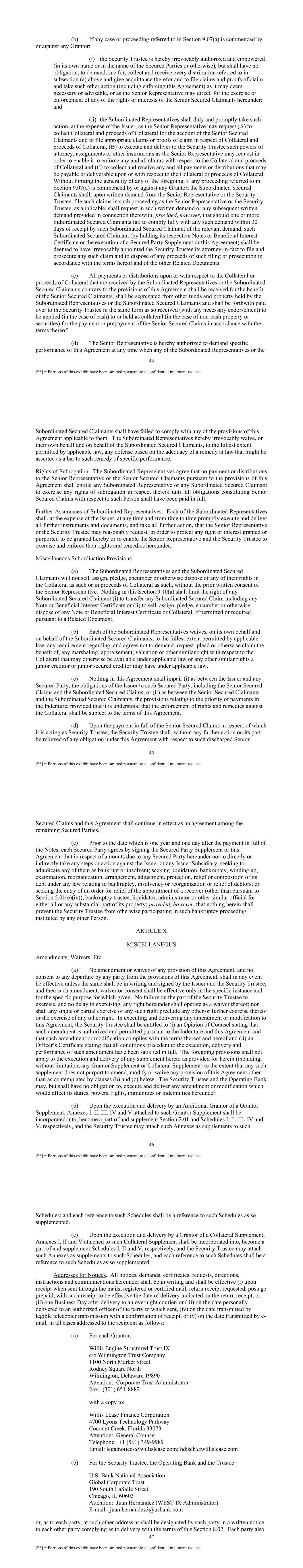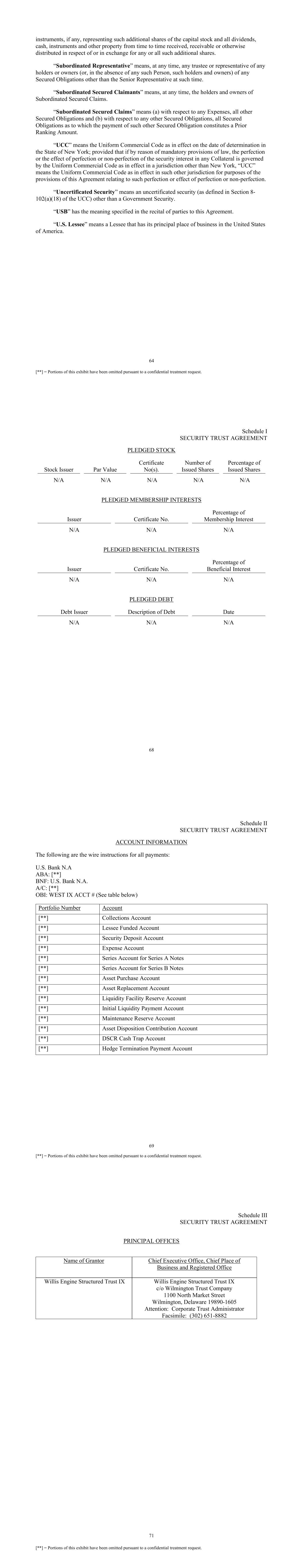 64 [**] = Portions of this exhibit have been omitted pursuant to a confidential treatment request. instruments, if any, representing such additional shares of the capital stock and all dividends, cash, instruments and other property from time to time received, receivable or otherwise distributed in respect of or in exchange for any or all such additional shares. “Subordinated Representative” means, at any time, any trustee or representative of any holders or owners (or, in the absence of any such Person, such holders and owners) of any Secured Obligations other than the Senior Representative at such time. “Subordinated Secured Claimants” means, at any time, the holders and owners of Subordinated Secured Claims. “Subordinated Secured Claims” means (a) with respect to any Expenses, all other Secured Obligations and (b) with respect to any other Secured Obligations, all Secured Obligations as to which the payment of such other Secured Obligation constitutes a Prior Ranking Amount. “UCC” means the Uniform Commercial Code as in effect on the date of determination in the State of New York; provided that if by reason of mandatory provisions of law, the perfection or the effect of perfection or non-perfection of the security interest in any Collateral is governed by the Uniform Commercial Code as in effect in a jurisdiction other than New York, “UCC” means the Uniform Commercial Code as in effect in such other jurisdiction for purposes of the provisions of this Agreement relating to such perfection or effect of perfection or non-perfection. “Uncertificated Security” means an uncertificated security (as defined in Section 8- 102(a)(18) of the UCC) other than a Government Security. “USB” has the meaning specified in the recital of parties to this Agreement. “U.S. Lessee” means a Lessee that has its principal place of business in the United States of America. 68 Schedule I SECURITY TRUST AGREEMENT PLEDGED STOCK Stock Issuer Par Value Certificate No(s). Number of Issued Shares Percentage of Issued Shares N/A N/A N/A N/A N/A PLEDGED MEMBERSHIP INTERESTS Issuer Certificate No. Percentage of Membership Interest N/A N/A N/A PLEDGED BENEFICIAL INTERESTS Issuer Certificate No. Percentage of Beneficial Interest N/A N/A N/A PLEDGED DEBT Debt Issuer Description of Debt Date N/A N/A N/A 69 [**] = Portions of this exhibit have been omitted pursuant to a confidential treatment request. Schedule II SECURITY TRUST AGREEMENT ACCOUNT INFORMATION The following are the wire instructions for all payments: U.S. Bank N.A ABA: [**] BNF: U.S. Bank N.A. A/C: [**] OBI: WEST IX ACCT # (See table below) Portfolio Number Account [**] Collections Account [**] Lessee Funded Account [**] Security Deposit Account [**] Expense Account [**] Series Account for Series A Notes [**] Series Account for Series B Notes [**] Asset Purchase Account [**] Asset Replacement Account [**] Liquidity Facility Reserve Account [**] Initial Liquidity Payment Account [**] Maintenance Reserve Account [**] Asset Disposition Contribution Account [**] DSCR Cash Trap Account [**] Hedge Termination Payment Account 71 [**] = Portions of this exhibit have been omitted pursuant to a confidential treatment request. Schedule III SECURITY TRUST AGREEMENT PRINCIPAL OFFICES Name of Grantor Chief Executive Office, Chief Place of Business and Registered Office Willis Engine Structured Trust IX Willis Engine Structured Trust IX c/o Wilmington Trust Company 1100 North Market Street Wilmington, Delaware 19890-1605 Attention: Corporate Trust Administrator Facsimile: (302) 651-8882
