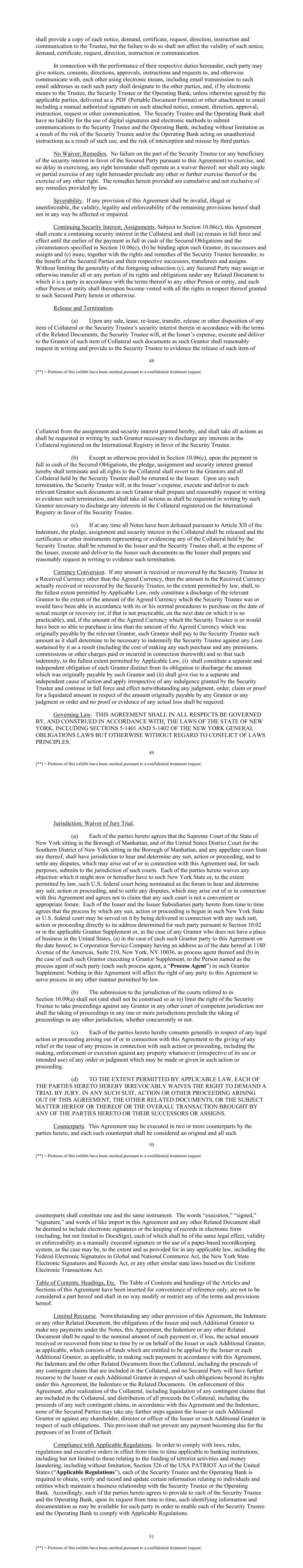 48 [**] = Portions of this exhibit have been omitted pursuant to a confidential treatment request. shall provide a copy of each notice, demand, certificate, request, direction, instruction and communication to the Trustee, but the failure to do so shall not affect the validity of such notice, demand, certificate, request, direction, instruction or communication. In connection with the performance of their respective duties hereunder, each party may give notices, consents, directions, approvals, instructions and requests to, and otherwise communicate with, each other using electronic means, including email transmission to such email addresses as each such party shall designate to the other parties, and, if by electronic means to the Trustee, the Security Trustee or the Operating Bank, unless otherwise agreed by the applicable parties, delivered as a .PDF (Portable Document Format) or other attachment to email including a manual authorized signature on such attached notice, consent, direction, approval, instruction, request or other communication. The Security Trustee and the Operating Bank shall have no liability for the use of digital signatures and electronic methods to submit communications to the Security Trustee and the Operating Bank, including without limitation as a result of the risk of the Security Trustee and/or the Operating Bank acting on unauthorized instructions as a result of such use, and the risk of interception and misuse by third parties. No Waiver; Remedies. No failure on the part of the Security Trustee (or any beneficiary of the security interest in favor of the Secured Party pursuant to this Agreement) to exercise, and no delay in exercising, any right hereunder shall operate as a waiver thereof; nor shall any single or partial exercise of any right hereunder preclude any other or further exercise thereof or the exercise of any other right. The remedies herein provided are cumulative and not exclusive of any remedies provided by law. Severability. If any provision of this Agreement shall be invalid, illegal or unenforceable, the validity, legality and enforceability of the remaining provisions hereof shall not in any way be affected or impaired. Continuing Security Interest; Assignments. Subject to Section 10.06(c), this Agreement shall create a continuing security interest in the Collateral and shall (a) remain in full force and effect until the earlier of the payment in full in cash of the Secured Obligations and the circumstances specified in Section 10.06(c), (b) be binding upon each Grantor, its successors and assigns and (c) inure, together with the rights and remedies of the Security Trustee hereunder, to the benefit of the Secured Parties and their respective successors, transferees and assigns. Without limiting the generality of the foregoing subsection (c), any Secured Party may assign or otherwise transfer all or any portion of its rights and obligations under any Related Document to which it is a party in accordance with the terms thereof to any other Person or entity, and such other Person or entity shall thereupon become vested with all the rights in respect thereof granted to such Secured Party herein or otherwise. Release and Termination. (a) Upon any sale, lease, re-lease, transfer, release or other disposition of any item of Collateral or the Security Trustee’s security interest therein in accordance with the terms of the Related Documents, the Security Trustee will, at the Issuer’s expense, execute and deliver to the Grantor of such item of Collateral such documents as such Grantor shall reasonably request in writing and provide to the Security Trustee to evidence the release of such item of 49 [**] = Portions of this exhibit have been omitted pursuant to a confidential treatment request. Collateral from the assignment and security interest granted hereby, and shall take all actions as shall be requested in writing by such Grantor necessary to discharge any interests in the Collateral registered on the International Registry in favor of the Security Trustee. (b) Except as otherwise provided in Section 10.06(c), upon the payment in full in cash of the Secured Obligations, the pledge, assignment and security interest granted hereby shall terminate and all rights to the Collateral shall revert to the Grantors and all Collateral held by the Security Trustee shall be returned to the Issuer. Upon any such termination, the Security Trustee will, at the Issuer’s expense, execute and deliver to each relevant Grantor such documents as such Grantor shall prepare and reasonably request in writing to evidence such termination, and shall take all actions as shall be requested in writing by such Grantor necessary to discharge any interests in the Collateral registered on the International Registry in favor of the Security Trustee. (c) If at any time all Notes have been defeased pursuant to Article XII of the Indenture, the pledge, assignment and security interest in the Collateral shall be released and the certificates or other instruments representing or evidencing any of the Collateral held by the Security Trustee, shall be returned to the Issuer and the Security Trustee shall, at the expense of the Issuer, execute and deliver to the Issuer such documents as the Issuer shall prepare and reasonably request in writing to evidence such termination. Currency Conversion. If any amount is received or recovered by the Security Trustee in a Received Currency other than the Agreed Currency, then the amount in the Received Currency actually received or recovered by the Security Trustee, to the extent permitted by law, shall, to the fullest extent permitted by Applicable Law, only constitute a discharge of the relevant Grantor to the extent of the amount of the Agreed Currency which the Security Trustee was or would have been able in accordance with its or his normal procedures to purchase on the date of actual receipt or recovery (or, if that is not practicable, 