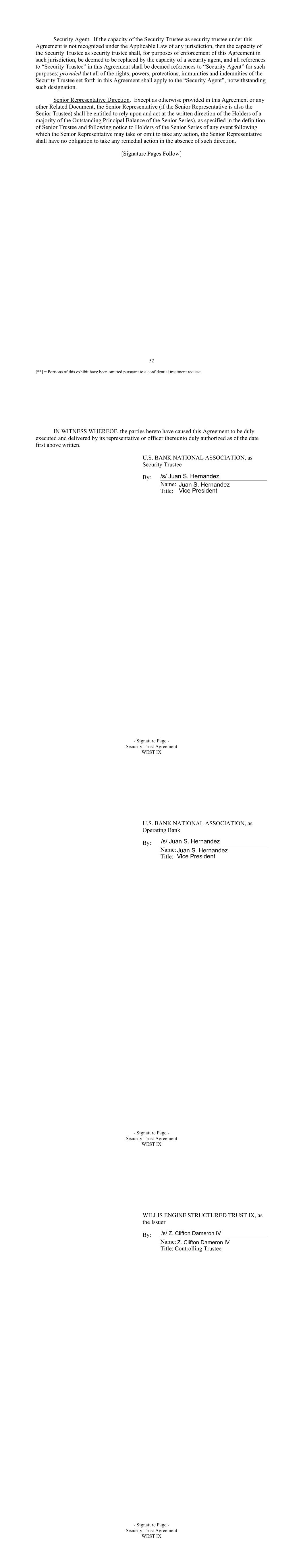 52 [**] = Portions of this exhibit have been omitted pursuant to a confidential treatment request. Security Agent. If the capacity of the Security Trustee as security trustee under this Agreement is not recognized under the Applicable Law of any jurisdiction, then the capacity of the Security Trustee as security trustee shall, for purposes of enforcement of this Agreement in such jurisdiction, be deemed to be replaced by the capacity of a security agent, and all references to “Security Trustee” in this Agreement shall be deemed references to “Security Agent” for such purposes; provided that all of the rights, powers, protections, immunities and indemnities of the Security Trustee set forth in this Agreement shall apply to the “Security Agent”, notwithstanding such designation. Senior Representative Direction. Except as otherwise provided in this Agreement or any other Related Document, the Senior Representative (if the Senior Representative is also the Senior Trustee) shall be entitled to rely upon and act at the written direction of the Holders of a majority of the Outstanding Principal Balance of the Senior Series), as specified in the definition of Senior Trustee and following notice to Holders of the Senior Series of any event following which the Senior Representative may take or omit to take any action, the Senior Representative shall have no obligation to take any remedial action in the absence of such direction. [Signature Pages Follow] - Signature Page - Security Trust Agreement WEST IX IN WITNESS WHEREOF, the parties hereto have caused this Agreement to be duly executed and delivered by its representative or officer thereunto duly authorized as of the date first above written. U.S. BANK NATIONAL ASSOCIATION, as Security Trustee By: ____________________________________ Name: Title: /s/ Juan S. Hernandez Juan S. Hernandez Vice President - Signature Page - Security Trust Agreement WEST IX U.S. BANK NATIONAL ASSOCIATION, as Operating Bank By: ____________________________________ Name: Title: /s/ Juan S. Hernandez Juan S. Hernandez Vice President - Signature Page - Security Trust Agreement WEST IX WILLIS ENGINE STRUCTURED TRUST IX, as the Issuer By: ____________________________________ Name: Title: Controlling Trustee /s/ Z. Clifton Dameron IV Z. Clifton Dameron IV