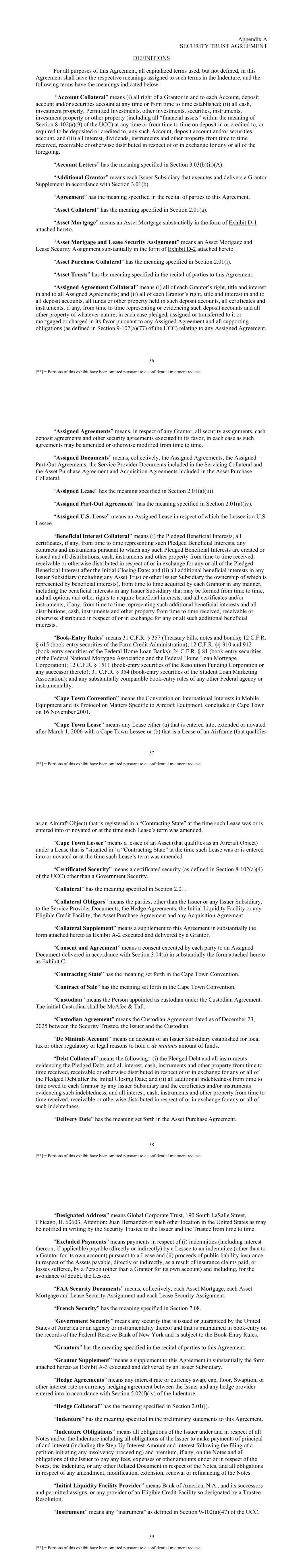 56 [**] = Portions of this exhibit have been omitted pursuant to a confidential treatment request. Appendix A SECURITY TRUST AGREEMENT DEFINITIONS For all purposes of this Agreement, all capitalized terms used, but not defined, in this Agreement shall have the respective meanings assigned to such terms in the Indenture, and the following terms have the meanings indicated below: “Account Collateral” means (i) all right of a Grantor in and to each Account, deposit account and/or securities account at any time or from time to time established; (ii) all cash, investment property, Permitted Investments, other investments, securities, instruments, investment property or other property (including all “financial assets” within the meaning of Section 8-102(a)(9) of the UCC) at any time or from time to time on deposit in or credited to, or required to be deposited or credited to, any such Account, deposit account and/or securities account, and (iii) all interest, dividends, instruments and other property from time to time received, receivable or otherwise distributed in respect of or in exchange for any or all of the foregoing. “Account Letters” has the meaning specified in Section 3.03(b)(ii)(A). “Additional Grantor” means each Issuer Subsidiary that executes and delivers a Grantor Supplement in accordance with Section 3.01(b). “Agreement” has the meaning specified in the recital of parties to this Agreement. “Asset Collateral” has the meaning specified in Section 2.01(a). “Asset Mortgage” means an Asset Mortgage substantially in the form of Exhibit D-1 attached hereto. “Asset Mortgage and Lease Security Assignment” means an Asset Mortgage and Lease Security Assignment substantially in the form of Exhibit D-2 attached hereto. “Asset Purchase Collateral” has the meaning specified in Section 2.01(i). “Asset Trusts” has the meaning specified in the recital of parties to this Agreement. “Assigned Agreement Collateral” means (i) all of each Grantor’s right, title and interest in and to all Assigned Agreements; and (ii) all of each Grantor’s right, title and interest in and to all deposit accounts, all funds or other property held in such deposit accounts, all certificates and instruments, if any, from time to time representing or evidencing such deposit accounts and all other property of whatever nature, in each case pledged, assigned or transferred to it or mortgaged or charged in its favor pursuant to any Assigned Agreement and all supporting obligations (as defined in Section 9-102(a)(77) of the UCC) relating to any Assigned Agreement. 57 [**] = Portions of this exhibit have been omitted pursuant to a confidential treatment request. “Assigned Agreements” means, in respect of any Grantor, all security assignments, cash deposit agreements and other security agreements executed in its favor, in each case as such agreements may be amended or otherwise modified from time to time. “Assigned Documents” means, collectively, the Assigned Agreements, the Assigned Part-Out Agreements, the Service Provider Documents included in the Servicing Collateral and the Asset Purchase Agreement and Acquisition Agreements included in the Asset Purchase Collateral. “Assigned Lease” has the meaning specified in Section 2.01(a)(iii). “Assigned Part-Out Agreement” has the meaning specified in Section 2.01(a)(iv). “Assigned U.S. Lease” means an Assigned Lease in respect of which the Lessee is a U.S. Lessee. “Beneficial Interest Collateral” means (i) the Pledged Beneficial Interests, all certificates, if any, from time to time representing such Pledged Beneficial Interests, any contracts and instruments pursuant to which any such Pledged Beneficial Interests are created or issued and all distributions, cash, instruments and other property from time to time received, receivable or otherwise distributed in respect of or in exchange for any or all of the Pledged Beneficial Interest after the Initial Closing Date; and (ii) all additional beneficial interests in any Issuer Subsidiary (including any Asset Trust or other Issuer Subsidiary the ownership of which is represented by beneficial interests), from time to time acquired by each Grantor in any manner, including the beneficial interests in any Issuer Subsidiary that may be formed from time to time, and all options and other rights to acquire beneficial interests, and all certificates and/or instruments, if any, from time to time representing such additional beneficial interests and all distributions, cash, instruments and other property from time to time received, receivable or otherwise distributed in respect of or in exchange for any or all such additional beneficial interests. “Book-Entry Rules” means 31 C.F.R. § 357 (Treasury bills, notes and bonds); 12 C.F.R. § 615 (book-entry securities of the Farm Credit Administration); 12 C.F.R. §§ 910 and 912 (book-entry securities of the Federal Home Loan Banks); 24 C.F.R. § 81 (book-entry securities of the Federal National Mortgage Association and the Federal Home Loan Mortgage Corporation); 12 C.F.R. § 1511 (book-entry securities of the Resolution Funding Corporation or any successor thereto); 31 C.F.R. § 354 (book-entry securities of the Student Loan Marketing Association); and any substantially comparable book-entry rules of any other Federal agency or instrumentality. “Cape Town Convention” means the Convention on International Interests in Mobile Equipment and its Protocol on Matters Specific to Aircraft Equipment, concluded in Cape Town on 16 November 2001. “Cape Town Lease” means any Lease either (a) that is entered into, extended or novated after March 1, 2006 with a Cape Town Lessee or (b) that is a Lease of an Airframe (that qualifies 58 [**] = Portions of this exhibit have been omitted pursuant to a confidential treatment request. as an Aircraft Object) that is registered in a “Contracting State” at the time such Lease was or is