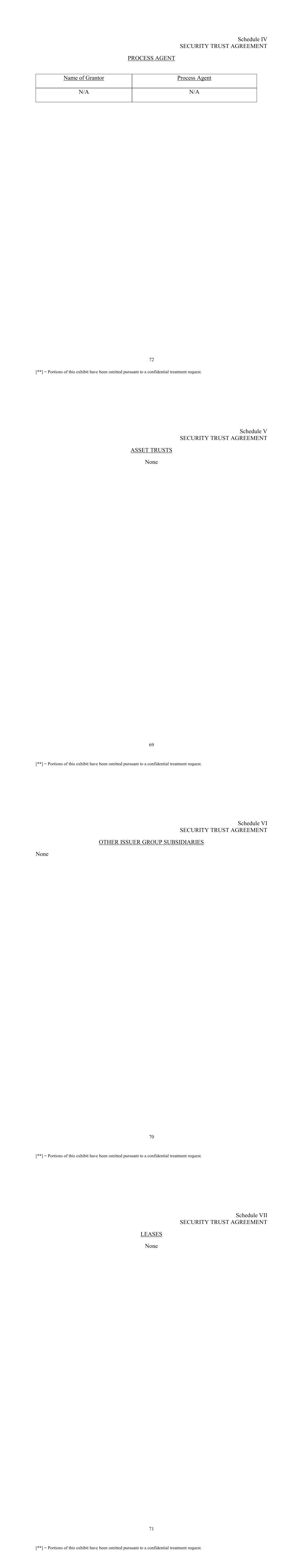 72 [**] = Portions of this exhibit have been omitted pursuant to a confidential treatment request. Schedule IV SECURITY TRUST AGREEMENT PROCESS AGENT Name of Grantor Process Agent N/A N/A 69 [**] = Portions of this exhibit have been omitted pursuant to a confidential treatment request. Schedule V SECURITY TRUST AGREEMENT ASSET TRUSTS None 70 [**] = Portions of this exhibit have been omitted pursuant to a confidential treatment request. Schedule VI SECURITY TRUST AGREEMENT OTHER ISSUER GROUP SUBSIDIARIES None 71 [**] = Portions of this exhibit have been omitted pursuant to a confidential treatment request. Schedule VII SECURITY TRUST AGREEMENT LEASES None