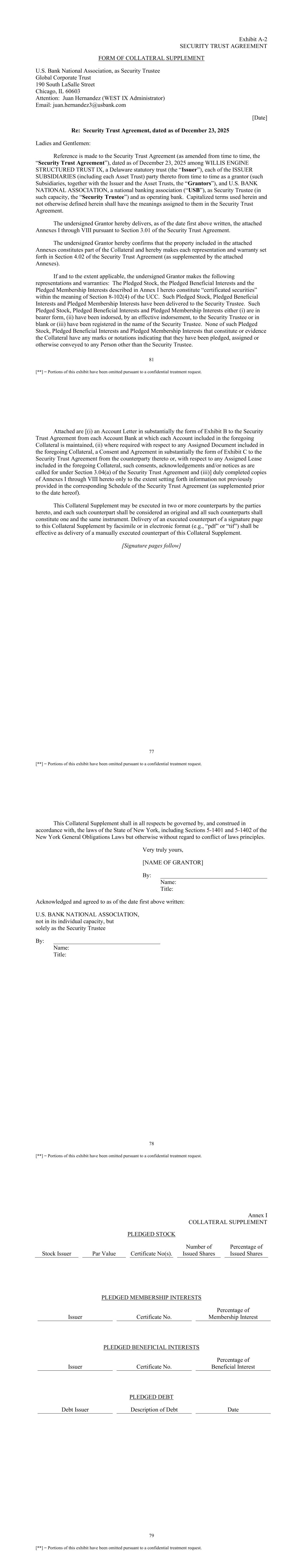 81 [**] = Portions of this exhibit have been omitted pursuant to a confidential treatment request. Exhibit A-2 SECURITY TRUST AGREEMENT FORM OF COLLATERAL SUPPLEMENT U.S. Bank National Association, as Security Trustee Global Corporate Trust 190 South LaSalle Street Chicago, IL 60603 Attention: Juan Hernandez (WEST IX Administrator) Email: juan.hernandez3@usbank.com [Date] Re: Security Trust Agreement, dated as of December 23, 2025 Ladies and Gentlemen: Reference is made to the Security Trust Agreement (as amended from time to time, the “Security Trust Agreement”), dated as of December 23, 2025 among WILLIS ENGINE STRUCTURED TRUST IX, a Delaware statutory trust (the “Issuer”), each of the ISSUER SUBSIDIARIES (including each Asset Trust) party thereto from time to time as a grantor (such Subsidiaries, together with the Issuer and the Asset Trusts, the “Grantors”), and U.S. BANK NATIONAL ASSOCIATION, a national banking association (“USB”), as Security Trustee (in such capacity, the “Security Trustee”) and as operating bank. Capitalized terms used herein and not otherwise defined herein shall have the meanings assigned to them in the Security Trust Agreement. The undersigned Grantor hereby delivers, as of the date first above written, the attached Annexes I through VIII pursuant to Section 3.01 of the Security Trust Agreement. The undersigned Grantor hereby confirms that the property included in the attached Annexes constitutes part of the Collateral and hereby makes each representation and warranty set forth in Section 4.02 of the Security Trust Agreement (as supplemented by the attached Annexes). If and to the extent applicable, the undersigned Grantor makes the following representations and warranties: The Pledged Stock, the Pledged Beneficial Interests and the Pledged Membership Interests described in Annex I hereto constitute “certificated securities” within the meaning of Section 8-102(4) of the UCC. Such Pledged Stock, Pledged Beneficial Interests and Pledged Membership Interests have been delivered to the Security Trustee. Such Pledged Stock, Pledged Beneficial Interests and Pledged Membership Interests either (i) are in bearer form, (ii) have been indorsed, by an effective indorsement, to the Security Trustee or in blank or (iii) have been registered in the name of the Security Trustee. None of such Pledged Stock, Pledged Beneficial Interests and Pledged Membership Interests that constitute or evidence the Collateral have any marks or notations indicating that they have been pledged, assigned or otherwise conveyed to any Person other than the Security Trustee. 77 [**] = Portions of this exhibit have been omitted pursuant to a confidential treatment request. Attached are [(i) an Account Letter in substantially the form of Exhibit B to the Security Trust Agreement from each Account Bank at which each Account included in the foregoing Collateral is maintained, (ii) where required with respect to any Assigned Document included in the foregoing Collateral, a Consent and Agreement in substantially the form of Exhibit C to the Security Trust Agreement from the counterparty thereto or, with respect to any Assigned Lease included in the foregoing Collateral, such consents, acknowledgements and/or notices as are called for under Section 3.04(a) of the Security Trust Agreement and (iii)] duly completed copies of Annexes I through VIII hereto only to the extent setting forth information not previously provided in the corresponding Schedule of the Security Trust Agreement (as supplemented prior to the date hereof). This Collateral Supplement may be executed in two or more counterparts by the parties hereto, and each such counterpart shall be considered an original and all such counterparts shall constitute one and the same instrument. Delivery of an executed counterpart of a signature page to this Collateral Supplement by facsimile or in electronic format (e.g., “pdf” or “tif”) shall be effective as delivery of a manually executed counterpart of this Collateral Supplement. [Signature pages follow] 78 [**] = Portions of this exhibit have been omitted pursuant to a confidential treatment request. This Collateral Supplement shall in all respects be governed by, and construed in accordance with, the laws of the State of New York, including Sections 5-1401 and 5-1402 of the New York General Obligations Laws but otherwise without regard to conflict of laws principles. Very truly yours, [NAME OF GRANTOR] By: ____________________________________ Name: Title: Acknowledged and agreed to as of the date first above written: U.S. BANK NATIONAL ASSOCIATION, not in its individual capacity, but solely as the Security Trustee By: ____________________________________ Name: Title: 79 [**] = Portions of this exhibit have been omitted pursuant to a confidential treatment request. Annex I COLLATERAL SUPPLEMENT PLEDGED STOCK Stock Issuer Par Value Certificate No(s). Number of Issued Shares Percentage of Issued Shares PLEDGED MEMBERSHIP INTERESTS Issuer Certificate No. Percentage of Membership Interest PLEDGED BENEFICIAL INTERESTS Issuer Certificate No. Percentage of Beneficial Interest PLEDGED DEBT Debt Issuer Description of Debt Date