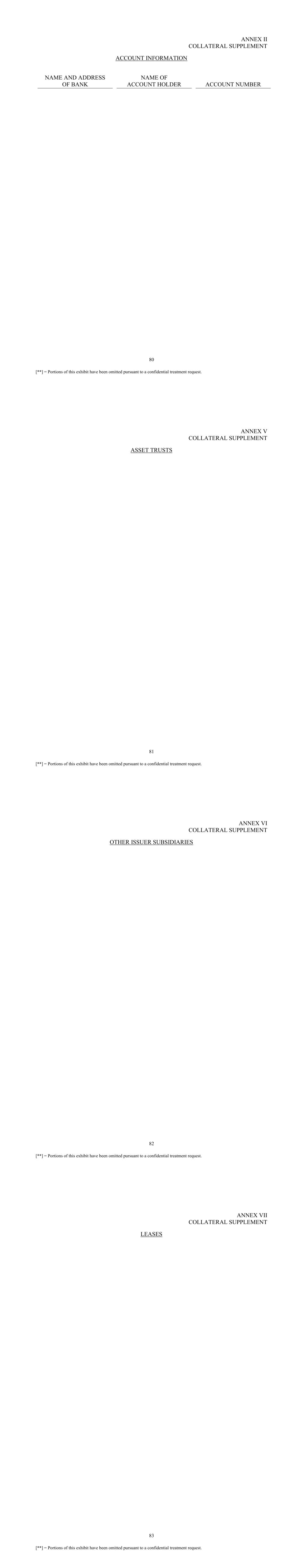 80 [**] = Portions of this exhibit have been omitted pursuant to a confidential treatment request. ANNEX II COLLATERAL SUPPLEMENT ACCOUNT INFORMATION NAME AND ADDRESS OF BANK NAME OF ACCOUNT HOLDER ACCOUNT NUMBER 81 [**] = Portions of this exhibit have been omitted pursuant to a confidential treatment request. ANNEX V COLLATERAL SUPPLEMENT ASSET TRUSTS 82 [**] = Portions of this exhibit have been omitted pursuant to a confidential treatment request. ANNEX VI COLLATERAL SUPPLEMENT OTHER ISSUER SUBSIDIARIES 83 [**] = Portions of this exhibit have been omitted pursuant to a confidential treatment request. ANNEX VII COLLATERAL SUPPLEMENT LEASES