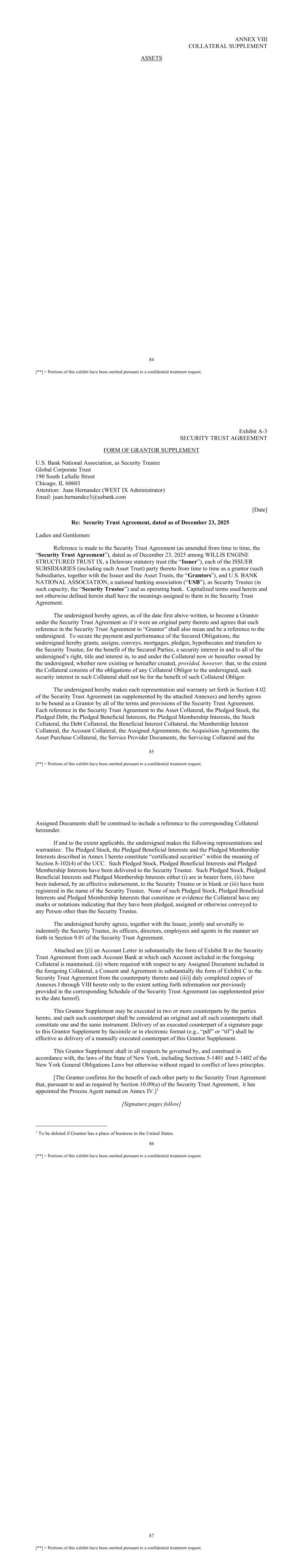 84 [**] = Portions of this exhibit have been omitted pursuant to a confidential treatment request. ANNEX VIII COLLATERAL SUPPLEMENT ASSETS 85 [**] = Portions of this exhibit have been omitted pursuant to a confidential treatment request. Exhibit A-3 SECURITY TRUST AGREEMENT FORM OF GRANTOR SUPPLEMENT U.S. Bank National Association, as Security Trustee Global Corporate Trust 190 South LaSalle Street Chicago, IL 60603 Attention: Juan Hernandez (WEST IX Administrator) Email: juan.hernandez3@usbank.com [Date] Re: Security Trust Agreement, dated as of December 23, 2025 Ladies and Gentlemen: Reference is made to the Security Trust Agreement (as amended from time to time, the “Security Trust Agreement”), dated as of December 23, 2025 among WILLIS ENGINE STRUCTURED TRUST IX, a Delaware statutory trust (the “Issuer”), each of the ISSUER SUBSIDIARIES (including each Asset Trust) party thereto from time to time as a grantor (such Subsidiaries, together with the Issuer and the Asset Trusts, the “Grantors”), and U.S. BANK NATIONAL ASSOCIATION, a national banking association (“USB”), as Security Trustee (in such capacity, the “Security Trustee”) and as operating bank. Capitalized terms used herein and not otherwise defined herein shall have the meanings assigned to them in the Security Trust Agreement. The undersigned hereby agrees, as of the date first above written, to become a Grantor under the Security Trust Agreement as if it were an original party thereto and agrees that each reference in the Security Trust Agreement to “Grantor” shall also mean and be a reference to the undersigned. To secure the payment and performance of the Secured Obligations, the undersigned hereby grants, assigns, conveys, mortgages, pledges, hypothecates and transfers to the Security Trustee, for the benefit of the Secured Parties, a security interest in and to all of the undersigned’s right, title and interest in, to and under the Collateral now or hereafter owned by the undersigned, whether now existing or hereafter created, provided, however, that, to the extent the Collateral consists of the obligations of any Collateral Obligor to the undersigned, such security interest in such Collateral shall not be for the benefit of such Collateral Obligor. The undersigned hereby makes each representation and warranty set forth in Section 4.02 of the Security Trust Agreement (as supplemented by the attached Annexes) and hereby agrees to be bound as a Grantor by all of the terms and provisions of the Security Trust Agreement. Each reference in the Security Trust Agreement to the Asset Collateral, the Pledged Stock, the Pledged Debt, the Pledged Beneficial Interests, the Pledged Membership Interests, the Stock Collateral, the Debt Collateral, the Beneficial Interest Collateral, the Membership Interest Collateral, the Account Collateral, the Assigned Agreements, the Acquisition Agreements, the Asset Purchase Collateral, the Service Provider Documents, the Servicing Collateral and the 86 [**] = Portions of this exhibit have been omitted pursuant to a confidential treatment request. Assigned Documents shall be construed to include a reference to the corresponding Collateral hereunder. If and to the extent applicable, the undersigned makes the following representations and warranties: The Pledged Stock, the Pledged Beneficial Interests and the Pledged Membership Interests described in Annex I hereto constitute “certificated securities” within the meaning of Section 8-102(4) of the UCC. Such Pledged Stock, Pledged Beneficial Interests and Pledged Membership Interests have been delivered to the Security Trustee. Such Pledged Stock, Pledged Beneficial Interests and Pledged Membership Interests either (i) are in bearer form, (ii) have been indorsed, by an effective indorsement, to the Security Trustee or in blank or (iii) have been registered in the name of the Security Trustee. None of such Pledged Stock, Pledged Beneficial Interests and Pledged Membership Interests that constitute or evidence the Collateral have any marks or notations indicating that they have been pledged, assigned or otherwise conveyed to any Person other than the Security Trustee. The undersigned hereby agrees, together with the Issuer, jointly and severally to indemnify the Security Trustee, its officers, directors, employees and agents in the manner set forth in Section 9.01 of the Security Trust Agreement. Attached are [(i) an Account Letter in substantially the form of Exhibit B to the Security Trust Agreement from each Account Bank at which each Account included in the foregoing Collateral is maintained, (ii) where required with respect to any Assigned Document included in the foregoing Collateral, a Consent and Agreement in substantially the form of Exhibit C to the Security Trust Agreement from the counterparty thereto and (iii)] duly completed copies of Annexes I through VIII hereto only to the extent setting forth information not previously provided in the corresponding Schedule of the Security Trust Agreement (as supplemented prior to the date hereof). This Grantor Supplement may be executed in two or more counterparts by the parties hereto, and each such counterpart shall be considered an original and all such counterparts shall constitute one and the same instrument. Delivery of an executed counterpart of a signature page to this Grantor Supplement by facsimile or in electronic format (e.g., “pdf” or “tif”) shall be effective as delivery of a manually executed counterpart of this Grantor Supplement. This Grantor Supplement shall in all respects be governed by, and construed in accordance with, the laws of the State of New York, including Sections 5-1401 and 5-1402 of the New York General Obligations Laws but otherwise without regard to conflict of laws principles. [The Granter confirms for the benefit of each other party to the Security Trust Agreement that, pursuant to and as required by Section 10.09(a) of the Secur