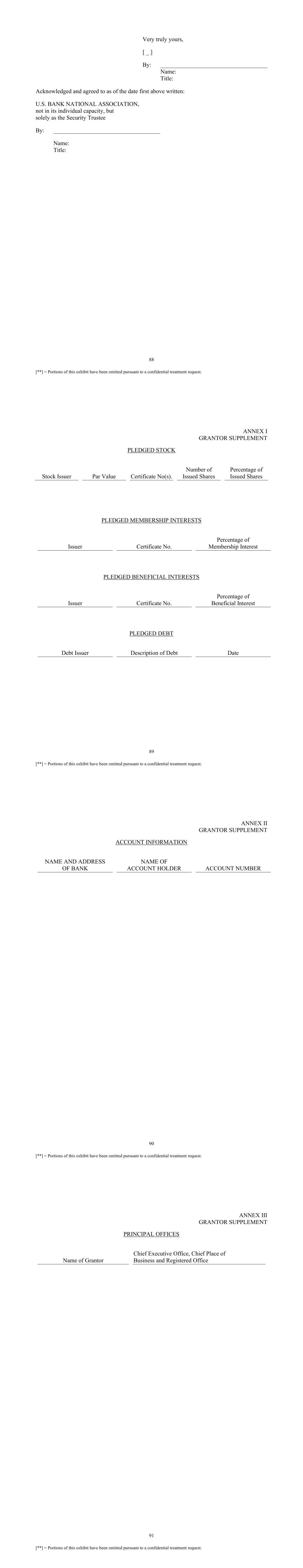 88 [**] = Portions of this exhibit have been omitted pursuant to a confidential treatment request. Very truly yours, [ _ ] By: ____________________________________ Name: Title: Acknowledged and agreed to as of the date first above written: U.S. BANK NATIONAL ASSOCIATION, not in its individual capacity, but solely as the Security Trustee By: ____________________________________ Name: Title: 89 [**] = Portions of this exhibit have been omitted pursuant to a confidential treatment request. ANNEX I GRANTOR SUPPLEMENT PLEDGED STOCK Stock Issuer Par Value Certificate No(s). Number of Issued Shares Percentage of Issued Shares PLEDGED MEMBERSHIP INTERESTS Issuer Certificate No. Percentage of Membership Interest PLEDGED BENEFICIAL INTERESTS Issuer Certificate No. Percentage of Beneficial Interest PLEDGED DEBT Debt Issuer Description of Debt Date 90 [**] = Portions of this exhibit have been omitted pursuant to a confidential treatment request. ANNEX II GRANTOR SUPPLEMENT ACCOUNT INFORMATION NAME AND ADDRESS OF BANK NAME OF ACCOUNT HOLDER ACCOUNT NUMBER 91 [**] = Portions of this exhibit have been omitted pursuant to a confidential treatment request. ANNEX III GRANTOR SUPPLEMENT PRINCIPAL OFFICES Name of Grantor Chief Executive Office, Chief Place of Business and Registered Office
