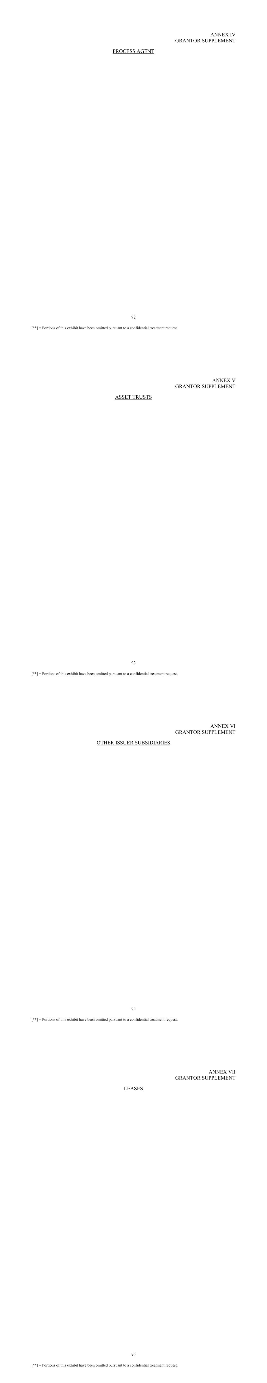 92 [**] = Portions of this exhibit have been omitted pursuant to a confidential treatment request. ANNEX IV GRANTOR SUPPLEMENT PROCESS AGENT 93 [**] = Portions of this exhibit have been omitted pursuant to a confidential treatment request. ANNEX V GRANTOR SUPPLEMENT ASSET TRUSTS 94 [**] = Portions of this exhibit have been omitted pursuant to a confidential treatment request. ANNEX VI GRANTOR SUPPLEMENT OTHER ISSUER SUBSIDIARIES 95 [**] = Portions of this exhibit have been omitted pursuant to a confidential treatment request. ANNEX VII GRANTOR SUPPLEMENT LEASES