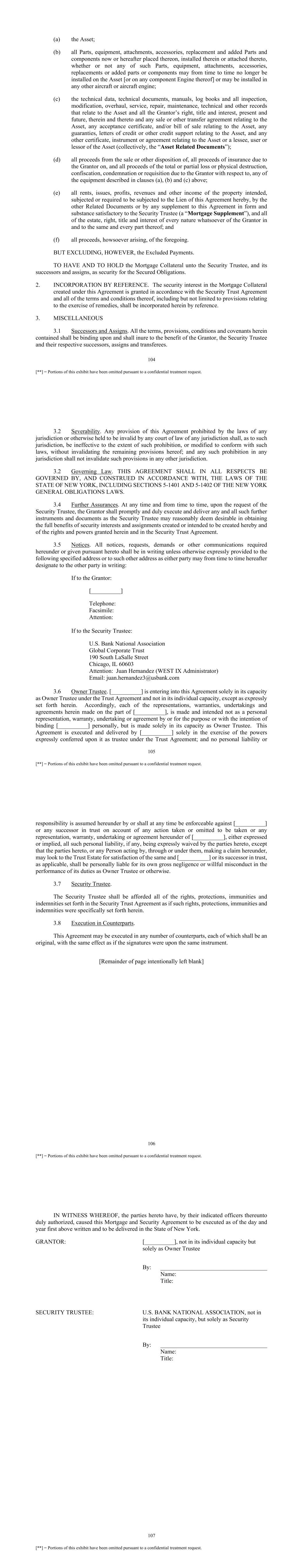 104 [**] = Portions of this exhibit have been omitted pursuant to a confidential treatment request. (a) the Asset; (b) all Parts, equipment, attachments, accessories, replacement and added Parts and components now or hereafter placed thereon, installed therein or attached thereto, whether or not any of such Parts, equipment, attachments, accessories, replacements or added parts or components may from time to time no longer be installed on the Asset [or on any component Engine thereof] or may be installed in any other aircraft or aircraft engine; (c) the technical data, technical documents, manuals, log books and all inspection, modification, overhaul, service, repair, maintenance, technical and other records that relate to the Asset and all the Grantor’s right, title and interest, present and future, therein and thereto and any sale or other transfer agreement relating to the Asset, any acceptance certificate, and/or bill of sale relating to the Asset, any guaranties, letters of credit or other credit support relating to the Asset, and any other certificate, instrument or agreement relating to the Asset or a lessee, user or lessor of the Asset (collectively, the “Asset Related Documents”); (d) all proceeds from the sale or other disposition of, all proceeds of insurance due to the Grantor on, and all proceeds of the total or partial loss or physical destruction, confiscation, condemnation or requisition due to the Grantor with respect to, any of the equipment described in clauses (a), (b) and (c) above; (e) all rents, issues, profits, revenues and other income of the property intended, subjected or required to be subjected to the Lien of this Agreement hereby, by the other Related Documents or by any supplement to this Agreement in form and substance satisfactory to the Security Trustee (a “Mortgage Supplement”), and all of the estate, right, title and interest of every nature whatsoever of the Grantor in and to the same and every part thereof; and (f) all proceeds, howsoever arising, of the foregoing. BUT EXCLUDING, HOWEVER, the Excluded Payments. TO HAVE AND TO HOLD the Mortgage Collateral unto the Security Trustee, and its successors and assigns, as security for the Secured Obligations. 2. INCORPORATION BY REFERENCE. The security interest in the Mortgage Collateral created under this Agreement is granted in accordance with the Security Trust Agreement and all of the terms and conditions thereof, including but not limited to provisions relating to the exercise of remedies, shall be incorporated herein by reference. 3. MISCELLANEOUS 3.1 Successors and Assigns. All the terms, provisions, conditions and covenants herein contained shall be binding upon and shall inure to the benefit of the Grantor, the Security Trustee and their respective successors, assigns and transferees. 105 [**] = Portions of this exhibit have been omitted pursuant to a confidential treatment request. 3.2 Severability. Any provision of this Agreement prohibited by the laws of any jurisdiction or otherwise held to be invalid by any court of law of any jurisdiction shall, as to such jurisdiction, be ineffective to the extent of such prohibition, or modified to conform with such laws, without invalidating the remaining provisions hereof; and any such prohibition in any jurisdiction shall not invalidate such provisions in any other jurisdiction. 3.2 Governing Law. THIS AGREEMENT SHALL IN ALL RESPECTS BE GOVERNED BY, AND CONSTRUED IN ACCORDANCE WITH, THE LAWS OF THE STATE OF NEW YORK, INCLUDING SECTIONS 5-1401 AND 5-1402 OF THE NEW YORK GENERAL OBLIGATIONS LAWS. 3.4 Further Assurances. At any time and from time to time, upon the request of the Security Trustee, the Grantor shall promptly and duly execute and deliver any and all such further instruments and documents as the Security Trustee may reasonably deem desirable in obtaining the full benefits of security interests and assignments created or intended to be created hereby and of the rights and powers granted herein and in the Security Trust Agreement. 3.5 Notices. All notices, requests, demands or other communications required hereunder or given pursuant hereto shall be in writing unless otherwise expressly provided to the following specified address or to such other address as either party may from time to time hereafter designate to the other party in writing: If to the Grantor: [__________] Telephone: Facsimile: Attention: If to the Security Trustee: U.S. Bank National Association Global Corporate Trust 190 South LaSalle Street Chicago, IL 60603 Attention: Juan Hernandez (WEST IX Administrator) Email: juan.hernandez3@usbank.com 3.6 Owner Trustee. [__________] is entering into this Agreement solely in its capacity as Owner Trustee under the Trust Agreement and not in its individual capacity, except as expressly set forth herein. Accordingly, each of the representations, warranties, undertakings and agreements herein made on the part of [__________], is made and intended not as a personal representation, warranty, undertaking or agreement by or for the purpose or with the intention of binding [__________] personally, but is made solely in its capacity as Owner Trustee. This Agreement is executed and delivered by [__________] solely in the exercise of the powers expressly conferred upon it as trustee under the Trust Agreement; and no personal liability or 106 [**] = Portions of this exhibit have been omitted pursuant to a confidential treatment request. responsibility is assumed hereunder by or shall at any time be enforceable against [__________] or any successor in trust on account of any action taken or omitted to be taken or any representation, warranty, undertaking or agreement hereunder of [__________], either expressed or implied, all such personal liability, if any, being expressly waived by the parties hereto, except that the parties hereto, or any Person acting by, through or under them, making a claim hereunder, may look to the Trust Estate for s