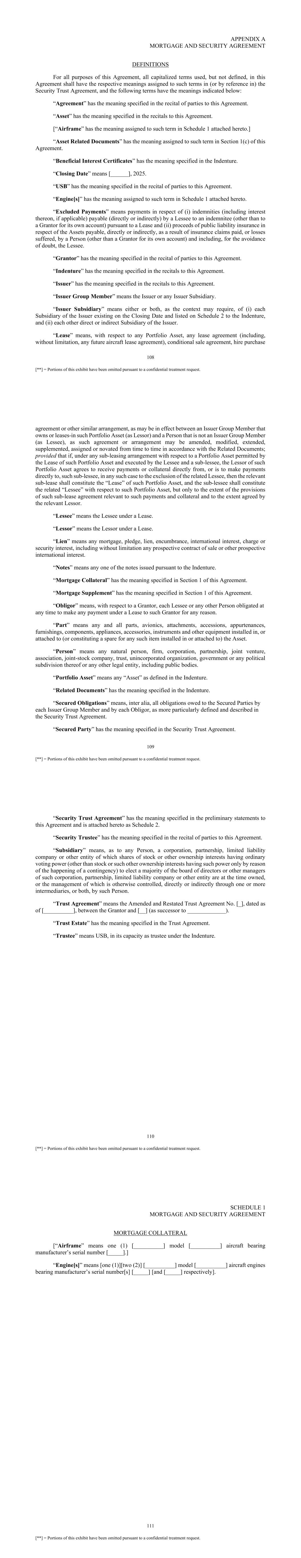 108 [**] = Portions of this exhibit have been omitted pursuant to a confidential treatment request. APPENDIX A MORTGAGE AND SECURITY AGREEMENT DEFINITIONS For all purposes of this Agreement, all capitalized terms used, but not defined, in this Agreement shall have the respective meanings assigned to such terms in (or by reference in) the Security Trust Agreement, and the following terms have the meanings indicated below: “Agreement” has the meaning specified in the recital of parties to this Agreement. “Asset” has the meaning specified in the recitals to this Agreement. [“Airframe” has the meaning assigned to such term in Schedule 1 attached hereto.] “Asset Related Documents” has the meaning assigned to such term in Section 1(c) of this Agreement. “Beneficial Interest Certificates” has the meaning specified in the Indenture. “Closing Date” means [______], 2025. “USB” has the meaning specified in the recital of parties to this Agreement. “Engine[s]” has the meaning assigned to such term in Schedule 1 attached hereto. “Excluded Payments” means payments in respect of (i) indemnities (including interest thereon, if applicable) payable (directly or indirectly) by a Lessee to an indemnitee (other than to a Grantor for its own account) pursuant to a Lease and (ii) proceeds of public liability insurance in respect of the Assets payable, directly or indirectly, as a result of insurance claims paid, or losses suffered, by a Person (other than a Grantor for its own account) and including, for the avoidance of doubt, the Lessee. “Grantor” has the meaning specified in the recital of parties to this Agreement. “Indenture” has the meaning specified in the recitals to this Agreement. “Issuer” has the meaning specified in the recitals to this Agreement. “Issuer Group Member” means the Issuer or any Issuer Subsidiary. “Issuer Subsidiary” means either or both, as the context may require, of (i) each Subsidiary of the Issuer existing on the Closing Date and listed on Schedule 2 to the Indenture, and (ii) each other direct or indirect Subsidiary of the Issuer. “Lease” means, with respect to any Portfolio Asset, any lease agreement (including, without limitation, any future aircraft lease agreement), conditional sale agreement, hire purchase 109 [**] = Portions of this exhibit have been omitted pursuant to a confidential treatment request. agreement or other similar arrangement, as may be in effect between an Issuer Group Member that owns or leases-in such Portfolio Asset (as Lessor) and a Person that is not an Issuer Group Member (as Lessee), as such agreement or arrangement may be amended, modified, extended, supplemented, assigned or novated from time to time in accordance with the Related Documents; provided that if, under any sub-leasing arrangement with respect to a Portfolio Asset permitted by the Lease of such Portfolio Asset and executed by the Lessee and a sub-lessee, the Lessor of such Portfolio Asset agrees to receive payments or collateral directly from, or is to make payments directly to, such sub-lessee, in any such case to the exclusion of the related Lessee, then the relevant sub-lease shall constitute the “Lease” of such Portfolio Asset, and the sub-lessee shall constitute the related “Lessee” with respect to such Portfolio Asset, but only to the extent of the provisions of such sub-lease agreement relevant to such payments and collateral and to the extent agreed by the relevant Lessor. “Lessee” means the Lessee under a Lease. “Lessor” means the Lessor under a Lease. “Lien” means any mortgage, pledge, lien, encumbrance, international interest, charge or security interest, including without limitation any prospective contract of sale or other prospective international interest. “Notes” means any one of the notes issued pursuant to the Indenture. “Mortgage Collateral” has the meaning specified in Section 1 of this Agreement. “Mortgage Supplement” has the meaning specified in Section 1 of this Agreement. “Obligor” means, with respect to a Grantor, each Lessee or any other Person obligated at any time to make any payment under a Lease to such Grantor for any reason. “Part” means any and all parts, avionics, attachments, accessions, appurtenances, furnishings, components, appliances, accessories, instruments and other equipment installed in, or attached to (or constituting a spare for any such item installed in or attached to) the Asset. “Person” means any natural person, firm, corporation, partnership, joint venture, association, joint-stock company, trust, unincorporated organization, government or any political subdivision thereof or any other legal entity, including public bodies. “Portfolio Asset” means any “Asset” as defined in the Indenture. “Related Documents” has the meaning specified in the Indenture. “Secured Obligations” means, inter alia, all obligations owed to the Secured Parties by each Issuer Group Member and by each Obligor, as more particularly defined and described in the Security Trust Agreement. “Secured Party” has the meaning specified in the Security Trust Agreement. 110 [**] = Portions of this exhibit have been omitted pursuant to a confidential treatment request. “Security Trust Agreement” has the meaning specified in the preliminary statements to this Agreement and is attached hereto as Schedule 2. “Security Trustee” has the meaning specified in the recital of parties to this Agreement. “Subsidiary” means, as to any Person, a corporation, partnership, limited liability company or other entity of which shares of stock or other ownership interests having ordinary voting power (other than stock or such other ownership interests having such power only by reason of the happening of a contingency) to elect a majority of the board of directors or other managers of such corporation, partnership, limited liability company or other entity are at 
