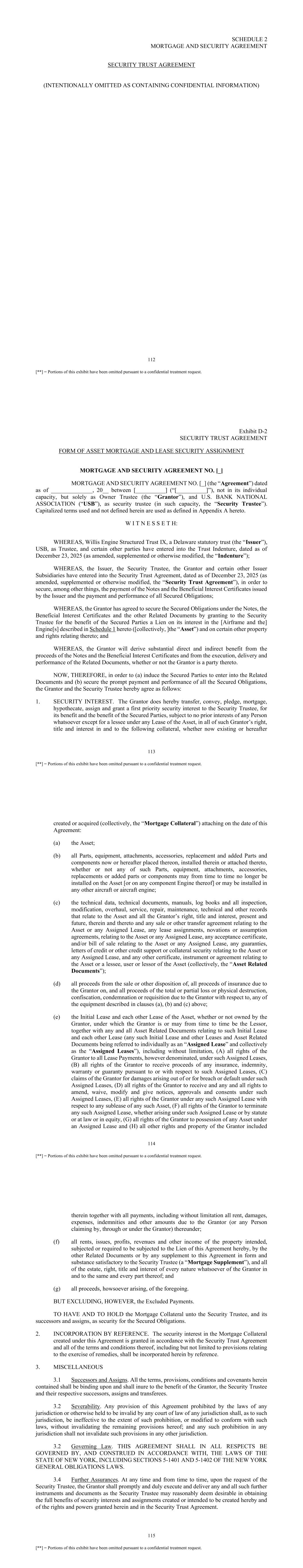 112 [**] = Portions of this exhibit have been omitted pursuant to a confidential treatment request. SCHEDULE 2 MORTGAGE AND SECURITY AGREEMENT SECURITY TRUST AGREEMENT (INTENTIONALLY OMITTED AS CONTAINING CONFIDENTIAL INFORMATION) 113 [**] = Portions of this exhibit have been omitted pursuant to a confidential treatment request. Exhibit D-2 SECURITY TRUST AGREEMENT FORM OF ASSET MORTGAGE AND LEASE SECURITY ASSIGNMENT MORTGAGE AND SECURITY AGREEMENT NO. [_] MORTGAGE AND SECURITY AGREEMENT NO. [_] (the “Agreement”) dated as of ______________, 20__ between [__________] (“[__________]”), not in its individual capacity, but solely as Owner Trustee (the “Grantor”), and U.S. BANK NATIONAL ASSOCIATION (“USB”), as security trustee (in such capacity, the “Security Trustee”). Capitalized terms used and not defined herein are used as defined in Appendix A hereto. W I T N E S S E T H: WHEREAS, Willis Engine Structured Trust IX, a Delaware statutory trust (the “Issuer”), USB, as Trustee, and certain other parties have entered into the Trust Indenture, dated as of December 23, 2025 (as amended, supplemented or otherwise modified, the “Indenture”); WHEREAS, the Issuer, the Security Trustee, the Grantor and certain other Issuer Subsidiaries have entered into the Security Trust Agreement, dated as of December 23, 2025 (as amended, supplemented or otherwise modified, the “Security Trust Agreement”), in order to secure, among other things, the payment of the Notes and the Beneficial Interest Certificates issued by the Issuer and the payment and performance of all Secured Obligations; WHEREAS, the Grantor has agreed to secure the Secured Obligations under the Notes, the Beneficial Interest Certificates and the other Related Documents by granting to the Security Trustee for the benefit of the Secured Parties a Lien on its interest in the [Airframe and the] Engine[s] described in Schedule 1 hereto ([collectively, ]the “Asset”) and on certain other property and rights relating thereto; and WHEREAS, the Grantor will derive substantial direct and indirect benefit from the proceeds of the Notes and the Beneficial Interest Certificates and from the execution, delivery and performance of the Related Documents, whether or not the Grantor is a party thereto. NOW, THEREFORE, in order to (a) induce the Secured Parties to enter into the Related Documents and (b) secure the prompt payment and performance of all the Secured Obligations, the Grantor and the Security Trustee hereby agree as follows: 1. SECURITY INTEREST. The Grantor does hereby transfer, convey, pledge, mortgage, hypothecate, assign and grant a first priority security interest to the Security Trustee, for its benefit and the benefit of the Secured Parties, subject to no prior interests of any Person whatsoever except for a lessee under any Lease of the Asset, in all of such Grantor’s right, title and interest in and to the following collateral, whether now existing or hereafter 114 [**] = Portions of this exhibit have been omitted pursuant to a confidential treatment request. created or acquired (collectively, the “Mortgage Collateral”) attaching on the date of this Agreement: (a) the Asset; (b) all Parts, equipment, attachments, accessories, replacement and added Parts and components now or hereafter placed thereon, installed therein or attached thereto, whether or not any of such Parts, equipment, attachments, accessories, replacements or added parts or components may from time to time no longer be installed on the Asset [or on any component Engine thereof] or may be installed in any other aircraft or aircraft engine; (c) the technical data, technical documents, manuals, log books and all inspection, modification, overhaul, service, repair, maintenance, technical and other records that relate to the Asset and all the Grantor’s right, title and interest, present and future, therein and thereto and any sale or other transfer agreement relating to the Asset or any Assigned Lease, any lease assignments, novations or assumption agreements, relating to the Asset or any Assigned Lease, any acceptance certificate, and/or bill of sale relating to the Asset or any Assigned Lease, any guaranties, letters of credit or other credit support or collateral security relating to the Asset or any Assigned Lease, and any other certificate, instrument or agreement relating to the Asset or a lessee, user or lessor of the Asset (collectively, the “Asset Related Documents”); (d) all proceeds from the sale or other disposition of, all proceeds of insurance due to the Grantor on, and all proceeds of the total or partial loss or physical destruction, confiscation, condemnation or requisition due to the Grantor with respect to, any of the equipment described in clauses (a), (b) and (c) above; (e) the Initial Lease and each other Lease of the Asset, whether or not owned by the Grantor, under which the Grantor is or may from time to time be the Lessor, together with any and all Asset Related Documents relating to such Initial Lease and each other Lease (any such Initial Lease and other Leases and Asset Related Documents being referred to individually as an “Assigned Lease” and collectively as the “Assigned Leases”), including without limitation, (A) all rights of the Grantor to all Lease Payments, however denominated, under such Assigned Leases, (B) all rights of the Grantor to receive proceeds of any insurance, indemnity, warranty or guaranty pursuant to or with respect to such Assigned Leases, (C) claims of the Grantor for damages arising out of or for breach or default under such Assigned Leases, (D) all rights of the Grantor to receive and any and all rights to amend, waive, modify and give notices, approvals and consents under such Assigned Leases, (E) all rights of the Grantor under any such Assigned Lease with respect to any sublease of any such Asset, (F) all rights of the Grantor to terminate any such Assigned Lease, whet