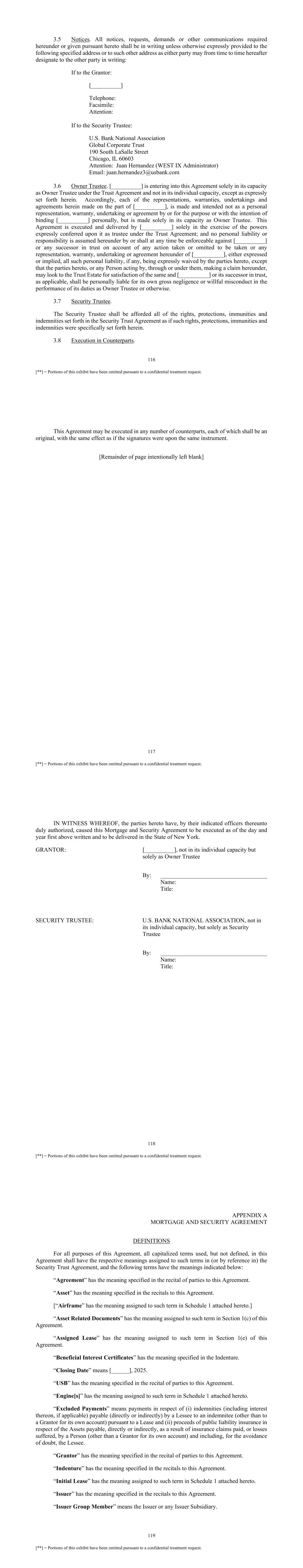 116 [**] = Portions of this exhibit have been omitted pursuant to a confidential treatment request. 3.5 Notices. All notices, requests, demands or other communications required hereunder or given pursuant hereto shall be in writing unless otherwise expressly provided to the following specified address or to such other address as either party may from time to time hereafter designate to the other party in writing: If to the Grantor: [__________] Telephone: Facsimile: Attention: If to the Security Trustee: U.S. Bank National Association Global Corporate Trust 190 South LaSalle Street Chicago, IL 60603 Attention: Juan Hernandez (WEST IX Administrator) Email: juan.hernandez3@usbank.com 3.6 Owner Trustee. [__________] is entering into this Agreement solely in its capacity as Owner Trustee under the Trust Agreement and not in its individual capacity, except as expressly set forth herein. Accordingly, each of the representations, warranties, undertakings and agreements herein made on the part of [__________], is made and intended not as a personal representation, warranty, undertaking or agreement by or for the purpose or with the intention of binding [__________] personally, but is made solely in its capacity as Owner Trustee. This Agreement is executed and delivered by [__________] solely in the exercise of the powers expressly conferred upon it as trustee under the Trust Agreement; and no personal liability or responsibility is assumed hereunder by or shall at any time be enforceable against [__________] or any successor in trust on account of any action taken or omitted to be taken or any representation, warranty, undertaking or agreement hereunder of [__________], either expressed or implied, all such personal liability, if any, being expressly waived by the parties hereto, except that the parties hereto, or any Person acting by, through or under them, making a claim hereunder, may look to the Trust Estate for satisfaction of the same and [__________] or its successor in trust, as applicable, shall be personally liable for its own gross negligence or willful misconduct in the performance of its duties as Owner Trustee or otherwise. 3.7 Security Trustee. The Security Trustee shall be afforded all of the rights, protections, immunities and indemnities set forth in the Security Trust Agreement as if such rights, protections, immunities and indemnities were specifically set forth herein. 3.8 Execution in Counterparts. 117 [**] = Portions of this exhibit have been omitted pursuant to a confidential treatment request. This Agreement may be executed in any number of counterparts, each of which shall be an original, with the same effect as if the signatures were upon the same instrument. [Remainder of page intentionally left blank] 118 [**] = Portions of this exhibit have been omitted pursuant to a confidential treatment request. IN WITNESS WHEREOF, the parties hereto have, by their indicated officers thereunto duly authorized, caused this Mortgage and Security Agreement to be executed as of the day and year first above written and to be delivered in the State of New York. GRANTOR: [__________], not in its individual capacity but solely as Owner Trustee By: ____________________________________ Name: Title: SECURITY TRUSTEE: U.S. BANK NATIONAL ASSOCIATION, not in its individual capacity, but solely as Security Trustee By: ____________________________________ Name: Title: 119 [**] = Portions of this exhibit have been omitted pursuant to a confidential treatment request. APPENDIX A MORTGAGE AND SECURITY AGREEMENT DEFINITIONS For all purposes of this Agreement, all capitalized terms used, but not defined, in this Agreement shall have the respective meanings assigned to such terms in (or by reference in) the Security Trust Agreement, and the following terms have the meanings indicated below: “Agreement” has the meaning specified in the recital of parties to this Agreement. “Asset” has the meaning specified in the recitals to this Agreement. [“Airframe” has the meaning assigned to such term in Schedule 1 attached hereto.] “Asset Related Documents” has the meaning assigned to such term in Section 1(c) of this Agreement. “Assigned Lease” has the meaning assigned to such term in Section 1(e) of this Agreement. “Beneficial Interest Certificates” has the meaning specified in the Indenture. “Closing Date” means [______], 2025. “USB” has the meaning specified in the recital of parties to this Agreement. “Engine[s]” has the meaning assigned to such term in Schedule 1 attached hereto. “Excluded Payments” means payments in respect of (i) indemnities (including interest thereon, if applicable) payable (directly or indirectly) by a Lessee to an indemnitee (other than to a Grantor for its own account) pursuant to a Lease and (ii) proceeds of public liability insurance in respect of the Assets payable, directly or indirectly, as a result of insurance claims paid, or losses suffered, by a Person (other than a Grantor for its own account) and including, for the avoidance of doubt, the Lessee. “Grantor” has the meaning specified in the recital of parties to this Agreement. “Indenture” has the meaning specified in the recitals to this Agreement. “Initial Lease” has the meaning assigned to such term in Schedule 1 attached hereto. “Issuer” has the meaning specified in the recitals to this Agreement. “Issuer Group Member” means the Issuer or any Issuer Subsidiary.