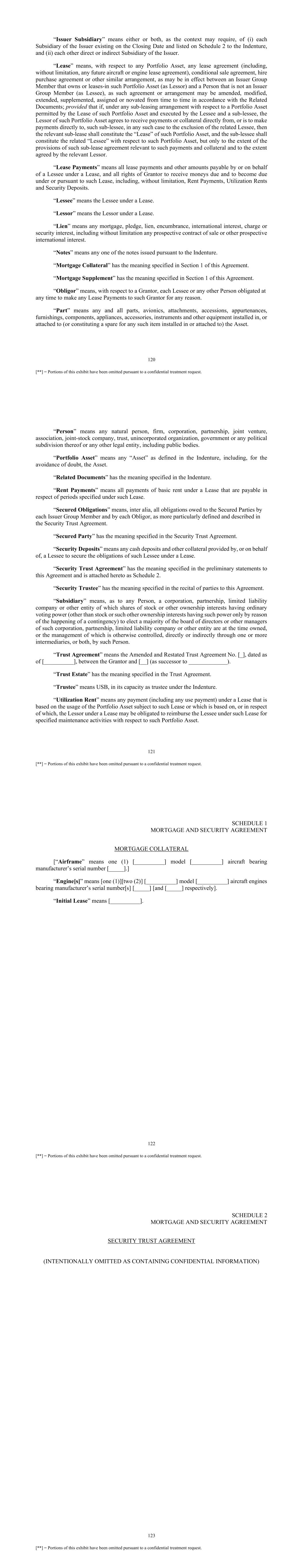 120 [**] = Portions of this exhibit have been omitted pursuant to a confidential treatment request. “Issuer Subsidiary” means either or both, as the context may require, of (i) each Subsidiary of the Issuer existing on the Closing Date and listed on Schedule 2 to the Indenture, and (ii) each other direct or indirect Subsidiary of the Issuer. “Lease” means, with respect to any Portfolio Asset, any lease agreement (including, without limitation, any future aircraft or engine lease agreement), conditional sale agreement, hire purchase agreement or other similar arrangement, as may be in effect between an Issuer Group Member that owns or leases-in such Portfolio Asset (as Lessor) and a Person that is not an Issuer Group Member (as Lessee), as such agreement or arrangement may be amended, modified, extended, supplemented, assigned or novated from time to time in accordance with the Related Documents; provided that if, under any sub-leasing arrangement with respect to a Portfolio Asset permitted by the Lease of such Portfolio Asset and executed by the Lessee and a sub-lessee, the Lessor of such Portfolio Asset agrees to receive payments or collateral directly from, or is to make payments directly to, such sub-lessee, in any such case to the exclusion of the related Lessee, then the relevant sub-lease shall constitute the “Lease” of such Portfolio Asset, and the sub-lessee shall constitute the related “Lessee” with respect to such Portfolio Asset, but only to the extent of the provisions of such sub-lease agreement relevant to such payments and collateral and to the extent agreed by the relevant Lessor. “Lease Payments” means all lease payments and other amounts payable by or on behalf of a Lessee under a Lease, and all rights of Grantor to receive moneys due and to become due under or pursuant to such Lease, including, without limitation, Rent Payments, Utilization Rents and Security Deposits. “Lessee” means the Lessee under a Lease. “Lessor” means the Lessor under a Lease. “Lien” means any mortgage, pledge, lien, encumbrance, international interest, charge or security interest, including without limitation any prospective contract of sale or other prospective international interest. “Notes” means any one of the notes issued pursuant to the Indenture. “Mortgage Collateral” has the meaning specified in Section 1 of this Agreement. “Mortgage Supplement” has the meaning specified in Section 1 of this Agreement. “Obligor” means, with respect to a Grantor, each Lessee or any other Person obligated at any time to make any Lease Payments to such Grantor for any reason. “Part” means any and all parts, avionics, attachments, accessions, appurtenances, furnishings, components, appliances, accessories, instruments and other equipment installed in, or attached to (or constituting a spare for any such item installed in or attached to) the Asset. 121 [**] = Portions of this exhibit have been omitted pursuant to a confidential treatment request. “Person” means any natural person, firm, corporation, partnership, joint venture, association, joint-stock company, trust, unincorporated organization, government or any political subdivision thereof or any other legal entity, including public bodies. “Portfolio Asset” means any “Asset” as defined in the Indenture, including, for the avoidance of doubt, the Asset. “Related Documents” has the meaning specified in the Indenture. “Rent Payments” means all payments of basic rent under a Lease that are payable in respect of periods specified under such Lease. “Secured Obligations” means, inter alia, all obligations owed to the Secured Parties by each Issuer Group Member and by each Obligor, as more particularly defined and described in the Security Trust Agreement. “Secured Party” has the meaning specified in the Security Trust Agreement. “Security Deposits” means any cash deposits and other collateral provided by, or on behalf of, a Lessee to secure the obligations of such Lessee under a Lease. “Security Trust Agreement” has the meaning specified in the preliminary statements to this Agreement and is attached hereto as Schedule 2. “Security Trustee” has the meaning specified in the recital of parties to this Agreement. “Subsidiary” means, as to any Person, a corporation, partnership, limited liability company or other entity of which shares of stock or other ownership interests having ordinary voting power (other than stock or such other ownership interests having such power only by reason of the happening of a contingency) to elect a majority of the board of directors or other managers of such corporation, partnership, limited liability company or other entity are at the time owned, or the management of which is otherwise controlled, directly or indirectly through one or more intermediaries, or both, by such Person. “Trust Agreement” means the Amended and Restated Trust Agreement No. [_], dated as of [__________], between the Grantor and [__] (as successor to _____________). “Trust Estate” has the meaning specified in the Trust Agreement. “Trustee” means USB, in its capacity as trustee under the Indenture. “Utilization Rent” means any payment (including any use payment) under a Lease that is based on the usage of the Portfolio Asset subject to such Lease or which is based on, or in respect of which, the Lessor under a Lease may be obligated to reimburse the Lessee under such Lease for specified maintenance activities with respect to such Portfolio Asset. 122 [**] = Portions of this exhibit have been omitted pursuant to a confidential treatment request. SCHEDULE 1 MORTGAGE AND SECURITY AGREEMENT MORTGAGE COLLATERAL [“Airframe” means one (1) [__________] model [__________] aircraft bearing manufacturer’s serial number [_____].] “Engine[s]” means [one (1)][two (2)] [__________] model [__________] aircraft engines bearing manufacturer’s serial number[s
