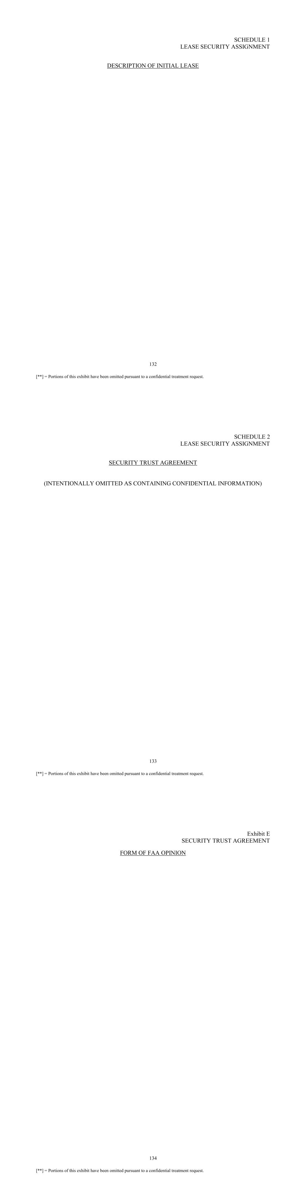 132 [**] = Portions of this exhibit have been omitted pursuant to a confidential treatment request. SCHEDULE 1 LEASE SECURITY ASSIGNMENT DESCRIPTION OF INITIAL LEASE 133 [**] = Portions of this exhibit have been omitted pursuant to a confidential treatment request. SCHEDULE 2 LEASE SECURITY ASSIGNMENT SECURITY TRUST AGREEMENT (INTENTIONALLY OMITTED AS CONTAINING CONFIDENTIAL INFORMATION) 134 [**] = Portions of this exhibit have been omitted pursuant to a confidential treatment request. Exhibit E SECURITY TRUST AGREEMENT FORM OF FAA OPINION