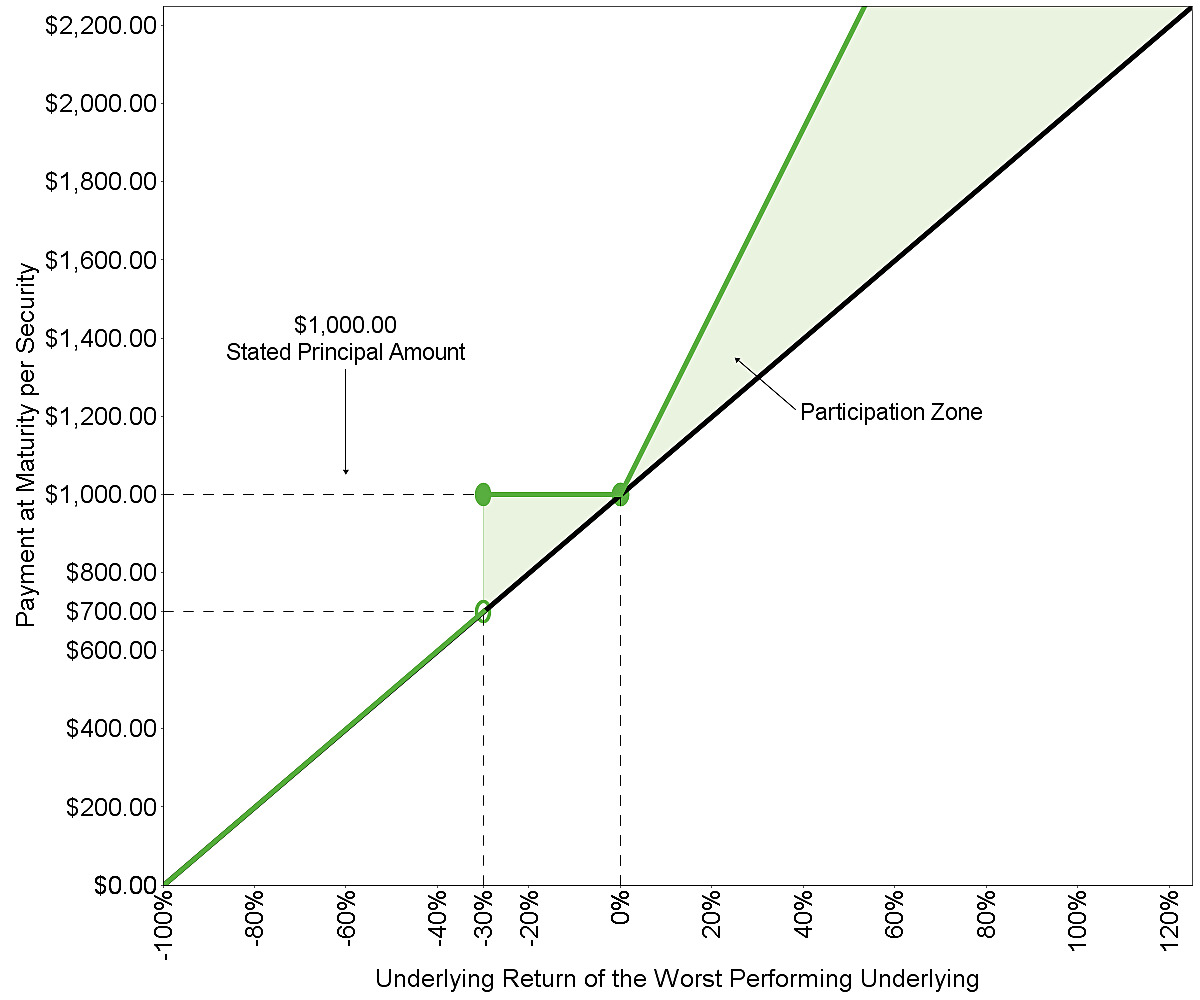 The diagram below illustrates your payment at maturity of the securities, assuming the securities have not previously been automatically redeemed, for a range of hypothetical underlying returns of the worst performing underlying. Your payment at maturity (if the securities are not earlier automatically redeemed) will be determined based solely on the performance of the worst performing underlying on the final valuation date.
