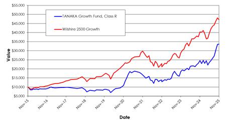 Comparison of the Growth of a $10,000 Investment in the TANAKA Growth Fund, Class R and the Wilshire 2500 Growth Index