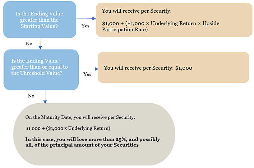 If the Securities are not automatically called, then on the Maturity Date, you will be entitled to receive a cash payment per Security in U.S. dollars equal to the Maturity Payment Amount. The “Maturity Payment Amount” per Security will equal: • if the Ending Value is greater than the Starting Value: $1,000 + ($1,000 × Underlying Return × Upside Participation Rate); • if the Ending Value is less than or equal to the Starting Value, but greater than or equal to the Threshold Value: $1,000; or • if the Ending Value is less than the Threshold Value: $1,000 + ($1,000 × Underlying Return) |