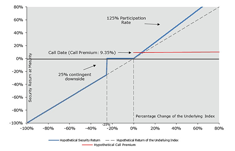 Because the hypothetical closing level of the Underlying on the Call Date is greater than the hypothetical Starting Value, the Securities are automatically called on the Call Date and you will receive on the Call Settlement Date the principal amount of your Securities plus a Call Premium of 9.35% of the principal amount. Even though the Underlying appreciated by 25.00% from the Starting Value to its closing level on the Call Date in this example, your return is limited to the Call Premium of 9.35%.