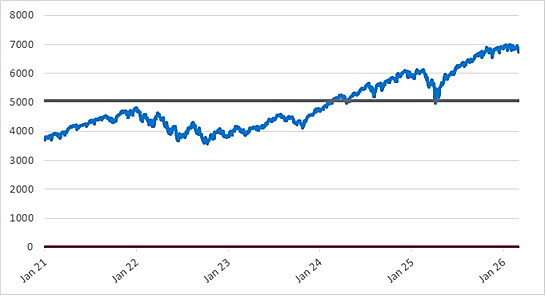 The following graph sets forth the daily historical performance of the SPX in the period from January 2, 2021 through March 6, 2026. We obtained this historical data from Bloomberg L.P. We have not independently verified the accuracy or completeness of the information obtained from Bloomberg L.P. The horizontal line in the graph represents the SPX’s hypothetical Threshold Value of 5,055.015, which is 75% of the SPX’s hypothetical Starting Value of 6,740.02, which was its closing level on March 6, 2026. The actual Starting Value and Threshold Value will be determined on the Pricing Date.