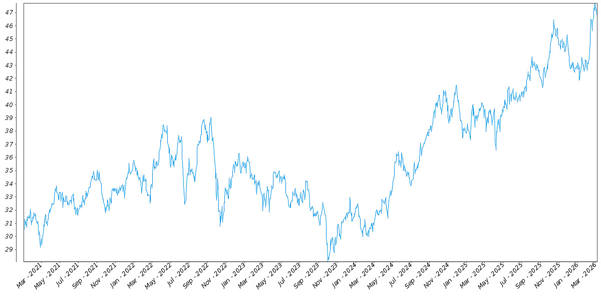 The following graph sets forth the daily historical performance of the XLU in the period from January 2, 2021 through the pricing date. We obtained this historical data from Bloomberg L.P. We have not independently verified the accuracy or completeness of the information obtained from Bloomberg L.P. On the pricing date, the Closing Market Price of the XLU was $46.74.
