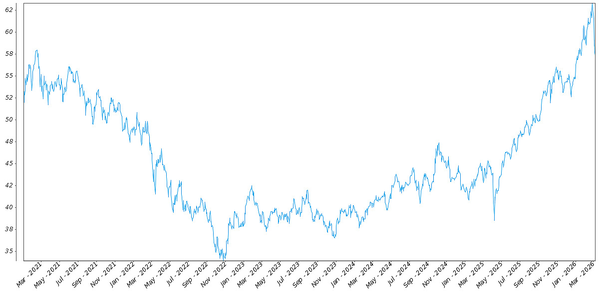 The following graph sets forth the daily historical performance of the EEM in the period from January 2, 2021 through the pricing date. We obtained this historical data from Bloomberg L.P. We have not independently verified the accuracy or completeness of the information obtained from Bloomberg L.P. On the pricing date, the Closing Market Price of the EEM was $57.32.
