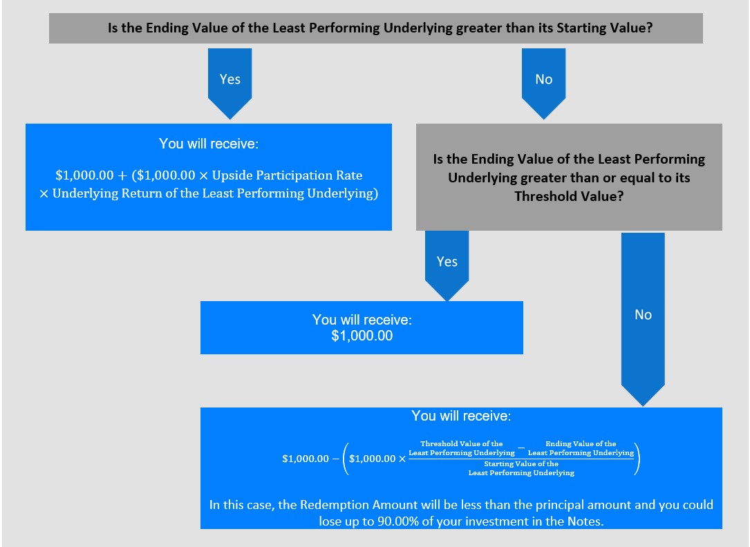 The following table is for purposes of illustration only. It is based on hypothetical values and shows hypothetical returns on the Notes. The table illustrates the calculation of the Redemption Amount and the return on the Notes based on a hypothetical Starting Value of 100 for the Least Performing Underlying, a hypothetical Threshold Value of 90 for the Least Performing Underlying, the Upside Participation Rate of 136.00% and a range of hypothetical Ending Values of the Least Performing Underlying. The actual amount you receive and the resulting return will depend on the actual Starting Values, Threshold Values and Ending Values of the Underlyings, and whether you hold the Notes to maturity. The following examples do not take into account any tax consequences from investing in the Notes.